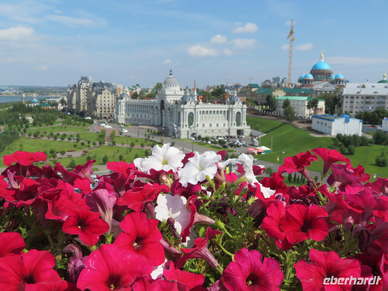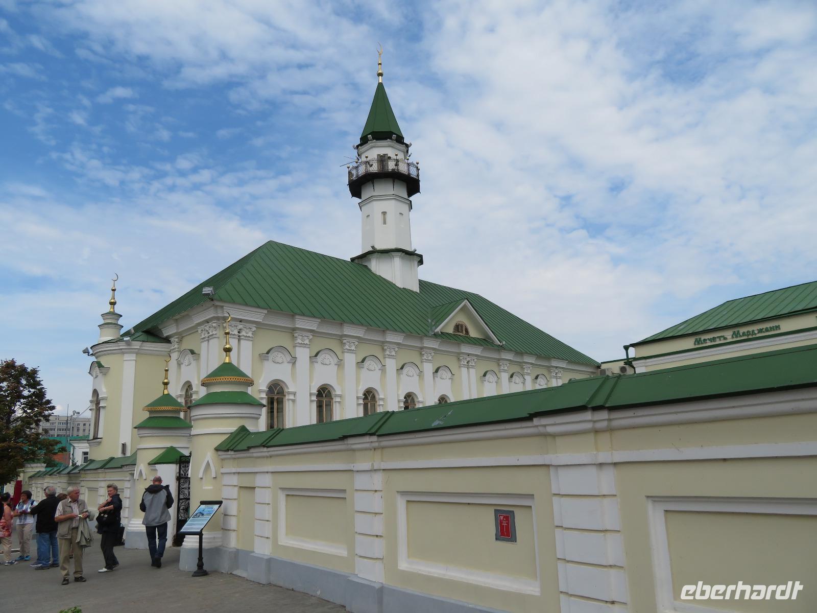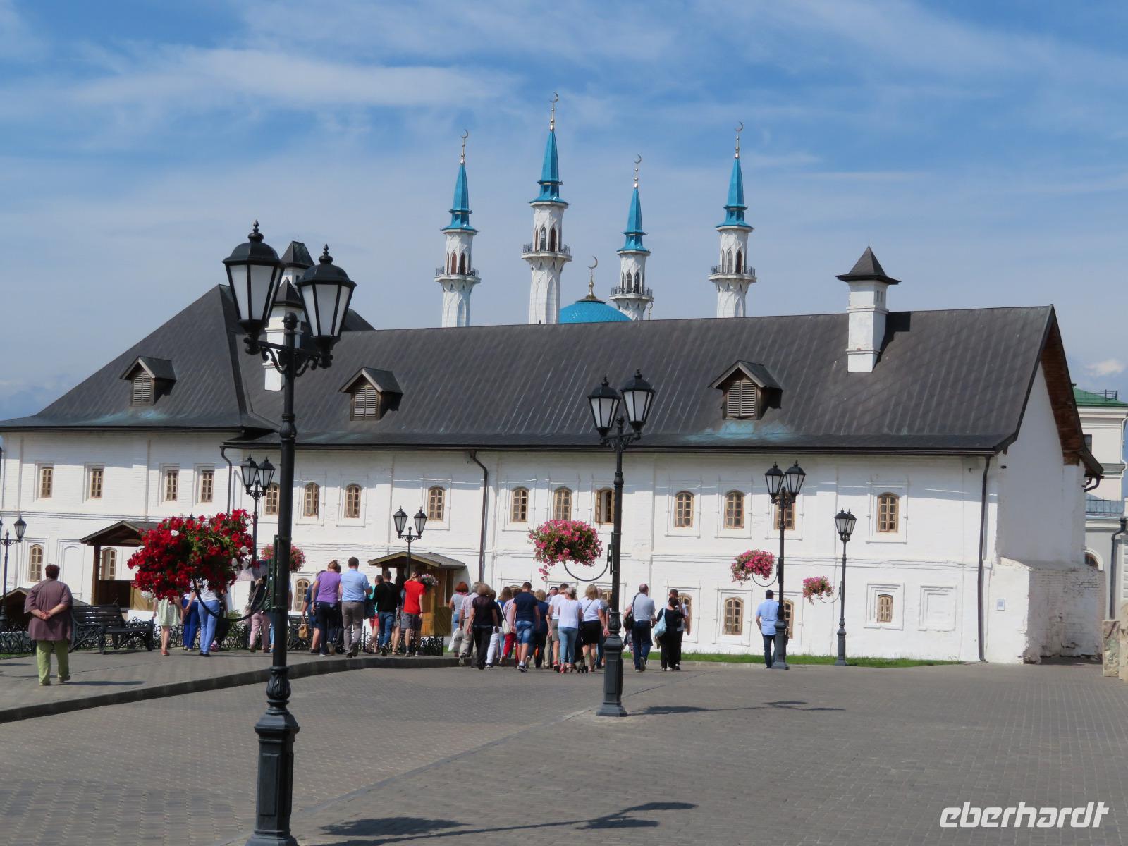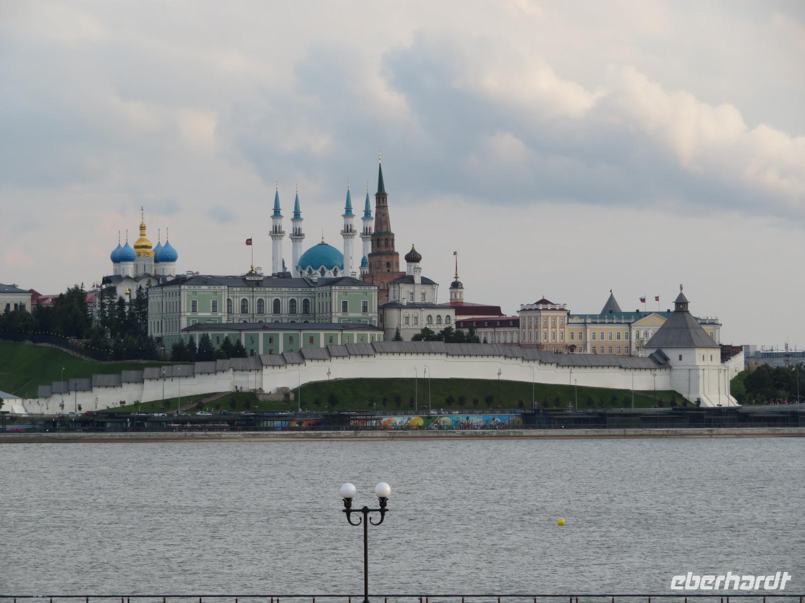 Im alten tatarischen Viertel südlich des Wildschweinsee machten wir unseren ersten Stopp: bunte Holzhäuser künden von den tatarischen Bautraditionen. In der durch Katharina II. inspirierten alten tatarischen Moschee - ein klassizistisches Gebäude mit Minarett - besichtigen wir die Gebetsräume. Durch die wesentlichen Straßen der Stadt, an der Universität mit dem jungen Lenin vorbei, erreichten wir den Kasaner Kreml. Von einer weißen Mauer umrundet sind Maria-Verkündigungskirche, klassizistische Gebäuden der Administration und der Galerie Tatarstans, Reste eines ehemaligen Klosters, der heutige Präsidentenpalast und eine der größten Moscheen außerhalb eines arabisch-muslimischen Landes. Weißer Marmor, leuchtend blaue Kuppeln und vier große Minarette machen die Moschee zu einer Dominante des Stadtbildes. Die Ausblicke vom Kreml auf die Stadt mit ihren Universiade-Schwimm- und Fussball-Weltmeisterschaftsbauten an der Kasanka offerierten uns eine helle und überaus saubere Stadt. Vor dem Mittagessen machten wir noch einen Stopp am Binnenhafen mit Blick auf den Zusammenfluss von Kasanka und Wolga. Nach dem Mittagessen hatte jeder die Möglichkeit über den fast durchgehend rekonstruierten Baumann-Boulevard mit jugendlicher Betriebsamkeit zu bummeln.