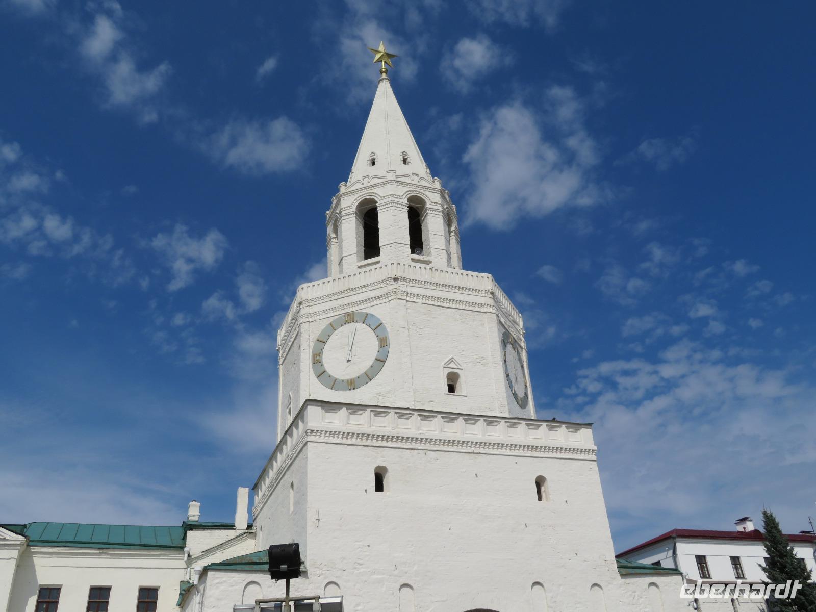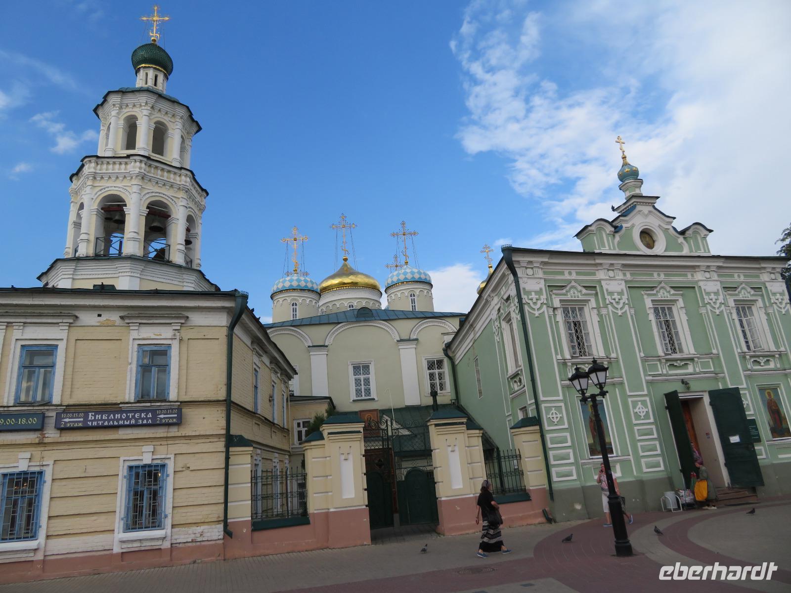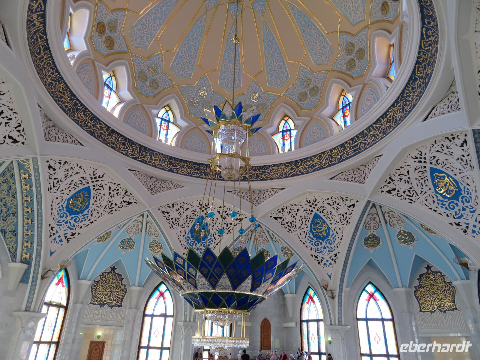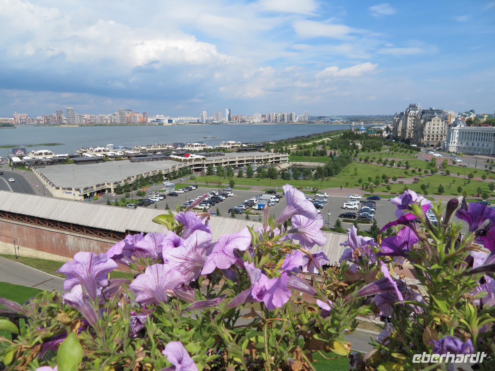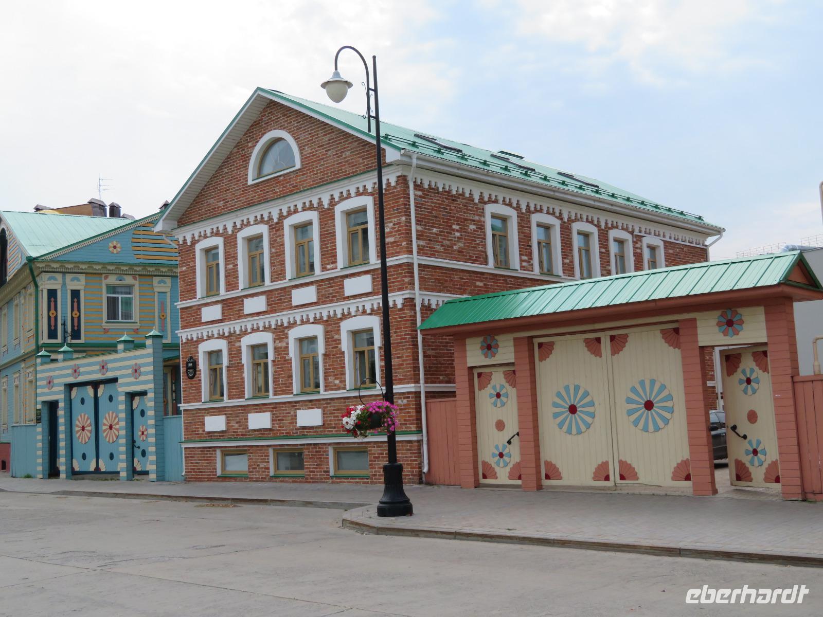 Im alten tatarischen Viertel südlich des Wildschweinsee machten wir unseren ersten Stopp: bunte Holzhäuser künden von den tatarischen Bautraditionen. In der durch Katharina II. inspirierten alten tatarischen Moschee - ein klassizistisches Gebäude mit Minarett - besichtigen wir die Gebetsräume. Durch die wesentlichen Straßen der Stadt, an der Universität mit dem jungen Lenin vorbei, erreichten wir den Kasaner Kreml. Von einer weißen Mauer umrundet sind Maria-Verkündigungskirche, klassizistische Gebäuden der Administration und der Galerie Tatarstans, Reste eines ehemaligen Klosters, der heutige Präsidentenpalast und eine der größten Moscheen außerhalb eines arabisch-muslimischen Landes. Weißer Marmor, leuchtend blaue Kuppeln und vier große Minarette machen die Moschee zu einer Dominante des Stadtbildes. Die Ausblicke vom Kreml auf die Stadt mit ihren Universiade-Schwimm- und Fussball-Weltmeisterschaftsbauten an der Kasanka offerierten uns eine helle und überaus saubere Stadt. Vor dem Mittagessen machten wir noch einen Stopp am Binnenhafen mit Blick auf den Zusammenfluss von Kasanka und Wolga. Nach dem Mittagessen hatte jeder die Möglichkeit über den fast durchgehend rekonstruierten Baumann-Boulevard mit jugendlicher Betriebsamkeit zu bummeln.