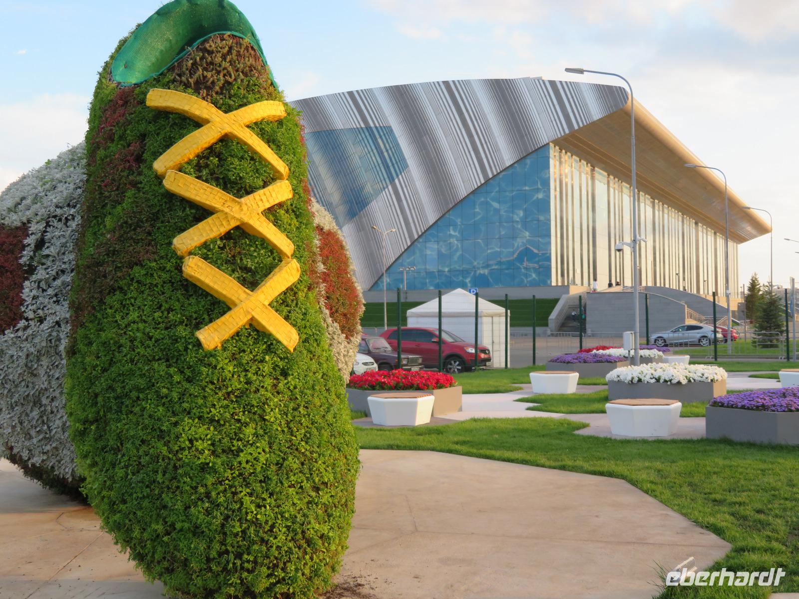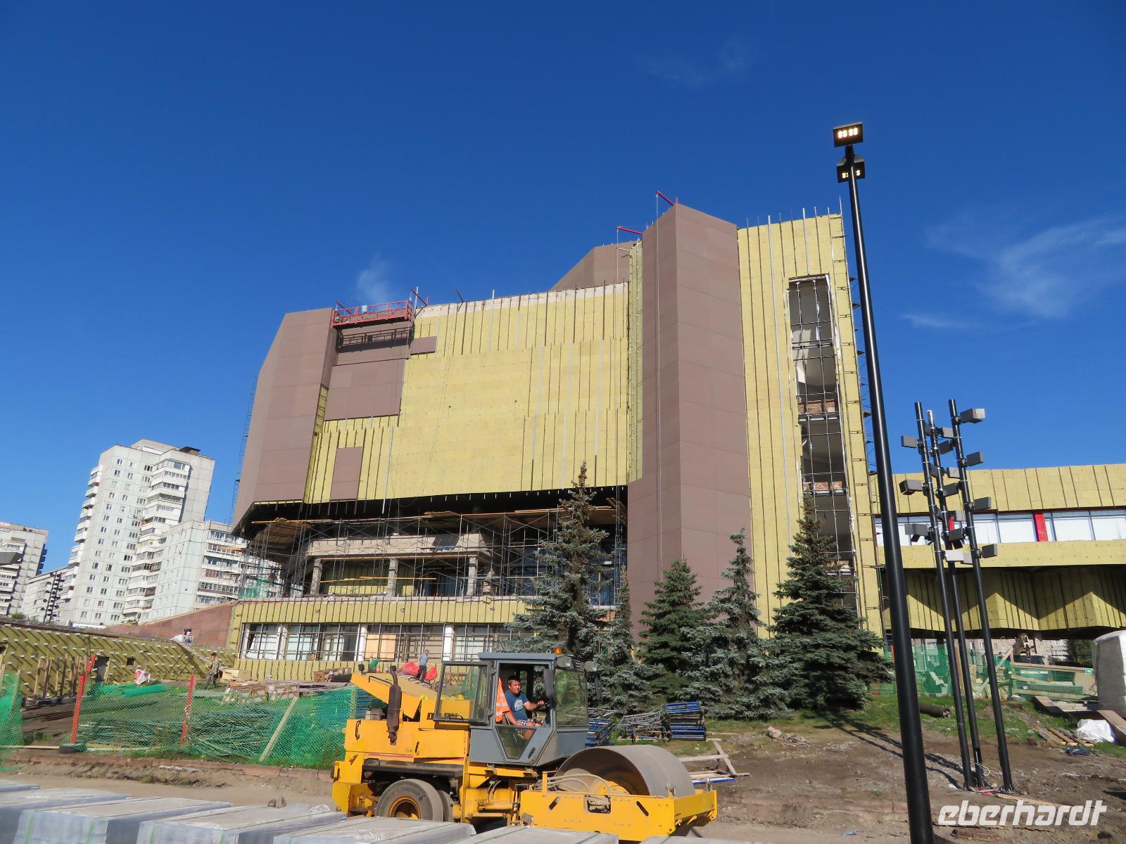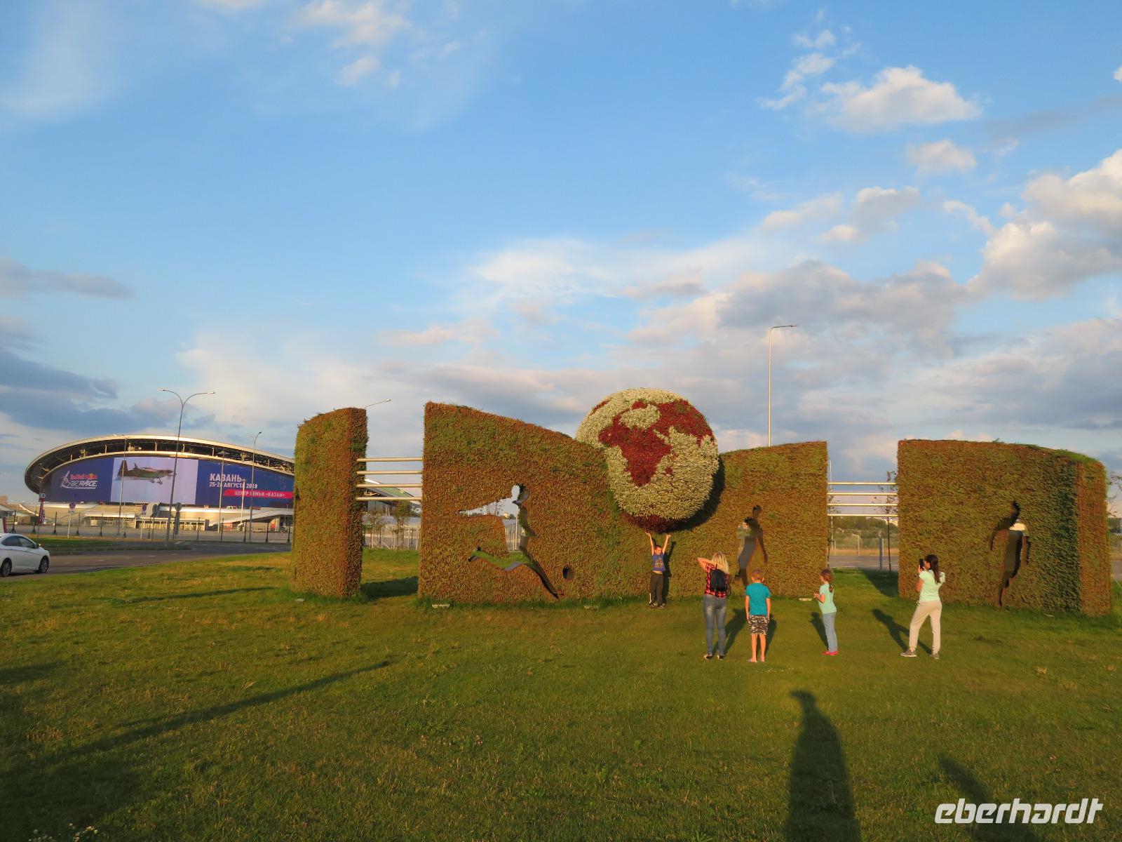 Zum späten Nachmittag fuhren wir auf die andere Seite der Kasanka zum „Kessel", dem Standesamt der Stadt, von wo wir einen spätnachmittäglichen Blick auf die Stadtsilhouette genossen. Durch die modernen Schlafstätte Kasans mit einem Stopp am Fussball-WM-Stadion erreichten wir unsere Restaurant „Kreuzung des Jazz", wo wir mit Swing-Live zu Abend aßen.