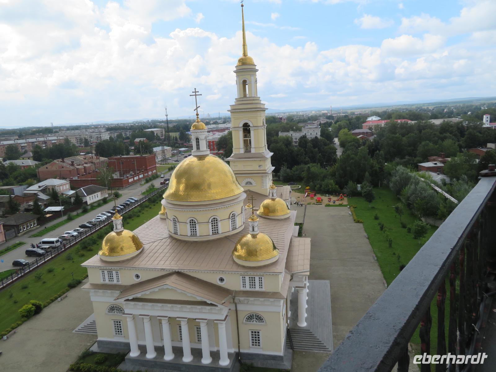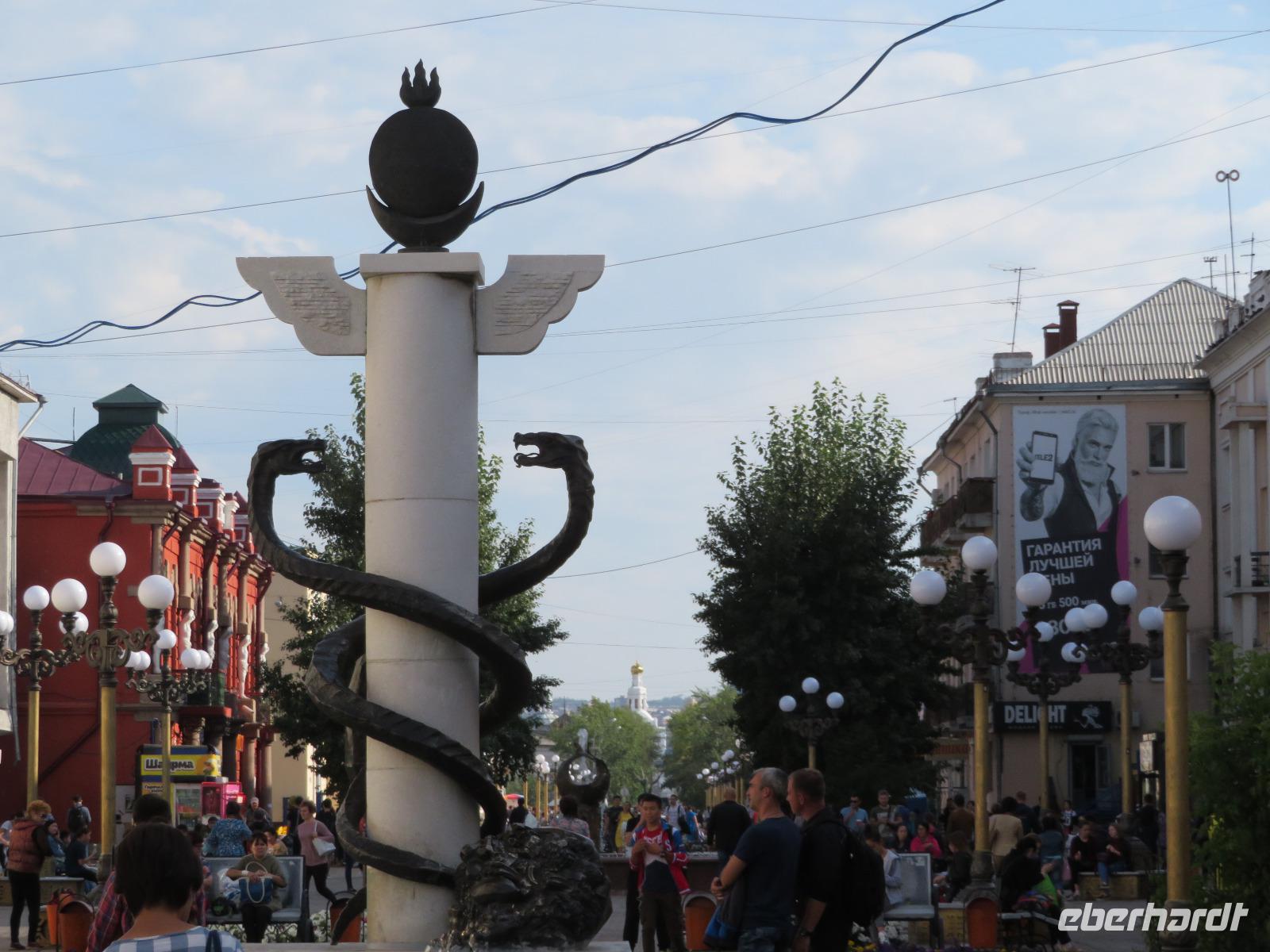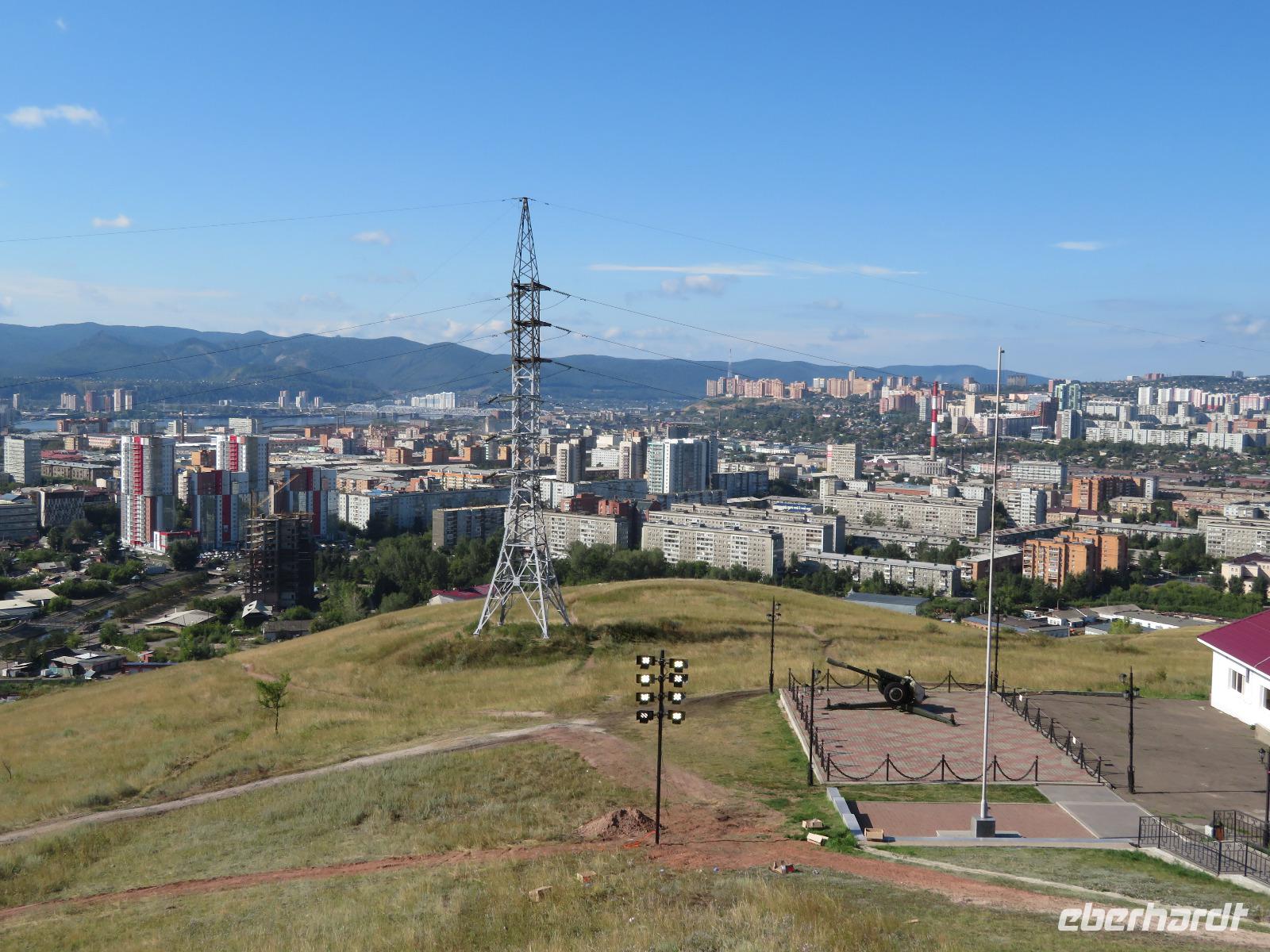 Am Vormittag fahr-bummelten wir durch die großen Straßen der Innenstadt, die mit ihren teilweise noch aus dem 19.und beginnenden 20. Jahrhundert (Jugendstil) erhaltenen Häusern einen freundlichen und sauberen Eindruck macht. Vom Ufer des Jenissei mit 10-Rubel-Schein-Brücke und Kulturbauten aus der sowjetischen Zeit bummelten wir zum Gründungsort der Stadt 1628, zum Ausblick an der Medizinischen Fakultät und später zur kleinen Kapelle am nördlichen Hügel der Stadt. Abschluss am Prospekt Mira mit einer Visite der Apotheke, deren Regalierung wohl mehr als einhundert Jahre zurück liegt. Überall im Stadtbild werden Fusswege und Plätze gepflastert - die Winteruniversiade 2019 wirft ihre Schatten voraus. Im Straßen- und Wohnungsbau glaubt man, sei die Phase des schmerzhaften Übergangs vom einst gewinnnbringenden Schwermaschinenbau zu neuen Industriezweigen überwunden - aber produzieren Einkaufskomplexe („Komsomoll" - was für eine Anspielung, wenn auch darin das amerikanische Mall steckt) tatsächlich BIP?