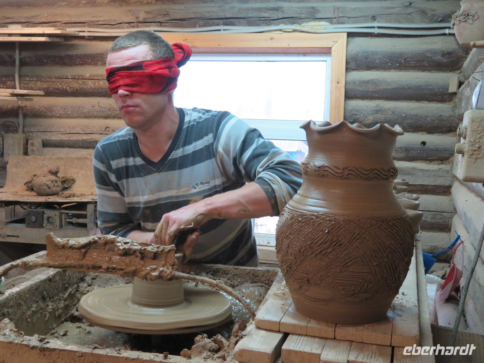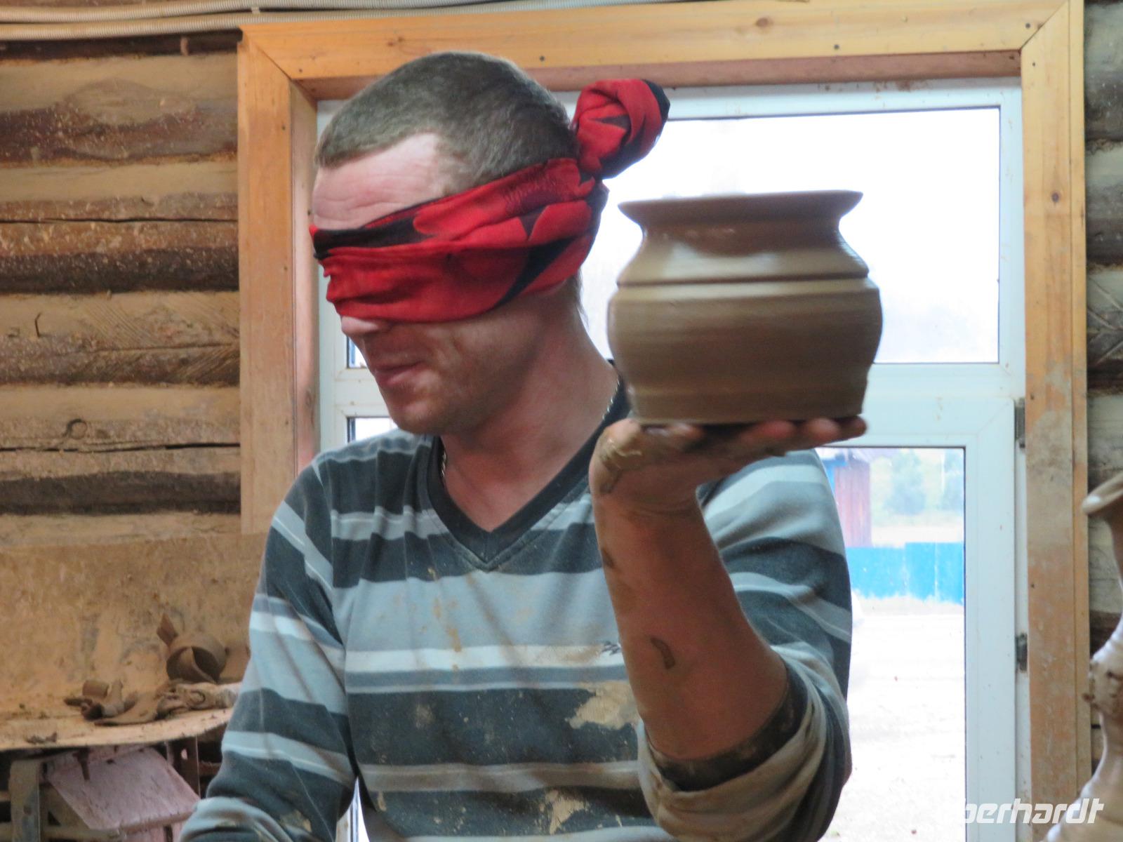 Noch heute wird in Nefyansk, wenn auch vermindert, Eisen gegossen; aber auch in der Umgebung Gold gefunden. Vor mehr als dreihundert Jahren stand die Eisenmetallurgie im Blickpunkt Peters I., der quasi hier den ersten ersten Oligarchen Russlands, Demidov, förderte. Im ehemaligen metallurgischen Areal in Nevyansk bestiegen wir den mit 2,20 Meter Abweichung geneigten Turm und ließen uns weiteres über die Bergbautradition und Legenden über Demidov erzählen. Am Nachmittag fuhren wir durch Byngy und konnten eine der wenigen auch zur Sowjetzeit aktiven Kirchen sehen - die Kirche des Heiligen Nikolaus. Leider findet sich zu deren Erhaltung nunmehr kein Sponsor; enthält sie doch zahlreiche alte Ikonen. Unser späteres Ziel lag in einem der recht freundlich wirkenden Dörfer mit hübschen Holzhäusern inmitten der Urallandschaft am Fluss Nejwa: eine Töpferei. Vor dem Eintritt erfreuten wir uns mit einem Schluck vom „Goldenen Zaren" unseres Aufenthaltes im Ural. In der Töpferei wollte keiner selbst die Töpferscheibe drehen, aber von Alexander, dem hiesigen Junior-Töpfer, erfuhren wir anschaulich wie aus der braungrauen Masse vom Nejwa-Fluss Töpferwaren entstehen. Am Abend erreichten wir unser Hotel in Jekaterinburg.