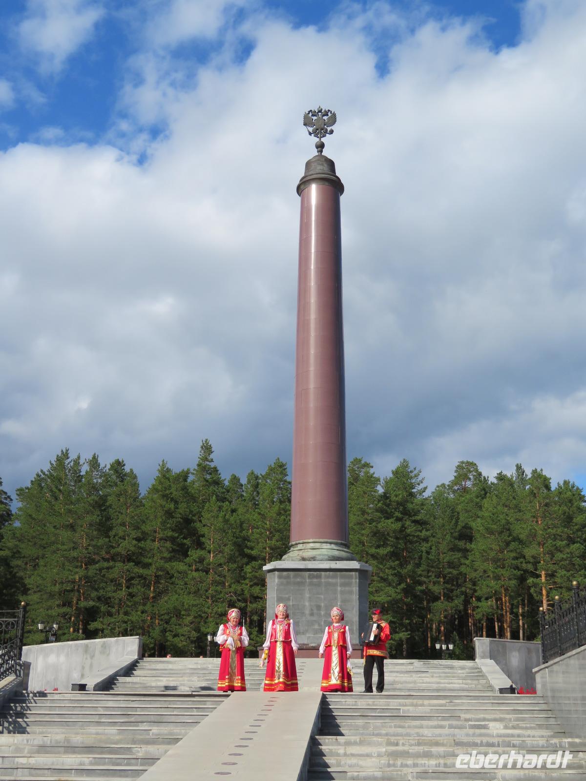 An Stelle des Ipatjew-Hauses, wo die Familie des russischen Zaren am 17. Juli 1918 ermordet wurde, steht heute die „Blutskirche", die wir anschließend besichtigten. Das Ipatjew-Haus ließ Jelzin einst abreißen und als Wiedergutmachung initiierte er den Bau der Kirche auf dem Blute. Ein Folgestopp führte uns zum einstigen Gründungsort der ersten Festung von Jekaterinburg, das Peter I. als Kontrapunkt zum Reich des Demidov errichten ließ. Interessant folgend ein Stopp am Denkmal für die gefallenen sowjetischen und russischen Soldaten in den Kriegen der „Nachkriegszeit" - meist denkt man nur an Afghanistan und Tschetschenien, aber die Orte für „sowjetische Militärberater" verteilen sich fast weltweit. Nach dem Mittagessen im Hotel Park Inn fuhren wir am Nachmittag Richtung Westen zurück nach Europa. Im Wald wurden wir an ein schreckliches Kapitel der opferreichen, russischen Geschichte erinnert: der Memorialkomplex zur Erinnerung an die Opfer des stalinschen Terrors - endlich wieder gepflegt und durch ein neues Denkmal des Bildhauers Nejiswestnij ergänzt. Großer musikalischer Empfang durch ein Ensemble und Fototermin dann am Denkmal der europäisch-asiatischen Grenze. Diesen einmaligen Moment begossen wir mit russischem Sekt. Zur späten sonntäglichen Teezeit erreichten wir ein dörfliches Holzhaus für Besichtigung von Haus und Garten; natürlich mit Tee und Blinys.