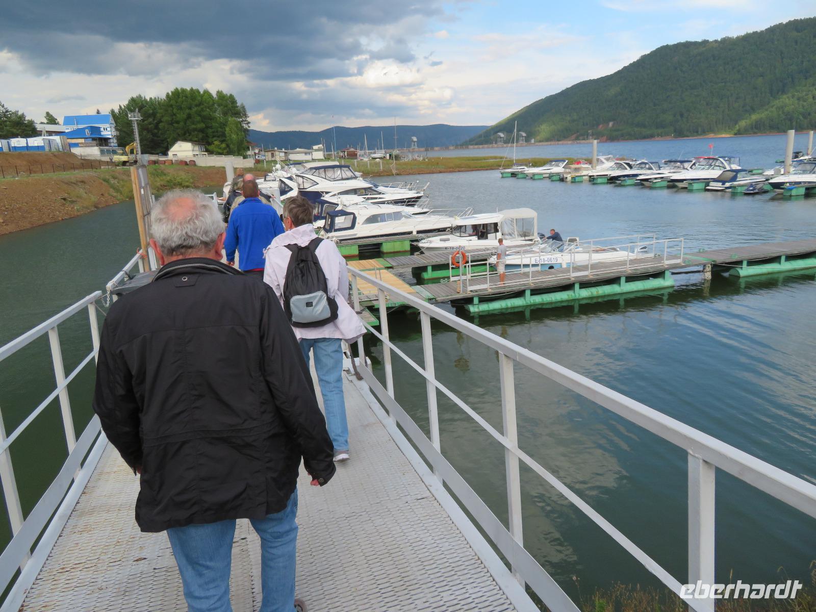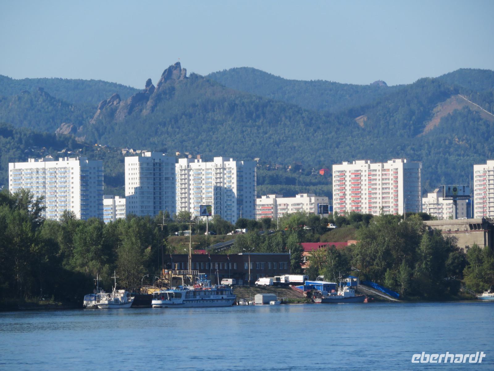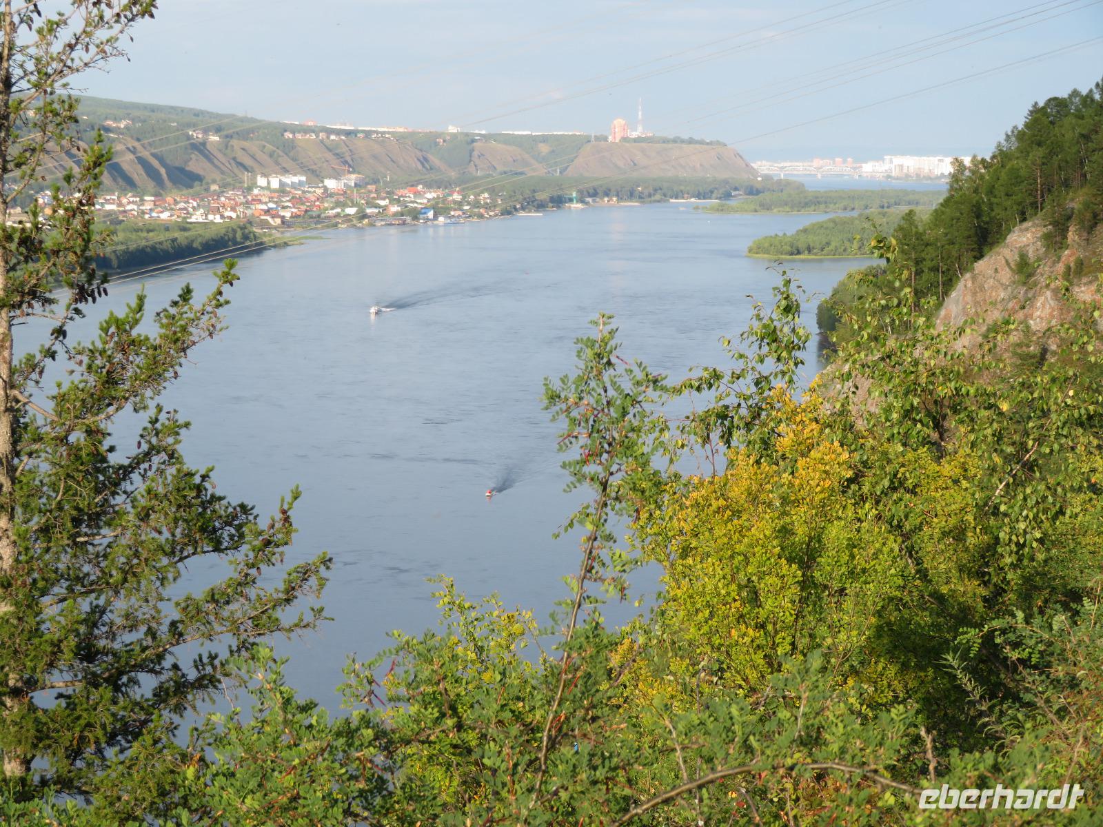 Nach dem mitternächtlichen Start zur Zugfahrt schliefen oder besser dösten alle doch recht lange; Frühstück gab es im benachbarten Wagon-Restaurant. Gegen Mittag erreichten wir Krasnojarsk am Jenissei, wo uns Galina abholte. Die Straßen der kommunistischen Dreieinigkeit von Lenin, Marx und Frieden befahrend, gelangten wir zum ukrainischen Mittagsrestaurant mit grünem Salat, großer Menge Pelmeni und dann noch gegrillten Schweinslendchen. Der Bus brachte uns aus der Stadt in eine bergige Landschaft mit dem Naturpark Stolby zur Linken und bald Felswänden am gegenüberliegenden Ufer des Jenissei. An der Staumauer mit einer Schiffshebeanlage vorbei erreichten wir am Urlauberstandort Admiral den Staubeginn des über 300 Kilometer langen Stausees. Von hier unternahmen wir mit drei Motorbooten einen Ausflug auf dem Stausee zunächst zur Staumauer und dann noch in eine Bucht des Jenissei mit schon kaum zu durchdringender Taiga. In diesem, einst völlig abgesperrten Gelände war im Anblick der entstehenden Ausflugsobjekte für die sich entwickelnde russische Mittelschicht zu erkennen, welche enormen Veränderungen in der Mentalität und auch in den Besitzverhältnissen der Menschen vor sich gehen. Auf unserem Rückweg stoppten wir noch an der „trockenen" Seite der Staumauer und genossen vom „Zar- Fisch-Felsen" oberhalb des Jenissei eine tolle Aussicht und nebenbei den Fototermin einer kirgisischen Hochzeit. Abendessen dann in einem Stadtrestaurant, benannt nach einem im 19. Jahrhundert zu Wohlstand gekommenen Gold-Sucher mit hervorragendem Fischgericht. Wie in den vergangenen Jahren war auch dieser Tag in Krasnojarsk ein Tag der Völlerei und der Landschaftseindrücke.