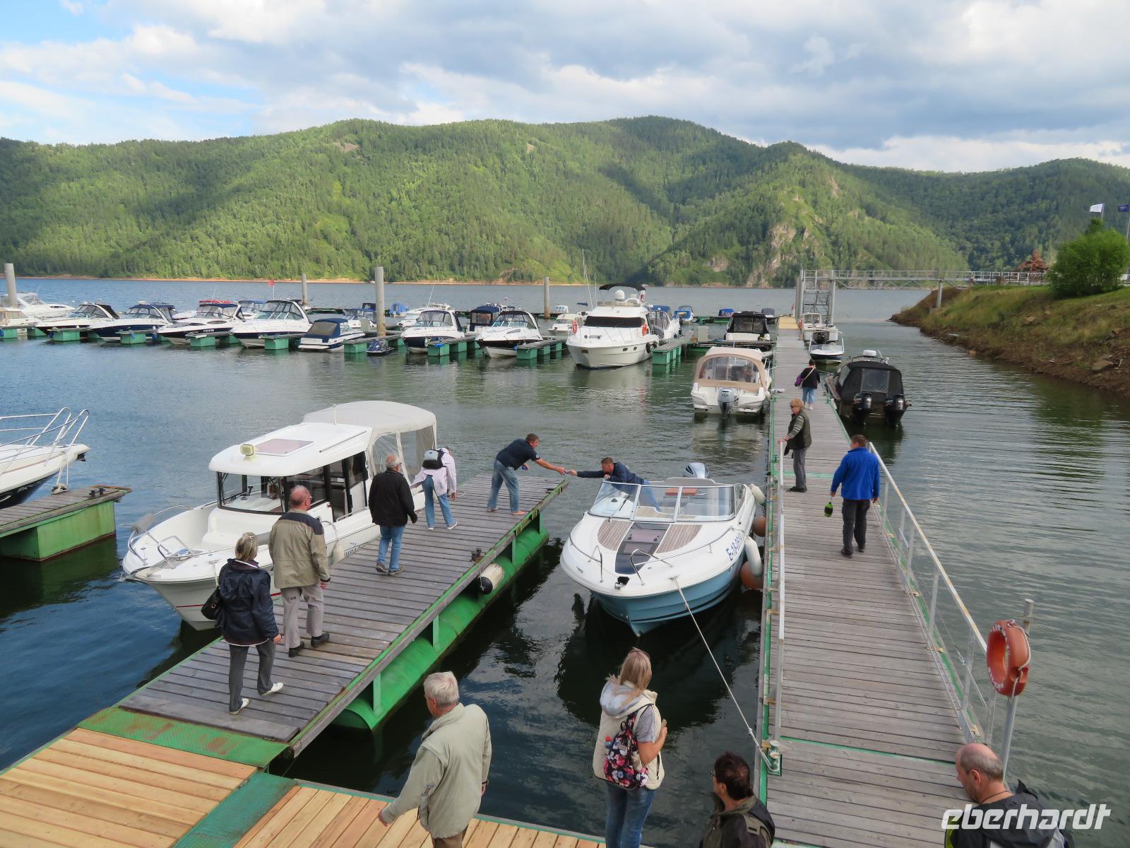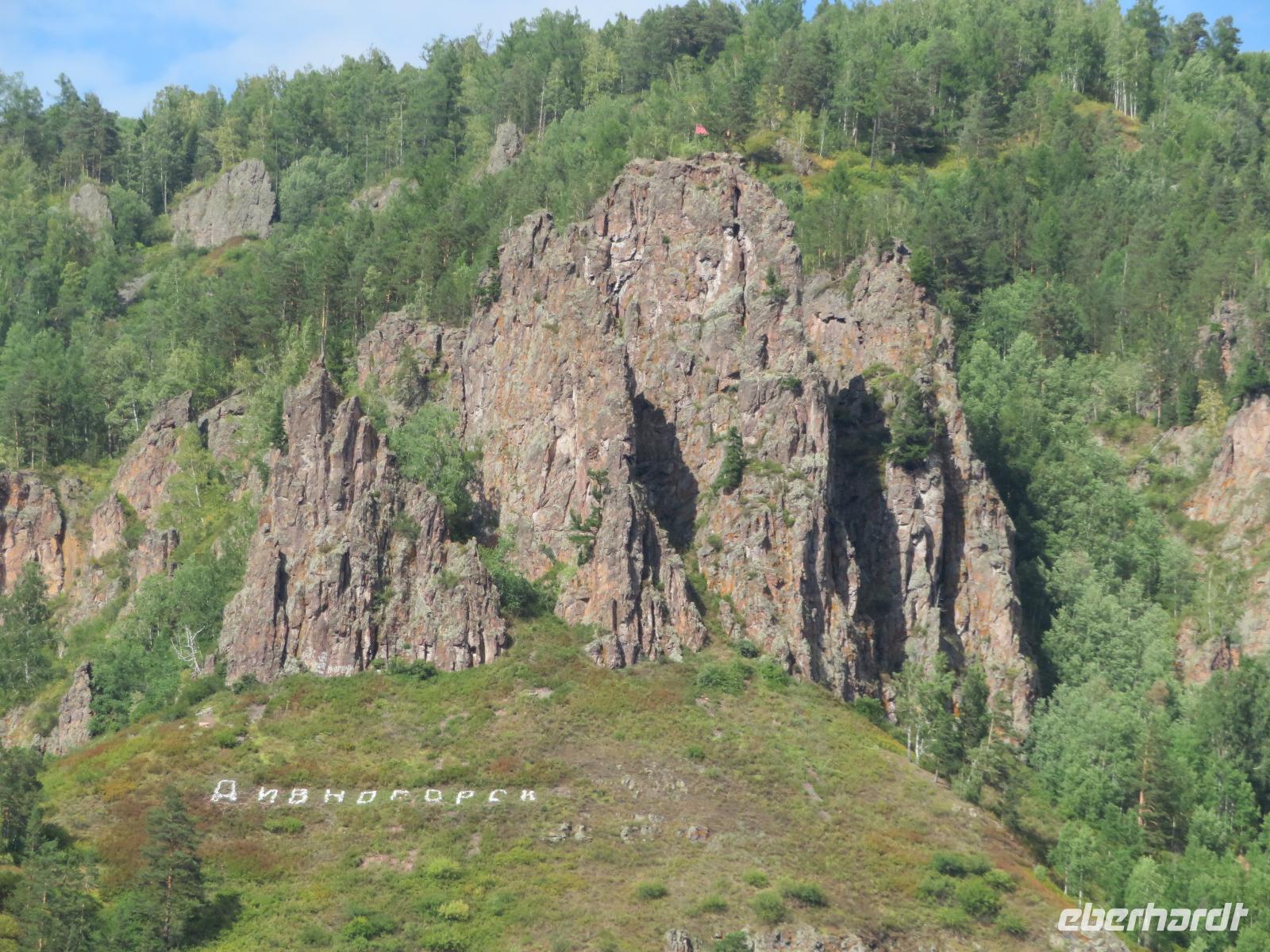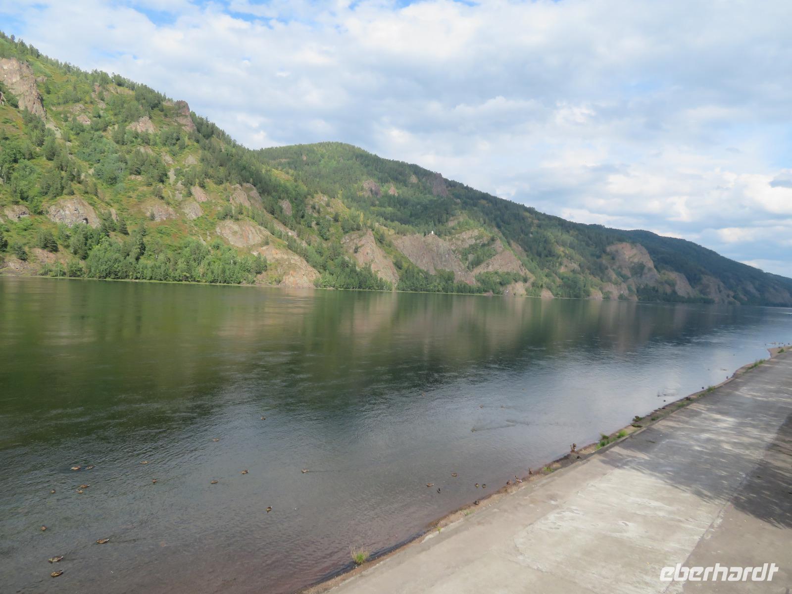 Nach dem mitternächtlichen Start zur Zugfahrt schliefen oder besser dösten alle doch recht lange; Frühstück gab es im benachbarten Wagon-Restaurant. Gegen Mittag erreichten wir Krasnojarsk am Jenissei, wo uns Galina abholte. Die Straßen der kommunistischen Dreieinigkeit von Lenin, Marx und Frieden befahrend, gelangten wir zum ukrainischen Mittagsrestaurant mit grünem Salat, großer Menge Pelmeni und dann noch gegrillten Schweinslendchen. Der Bus brachte uns aus der Stadt in eine bergige Landschaft mit dem Naturpark Stolby zur Linken und bald Felswänden am gegenüberliegenden Ufer des Jenissei. An der Staumauer mit einer Schiffshebeanlage vorbei erreichten wir am Urlauberstandort Admiral den Staubeginn des über 300 Kilometer langen Stausees. Von hier unternahmen wir mit drei Motorbooten einen Ausflug auf dem Stausee zunächst zur Staumauer und dann noch in eine Bucht des Jenissei mit schon kaum zu durchdringender Taiga. In diesem, einst völlig abgesperrten Gelände war im Anblick der entstehenden Ausflugsobjekte für die sich entwickelnde russische Mittelschicht zu erkennen, welche enormen Veränderungen in der Mentalität und auch in den Besitzverhältnissen der Menschen vor sich gehen. Auf unserem Rückweg stoppten wir noch an der „trockenen" Seite der Staumauer und genossen vom „Zar- Fisch-Felsen" oberhalb des Jenissei eine tolle Aussicht und nebenbei den Fototermin einer kirgisischen Hochzeit. Abendessen dann in einem Stadtrestaurant, benannt nach einem im 19. Jahrhundert zu Wohlstand gekommenen Gold-Sucher mit hervorragendem Fischgericht. Wie in den vergangenen Jahren war auch dieser Tag in Krasnojarsk ein Tag der Völlerei und der Landschaftseindrücke.