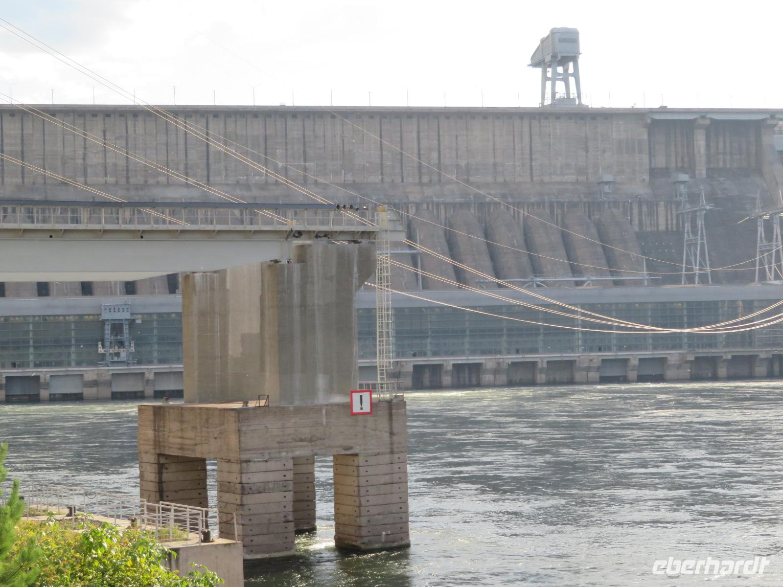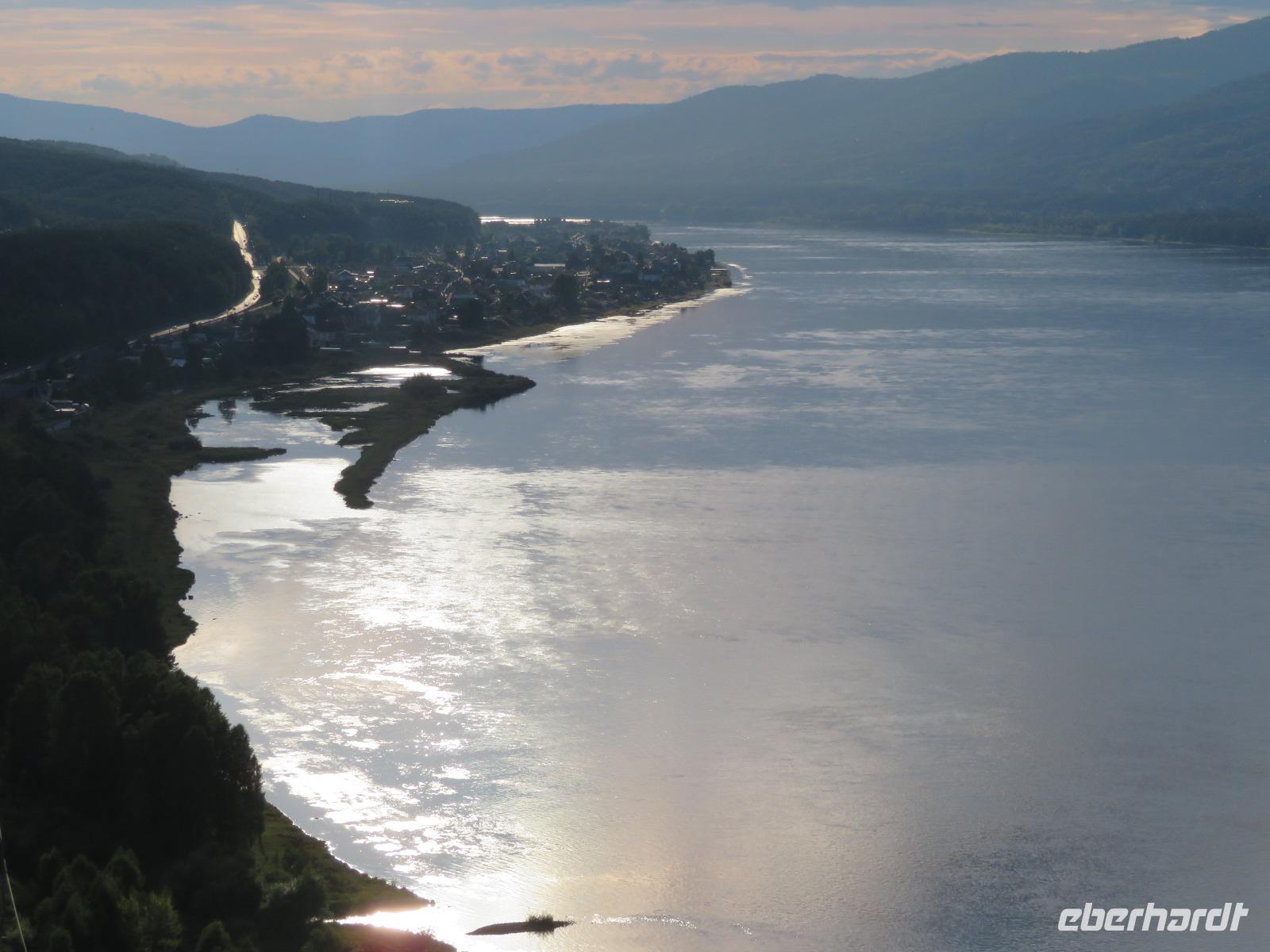 In diesem Jahr fuhren alle Gäste mit dem Doppelsessellift nach oben. Von hier kann man auch einen Kilometer zu Fuß hinaufgehen, dabei werden vielleicht einhundertfünfzig Höhenmeter überwunden. Am Aussichtspunkt hatten wir gute Sicht auf die aus dem Baikal ausströmende Angara und den gegenüberliegenden Port Baikal, wo wir vor zwei Tagen mit dem Zug angekommen waren. Zahlreiche chinesische Gäste ließen uns jedoch kaum zum Fotografieren kommen. Für den Weg hinab entschieden sich die meisten für den Mehrsitzlift - die Laufenden waren indes bedeutend schneller. Zu Fuß ging es nun am Hotel Baikal vorbei zur Uferstraße, wo wir die Legende vom Schamanenstein und der zum Recken Jenissei fliehenden Schönheit Angara hörten.