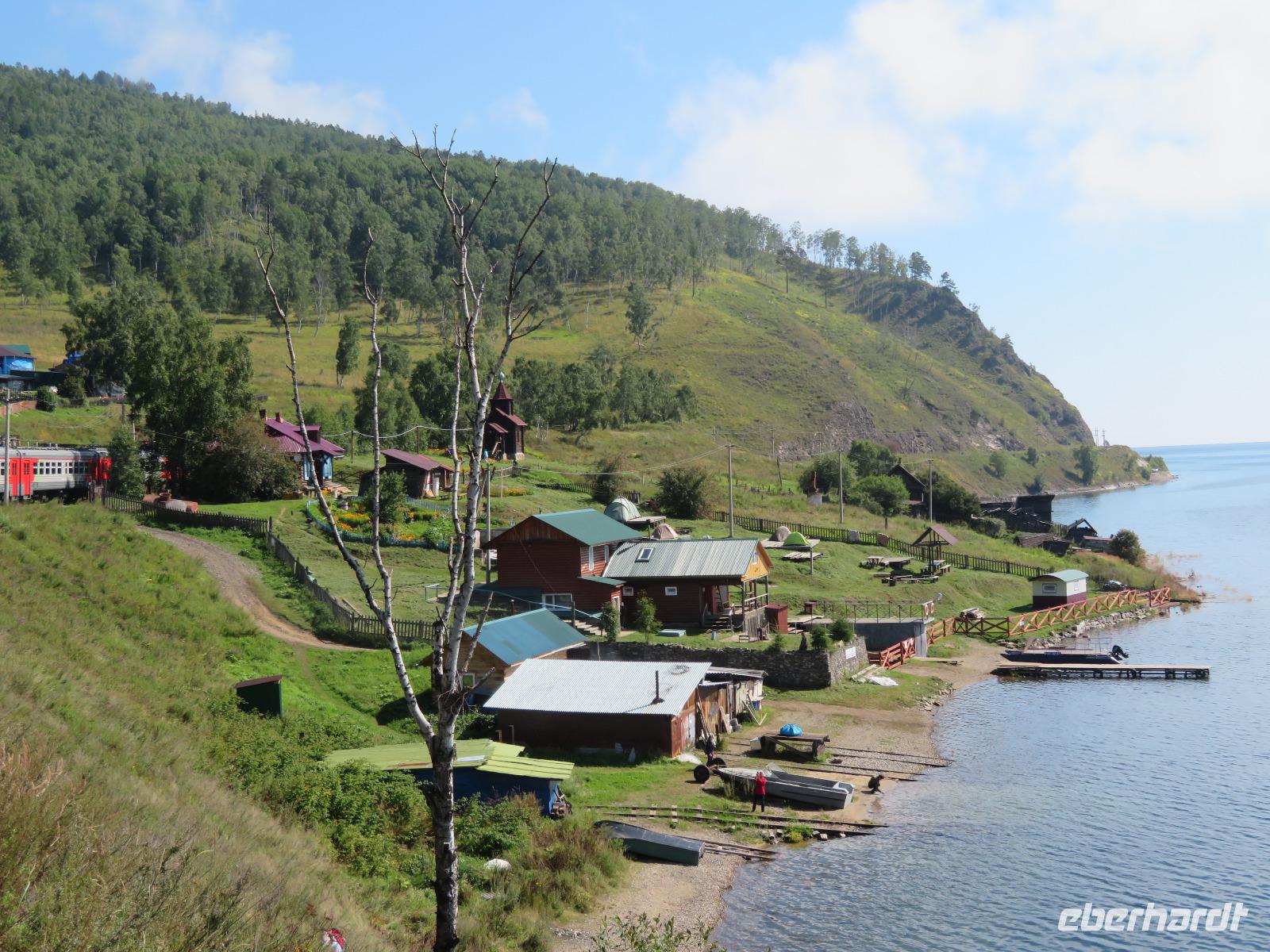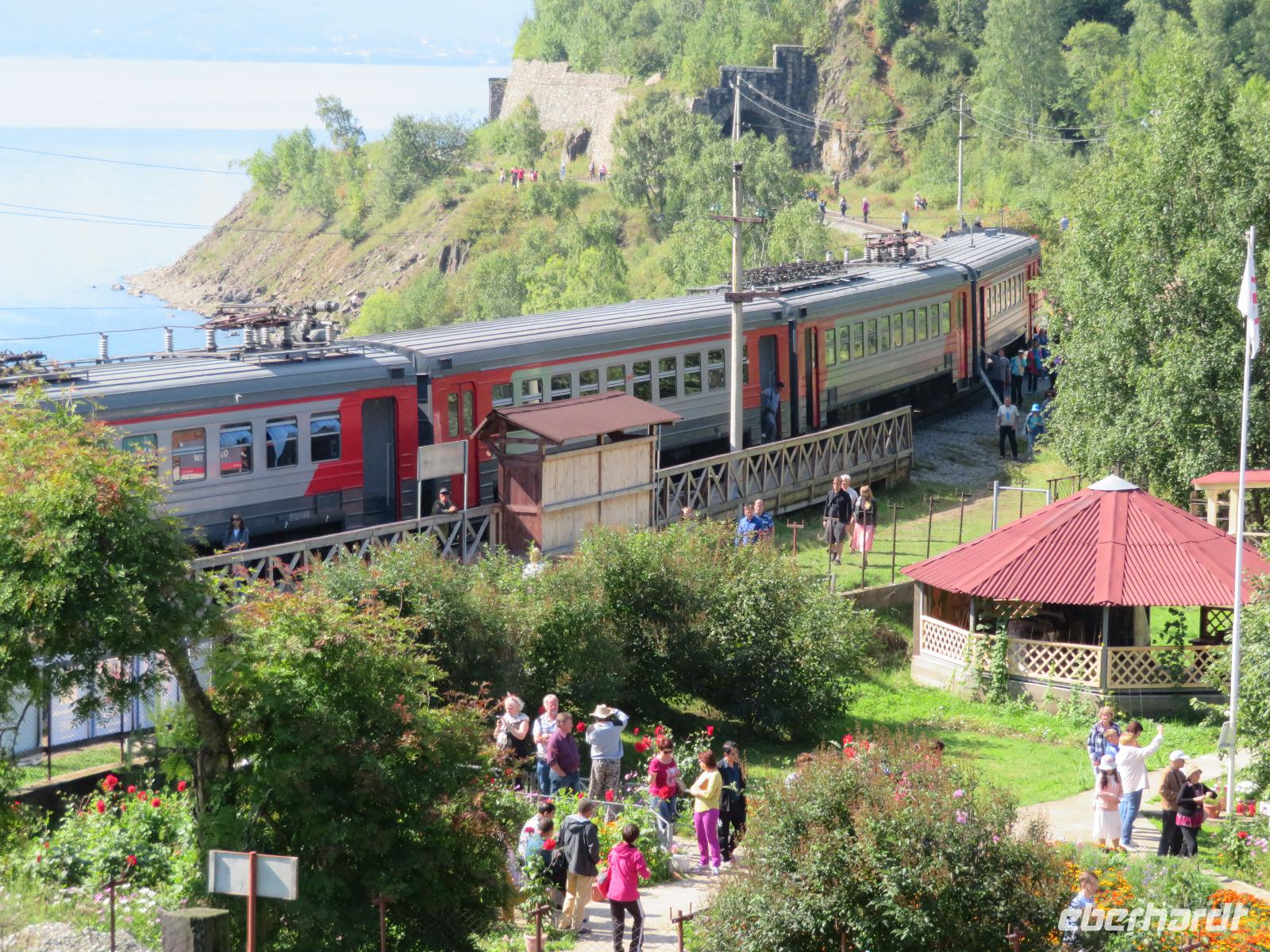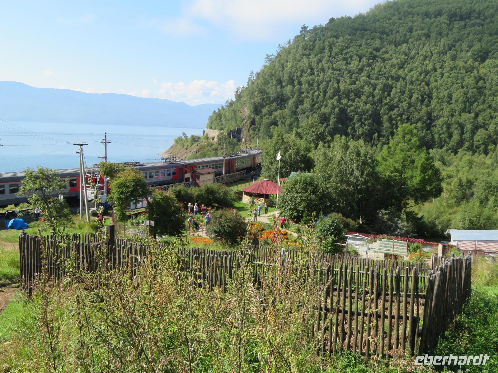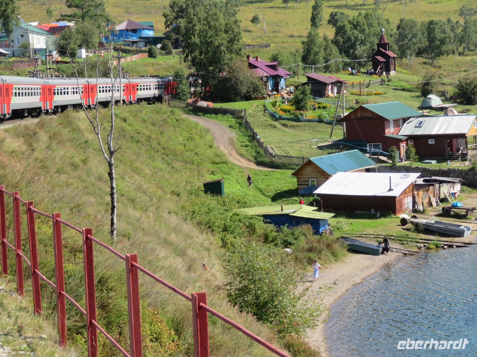 Die baulich wohl spektakulärste Strecke der klassischen Transsibirischen Eisenbahn ist die der Baikalbahn, die einst von Irkutsk entlang der Angara über Port Baikal dann entlang des Baikalsees bis nach Sludjanka am Südufer führte. Die Russen nannten Sie wohl einst auch „Goldene Schnalle" am Gürtel der Transsib oder gar Sibiriens. Seit 1956 sind Irkutsk und Sludjanka mit einer direkten Bahnstrecke über tausend Meter hohe Berge verbunden und die Linie entlang der Angara ging in den Fluten des Stausees unter. Wir fuhren mit einem Touristenzug zunächst über die Gebirgsstrecke. Sonnig präsentierte sich uns folgend der Baikal und die Berge im Umfeld. Von Sludjanka mit seinem Marmor-Bahnhof ging es auf der Trasse, der zu Beginn des 20.Jahrhunderts gebauten Baikalbahn 88 km entlang des Baikalsees. Mit Unterstützung italienischer Tunnelbauer entstanden hier 39 Tunnel und fast dreißig Viadukte, durch oder über die der Zug zwischen Berghang und See fährt. An den beeindruckendsten baulichen und landschaftlich Stellen hielt der Zug mit ausreichend Zeit, so dass alle Gäste zu Fotos im besten Sonnenschein und spätsommerlichem Grün kamen. Der alte Bahnhof von Port Baikal ist ein wenig renoviert und beinhaltet heute ein kleines Museum über den Bau und Betrieb der Baikalbahn. Die Einteilung der Touristen für die Fährüberfahrt nach Listwjanka setzte uns in die - mit blauem Armbändchen markierte - zweite Schicht der Fährüberfahrt. So erreichten wir gegen 18 Uhr unser Hotel Krestovaja Padj. Von den Hotelzimmern und vom Restaurant war ein Blick auf ein Stück des Baikals und die dörfliche Stimmung von Litwijanka möglich; Vorfreude auf die kommende Tage am Baikalsee.