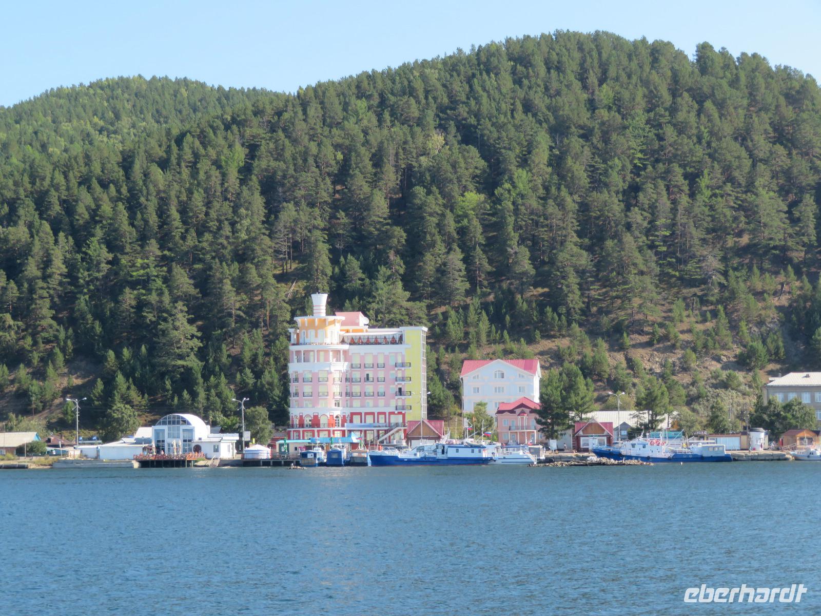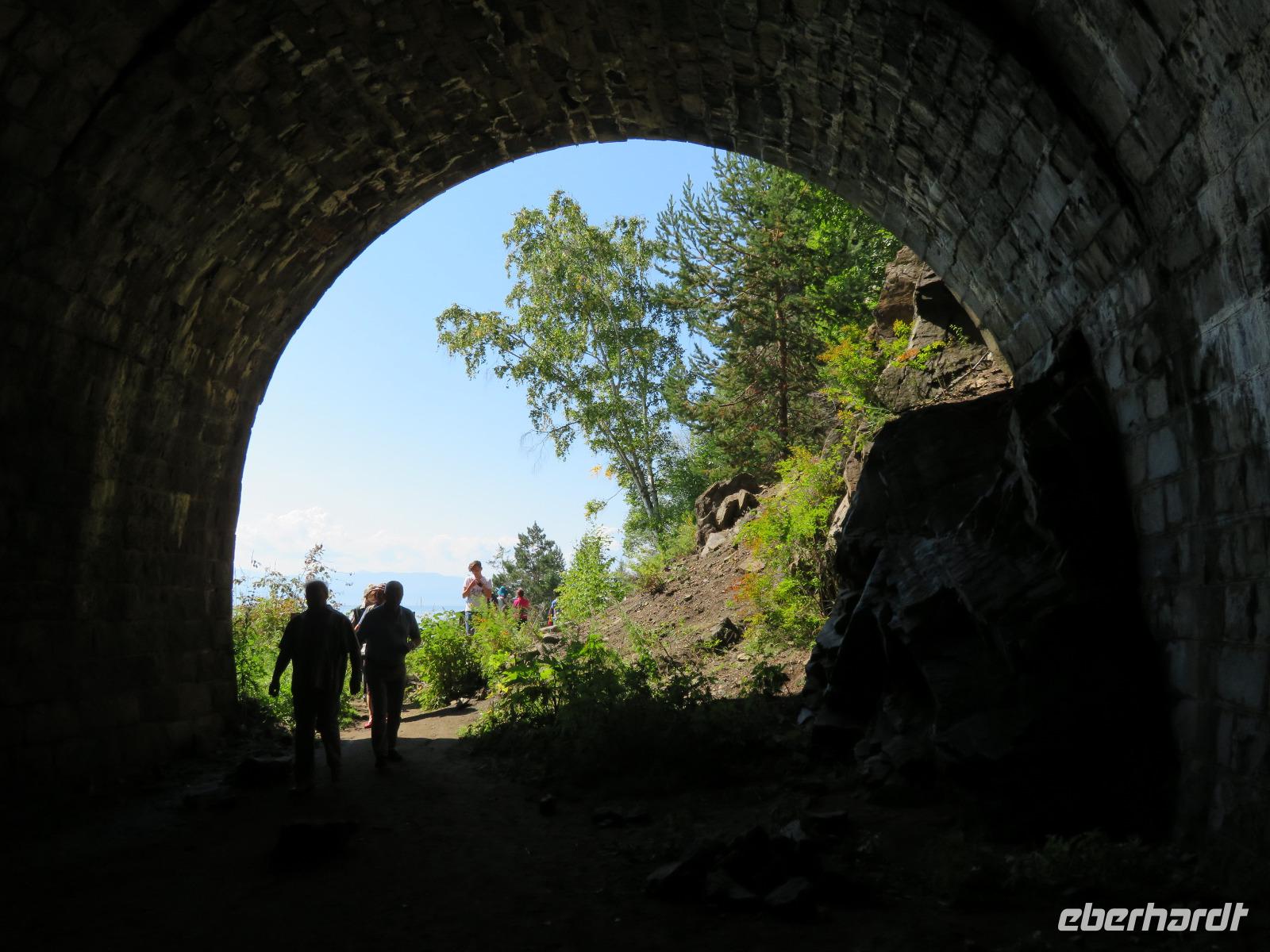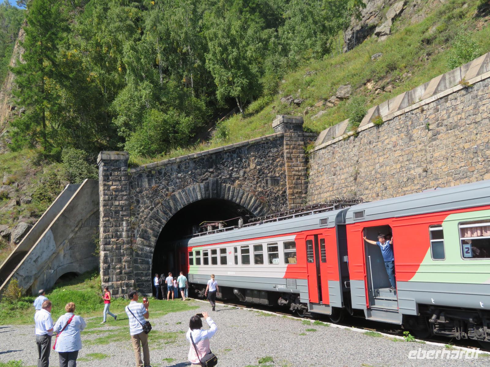 Die baulich wohl spektakulärste Strecke der klassischen Transsibirischen Eisenbahn ist die der Baikalbahn, die einst von Irkutsk entlang der Angara über Port Baikal dann entlang des Baikalsees bis nach Sludjanka am Südufer führte. Die Russen nannten Sie wohl einst auch „Goldene Schnalle" am Gürtel der Transsib oder gar Sibiriens. Seit 1956 sind Irkutsk und Sludjanka mit einer direkten Bahnstrecke über tausend Meter hohe Berge verbunden und die Linie entlang der Angara ging in den Fluten des Stausees unter. Wir fuhren mit einem Touristenzug zunächst über die Gebirgsstrecke. Sonnig präsentierte sich uns folgend der Baikal und die Berge im Umfeld. Von Sludjanka mit seinem Marmor-Bahnhof ging es auf der Trasse, der zu Beginn des 20.Jahrhunderts gebauten Baikalbahn 88 km entlang des Baikalsees. Mit Unterstützung italienischer Tunnelbauer entstanden hier 39 Tunnel und fast dreißig Viadukte, durch oder über die der Zug zwischen Berghang und See fährt. An den beeindruckendsten baulichen und landschaftlich Stellen hielt der Zug mit ausreichend Zeit, so dass alle Gäste zu Fotos im besten Sonnenschein und spätsommerlichem Grün kamen. Der alte Bahnhof von Port Baikal ist ein wenig renoviert und beinhaltet heute ein kleines Museum über den Bau und Betrieb der Baikalbahn. Die Einteilung der Touristen für die Fährüberfahrt nach Listwjanka setzte uns in die - mit blauem Armbändchen markierte - zweite Schicht der Fährüberfahrt. So erreichten wir gegen 18 Uhr unser Hotel Krestovaja Padj. Von den Hotelzimmern und vom Restaurant war ein Blick auf ein Stück des Baikals und die dörfliche Stimmung von Litwijanka möglich; Vorfreude auf die kommende Tage am Baikalsee.