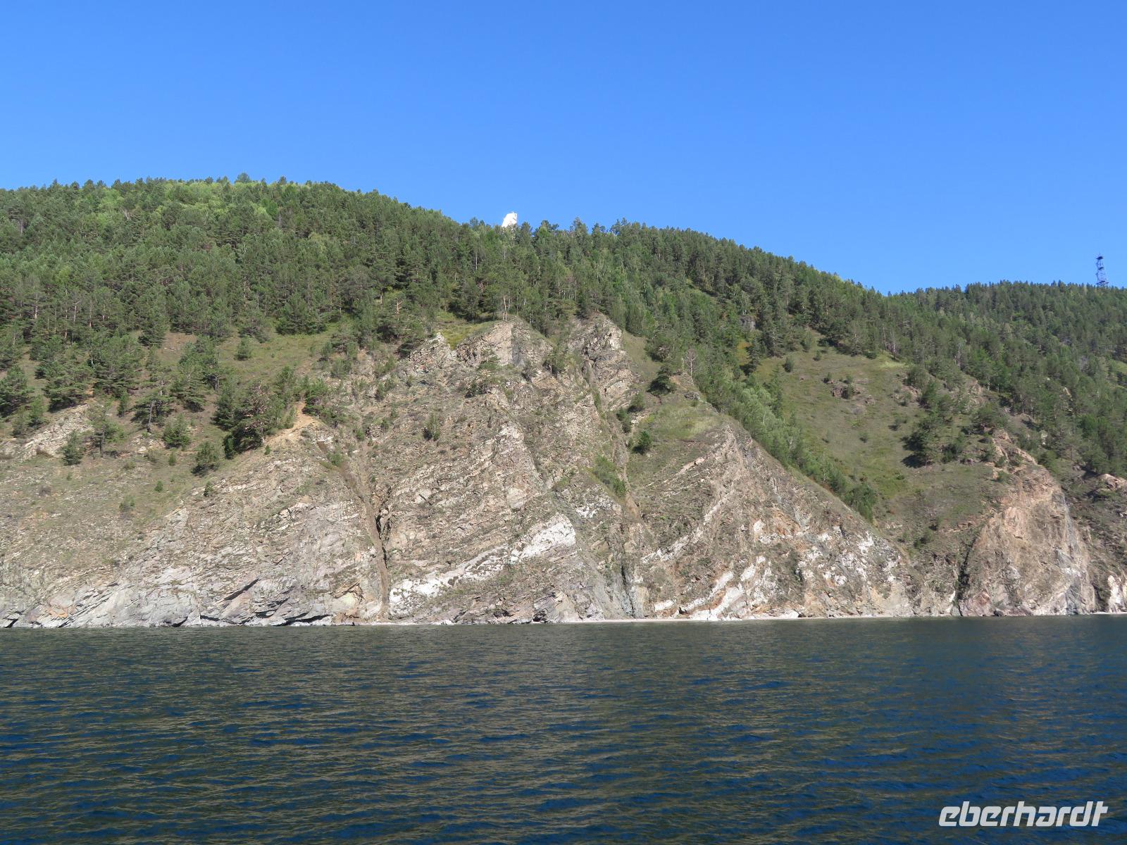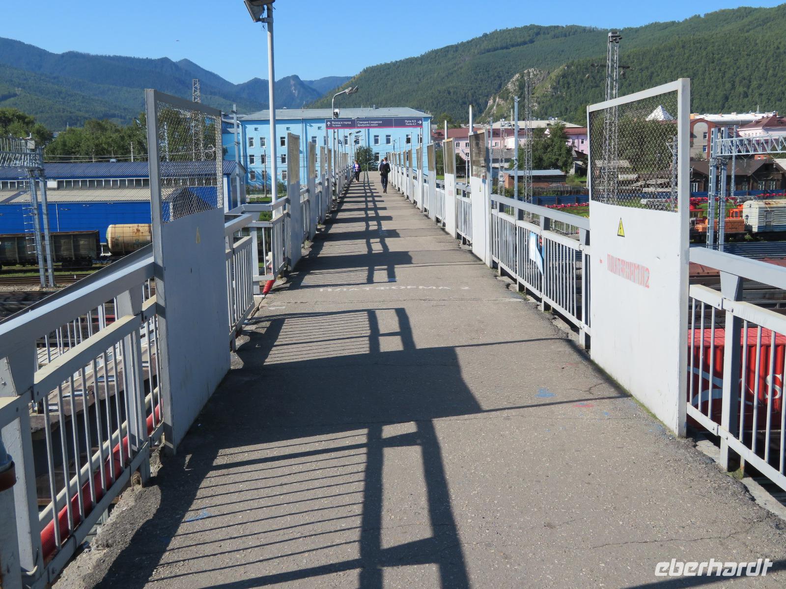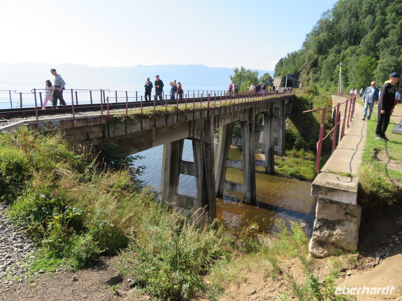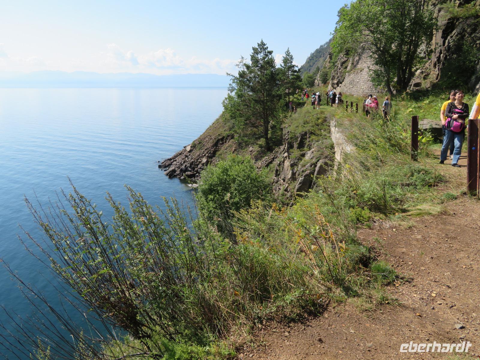 Die baulich wohl spektakulärste Strecke der klassischen Transsibirischen Eisenbahn ist die der Baikalbahn, die einst von Irkutsk entlang der Angara über Port Baikal dann entlang des Baikalsees bis nach Sludjanka am Südufer führte. Die Russen nannten Sie wohl einst auch „Goldene Schnalle" am Gürtel der Transsib oder gar Sibiriens. Seit 1956 sind Irkutsk und Sludjanka mit einer direkten Bahnstrecke über tausend Meter hohe Berge verbunden und die Linie entlang der Angara ging in den Fluten des Stausees unter. Wir fuhren mit einem Touristenzug zunächst über die Gebirgsstrecke. Sonnig präsentierte sich uns folgend der Baikal und die Berge im Umfeld. Von Sludjanka mit seinem Marmor-Bahnhof ging es auf der Trasse, der zu Beginn des 20.Jahrhunderts gebauten Baikalbahn 88 km entlang des Baikalsees. Mit Unterstützung italienischer Tunnelbauer entstanden hier 39 Tunnel und fast dreißig Viadukte, durch oder über die der Zug zwischen Berghang und See fährt. An den beeindruckendsten baulichen und landschaftlich Stellen hielt der Zug mit ausreichend Zeit, so dass alle Gäste zu Fotos im besten Sonnenschein und spätsommerlichem Grün kamen. Der alte Bahnhof von Port Baikal ist ein wenig renoviert und beinhaltet heute ein kleines Museum über den Bau und Betrieb der Baikalbahn. Die Einteilung der Touristen für die Fährüberfahrt nach Listwjanka setzte uns in die - mit blauem Armbändchen markierte - zweite Schicht der Fährüberfahrt. So erreichten wir gegen 18 Uhr unser Hotel Krestovaja Padj. Von den Hotelzimmern und vom Restaurant war ein Blick auf ein Stück des Baikals und die dörfliche Stimmung von Litwijanka möglich; Vorfreude auf die kommende Tage am Baikalsee.
