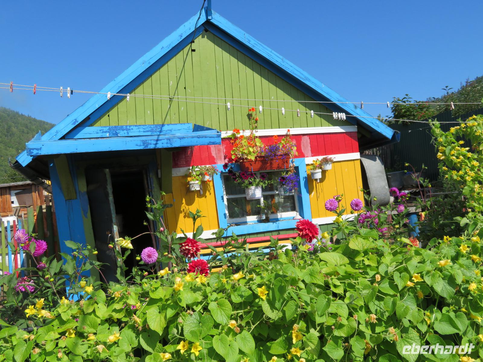 Mit Sonnenschein und erwartungsvollen Gästen begann unser Ausflug mit Schiff auf dem Baikal. Früher waren diese Art von Schiffen wohl bewaffnete Küstenschutzschiffe, heute fahren sie als Fischkutter oder als kleine Passagierschiffe auch auf dem Baikal. Ein solches Schiff hatten wir exklusiv für unsere Reisegruppe und steuerten in reichlich einstündiger Schifffahrt am Westufer des Baikals die Bucht Bolschie Koty - besser Bolschie Xoty - an. Zunächst bummelten wir an der Küste gen Süden, genossen die Blicke auf klares Wasser und suchten die besten Fotomotive. In der Nähe des Friedhofs von Bolschie Koty fassten wir an einem steinigen Strandzugang ins Wasser und eine Dame entschloss sich zum Wassergang. In der Siedlung Bolschie Koty werden wohl noch zwanzig Häuschen als Dauerwohnitz genutzt, worin kaum fünfzig, meist alte, Menschen leben. Andere Häuser werden von Irkutskern als Datscha genutzt. Wir waren zum Mittagessen zu Gast bei Tatjana - einer Psychologin an der Universität Irkutsk, die uns in Tradition seit 2012 empfängt. Ihre Familie nutzt zwei ehemalige Datschengrundstücke mit Haupt - und Nebenhaus, BBQ-Haus, Banja, alles umgeben von einem schönen Blumengarten. Unter Folie werden gar Paprika, Tomaten und Gurken anbaut. In der Küche im Nebenhaus wurden wir sibirisch bewirtet mit einem Thymian-Wodka zum Appetit anregen, mit verschiedenen Kraut- und Farnsalaten, Krautsuppe und als Hauptgang kleine Hähnchen-Buletten mit warmen Kartoffelsalat (oder waren es doch Bratkartoffeln). Zum Tee/Kaffee (und zweitem Thymian) dann Konfekt und Kuchen mit frischem Beerenobst: