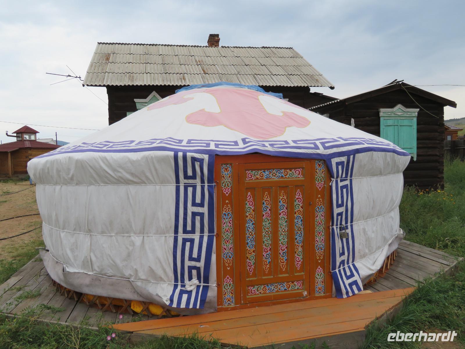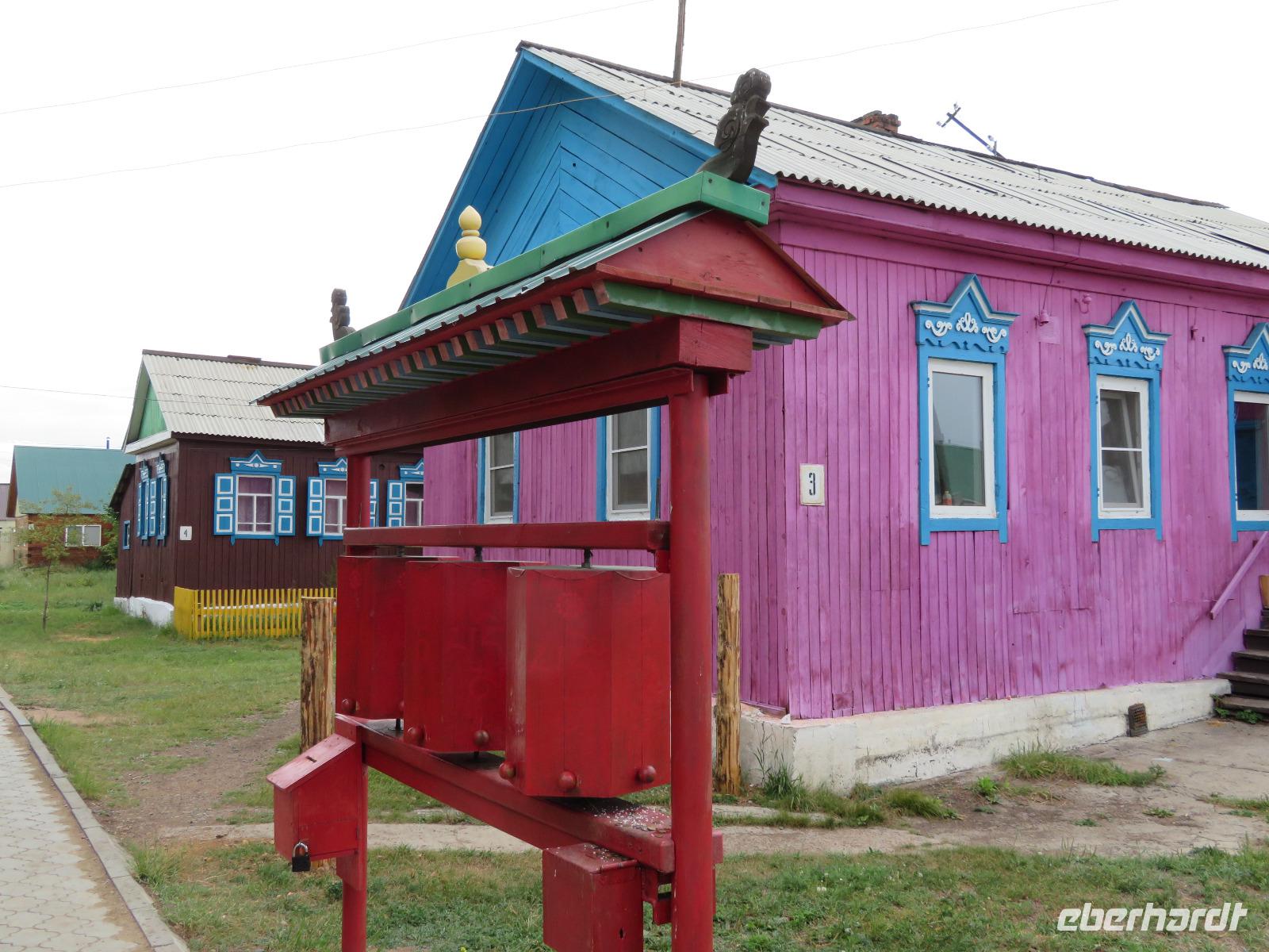 Kurz vor zehn Uhr trafen wir uns zum Tagesausflug in ein burjatisches Dorf, wo wir bei Gela zu Gast waren, deren Tochter mittlerweile in Petersburg Medizin studiert und deren Mann noch nie gesehen wurde. Umso lieber der Empfang durch die Hausherrin. Filzjurte, Holzjurte, Kleidung und die Zubereitung von Speisen wurden nicht nur erklärt, sondern bei der Dachkonstruktion einer Jurte sowie bei der Formung der Teigtaschen Poosy (oder auch Busy) konnten wir uns selbst beteiligen. Vor dem Essen war Spielen angesagt: burjatisches Billard und Tischpferderennen mit Hammelknöchelchen. Dann frisches Gemüse aus dem Garten und Krautsalat; ein Schluck auf die Reisenden; Lapscha - eine Nudelsuppe; ein Schluck auf die Gäste; Teigtaschen mit Hackfleisch; Gebäck mit Wareniki (Sanddorn), ein Schluck auf die Liebe; Tee mit Milch oder auch ohne. Nach dem Essen noch Bogenschießen; Reiten und Ringen wurde uns erlassen. Danke für Alles!Am späteren Nachmittag bummelten wir in Ulan Ude vom weltgrößten Porträtdenkmal - natürlich für Iljitsch (wenn auch die Randchemnitzer Gäste meinen, ihr Nischel sei dies) - die Leninstraße entlang, am Nationaltheater (Stupas mit rotem Stern) vorbei, durch den Triumpfbogen, der 1891 aus Anlass eines Besuchs des Zarewitschs Nikolaus II. errichtet wurde, endeten an der russisch-orthodoxen Kirche, die die Herren des 20. Jahrhunderts in ein Museum des Atheismus verwandelt hatten. Etwas abseits auch hier eine Gedenkstätte für die Opfer der Repressionen insbesondere in den dreißiger Jahren. So verbindet die Leninstraße heute den Platz der Sowjetmacht und dem FSB-Gebäude mit der russisch-orthodoxen Kirche und der Gedenkstätte für die Opfer der einst Mächtigen vom Platz.