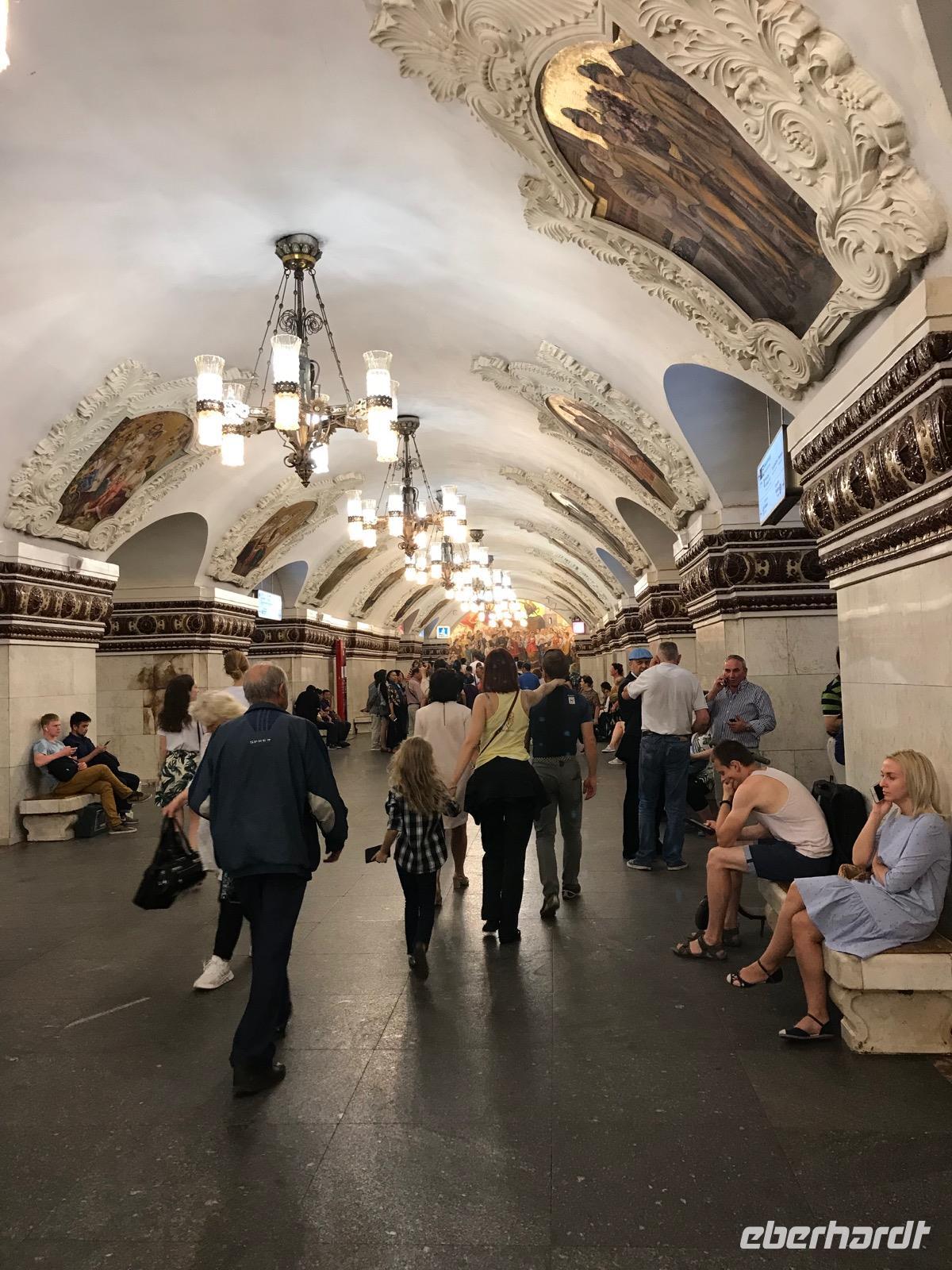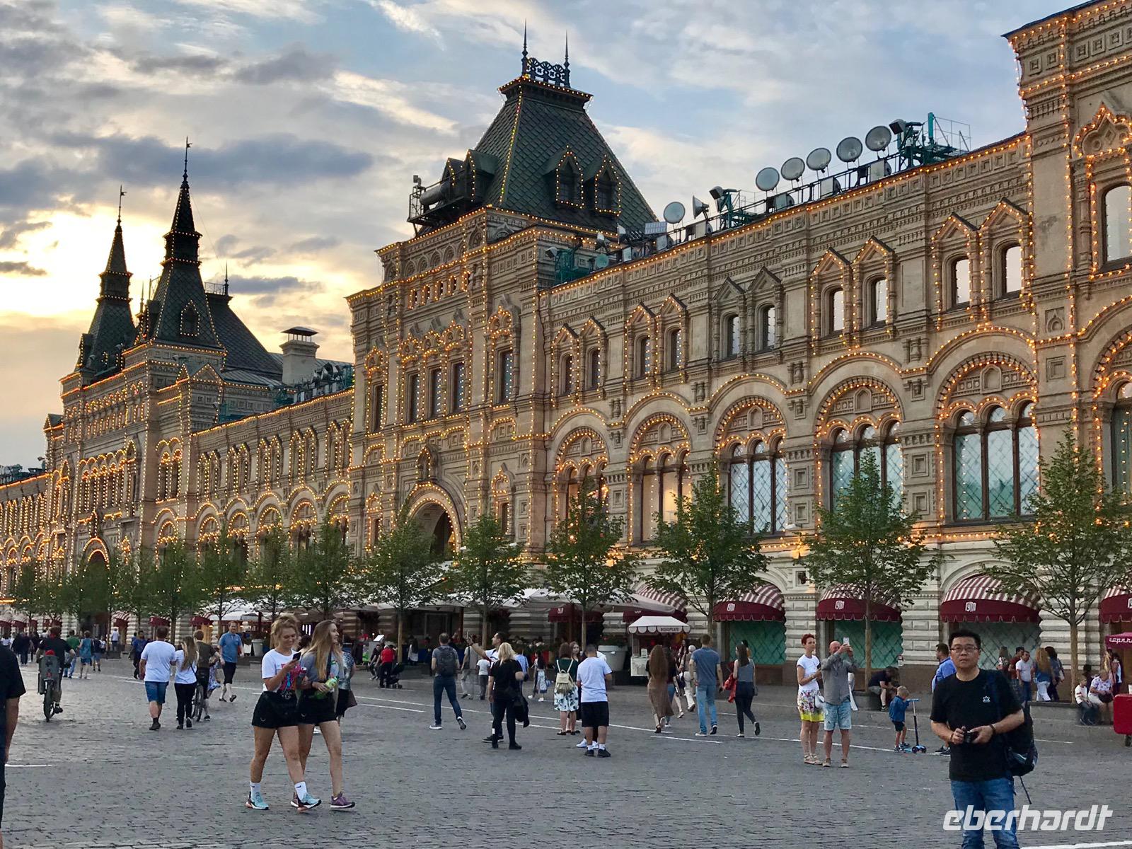 Unsere Reisegruppe ist nicht allzu groß. Wir sind bereit für das Abenteuer auf der Transsib und wir wollen den Baikal sehen. Ab Berlin-Schönefeld fliegen wir nach Moskau-Sheremetyevo, wo uns unsere örtliche Reiseleiterin Lada empfängt. Ein Bus bringt uns in das Hotel „Holiday Inn Express Moscow Paveletskaya". Am Nachmittag wird dann unsere Reisegruppe noch etwas anwachsen durch Gäste, die aus Düsseldorf anreisen. Nach dem Abendessen wollen wir eine erste Bekanntschaft mit Moskau und Russland machen. Das Hotel liegt günstig, man kann direkt mit der grünen Metrolinie vom Paveleckij Bahnhof zur Station Teatral'naja fahren. Von dort führt uns der Weg zunächst in den Alexandergarten, zur Flamme des Unbekannten Soldaten an der Kremlmauer, und dann hinauf auf den Roten Platz. Wir sehen das Historische Museum, das majestätische Kaufhaus GUM, das Leninmausoleum und die Basiliuskathedrale, die 1561 zur Erinnerung an den Sieg über die Tataren bei Kazan' gebaut wurde. Es ist ein ergreifendes Gefühl, hier mitten auf dem Platz zu stehen, der gleich an den Kreml grenzt, auf dem Geschichte geschrieben wurde und der auch an diesem Abend voller Menschen ist, Gäste aus aller Welt und viele Einheimische. Wir bestaunen die Kremlmauern mit den vielen Türmen und Zinnen und sind ergriffen von der architektonischen Schönheit dieses Ortes. Von hier aus gehen wir hinab zum Ufer der Moskva, zum Park Zarjadja und der schwebenden Brücke, wo man einen wunderbaren Ausblick auf das geschäftige Treiben am Fluss hat. Als es dann dunkler wird und die Beleuchtung im GUM angezündet wird, werfen wir noch einen Blick in das größte Kaufhaus des Landes und kaufen ein Eis, hergestellt in alter Tradition des Sowjetlandes. Noch einen Abstecher durch die wunderschön illuminierte Nikol'skaja Straße und zurück zu unserem Hotel. Die Fahrt mit der Metro erscheint kompliziert, ist es aber eigentlich nicht, eher wohl organisiert. Die Bahnhöfe wirken wie geputzt und gut aufgeräumt. Der erste Tag unserer Reise geht zu Ende. Wir sind gespannt auf die Tage, die da auf uns warten.