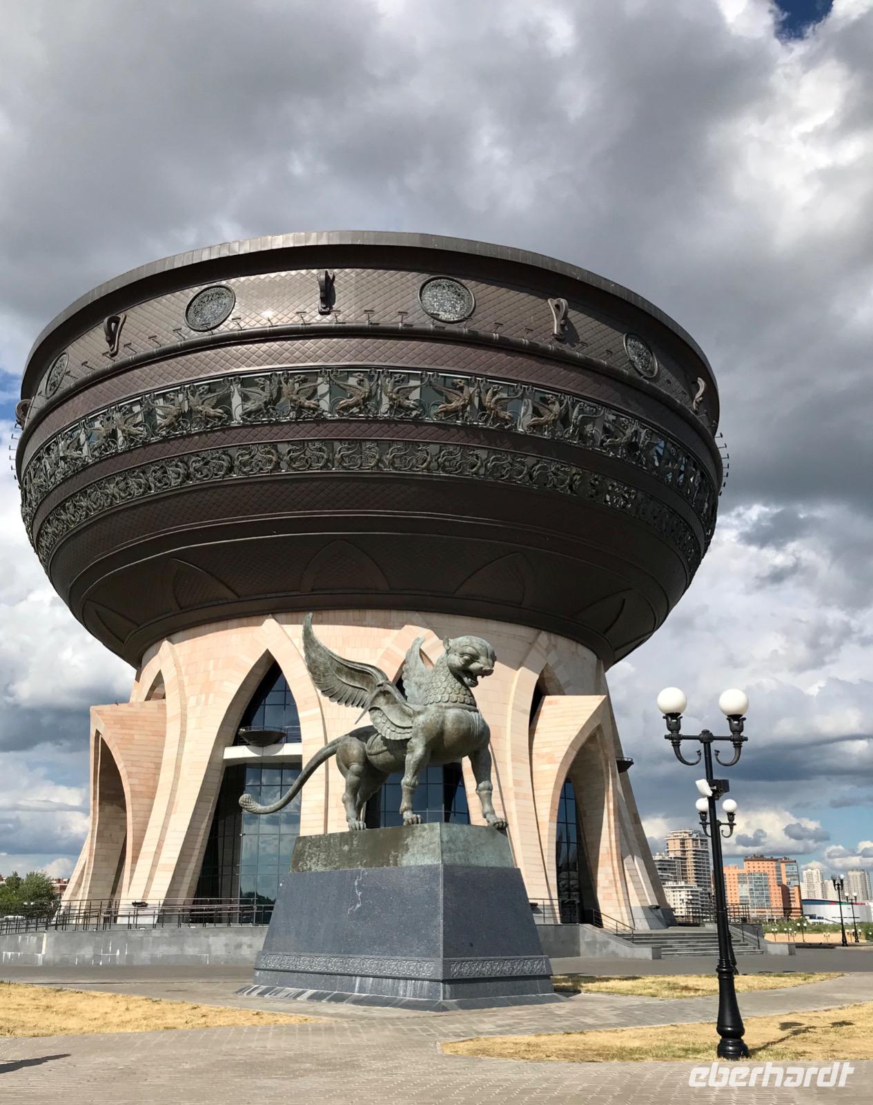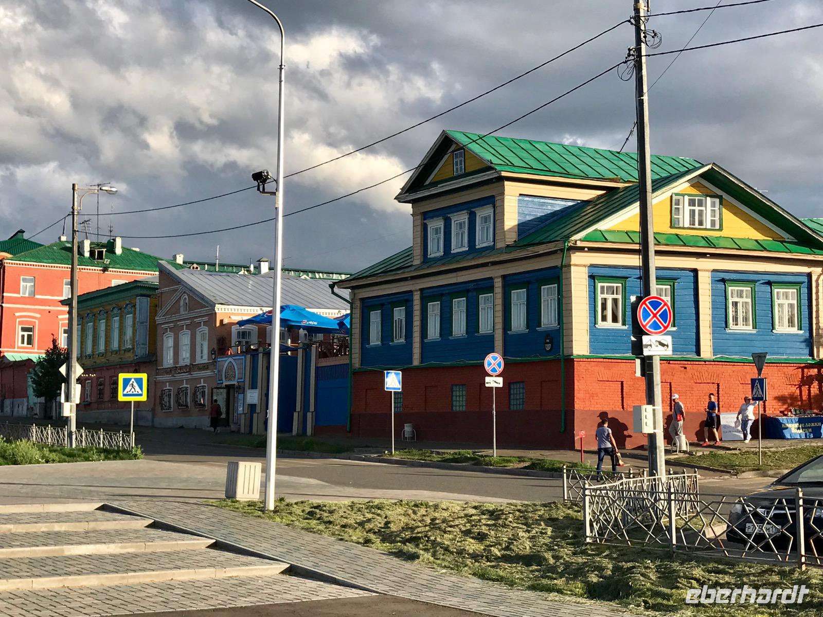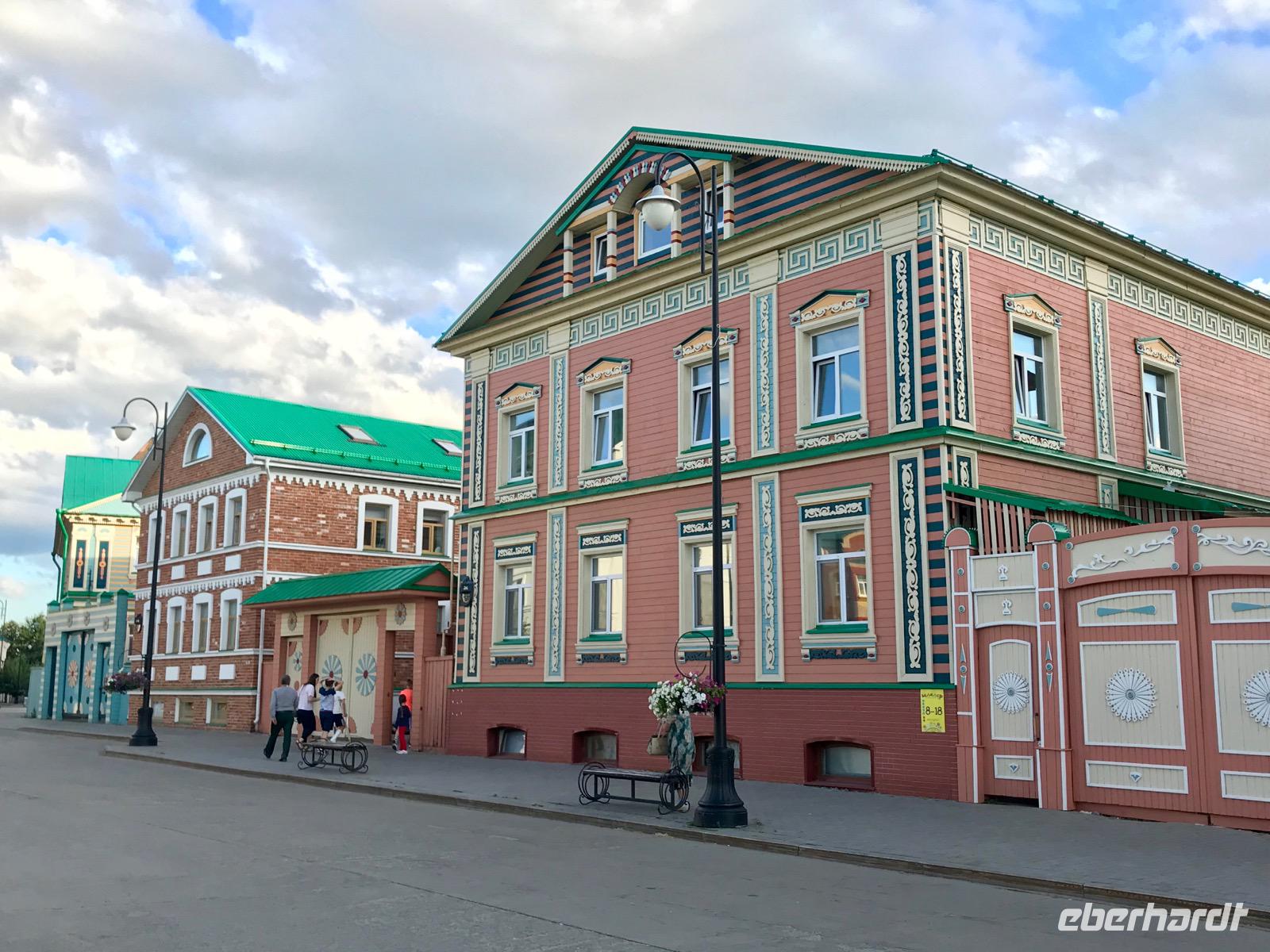 Noch am Vormittag beginnt unsere Stadtbesichtigung zu Fuß zum Kazaner Kreml. Von Weitem sieht man den weißen Kreml mit der langen Mauer und den orthodoxen Kirchen. Aber da sind auch die vier Minarette der 2005 zum 1000. Jahrestag der Stadtgründung geweihten Kul-Scharif-Moschee. Kazan' ist auch das Zentrum des Islams in Russland. Die Moschee soll die größte sein außerhalb des unmittelbaren islamischen Einzugsgebietes. Und sie ist für unser Auge gewöhnungsbedürftig mit ihren türkisblauen Dächern. Wir betreten den Kreml durch den Erlöser-Turm, besuchen die Maria-Verkündigungs-Kathedrale aus dem 16. Jahrhundert, wo wir eine Replik der Ikone Gottesmutter von Kazan' sehen. Sie zählt in der russisch-orthodoxen Kirche zu den meistverehrten Ikonen. Die Silhouette des Kremls wird auch durch den 57 Meter hohen und sich neigenden Sjüjümbike-Turm bestimmt. Hier hören wir die traurige Geschichte der Tatarenfürstin, die sich nicht in die Hand des Zaren Ivan des Schrecklichen begeben wollte, obwohl er sie anbetete. Nach unserer sehr entspannten Vormittagstour und den wunderbaren Ausblicken vom Kreml auf die Stadt und auf den Fluss Kazanka, der hier in die Wolga mündet, fahren wir mit dem Bus in das Zentrum der Stadt. Unmittelbar an der zentralen Straße der Stadt, der Bauman-Straße, die heute Fußgängerzone ist, haben wir unser Mittagessen im Restaurant „Sterljadka". Nach einem kurzen Bummel in der Fußgängerzone setzt sich unsere Tour fort. Wir fahren zunächst an das Ufer der Wolga und betrachten die außergewöhnliche Architektur des Hochzeitspalastes in Form eines gigantischen Kessels, der von geflügelten Drachenschlangen bewacht wird. Er soll an die Gründungslegende der Stadt erinnern. Ein in die Erde vergrabener Topf, ein Kazan' (asiatischer Kochtopf), soll hier angefangen haben zu kochen und man gründete an dieser Stelle die Stadt. Dass es in dem Topf anfing zu kochen, ist sicher darauf zurück zu führen, dass es hier heiße Quellen gibt. Wir fahren weiter in die neu gebauten Stadtviertel, die Schlafstadt wie Alina sie nennt, betrachten die ungewöhnliche Architektur mit asiatischem Flair, sehen das Fußballstadion, das Kindertheater und den Tempel aller Religionen, der christliche Kreuze, muslimische Halbmonde, Davidsterne und chinesische Kuppeln in einem Gebäude vereint. Eine erlebnisreiche Stadtrundfahrt nähert sich dem Ende. Das Abendessen haben wir in der tatarischen Vorstadt. Bevor wir jedoch in einem alten Gutshof eines reichen tatarischen Kaufmanns das leckere Essen genießen, sehen wir uns hier noch etwas um. Vom Stadtsee, dem Wildschweinsee, mit den Wasserspielen sieht man schon die Silhouette der tatarischen Vorstadt. Die Häuser der Tataren sind immer bunt, sagt Alina, und wir können uns davon überzeugen. Bunte Häuser mit kunstvollen Holzschnitzereien. Auf dem Boden des Sees sollen übrigens noch die Schätze der Goldenen Horde liegen. Unser Tag geht zu Ende und die Reise setzt sich am nächsten Tag fort.
