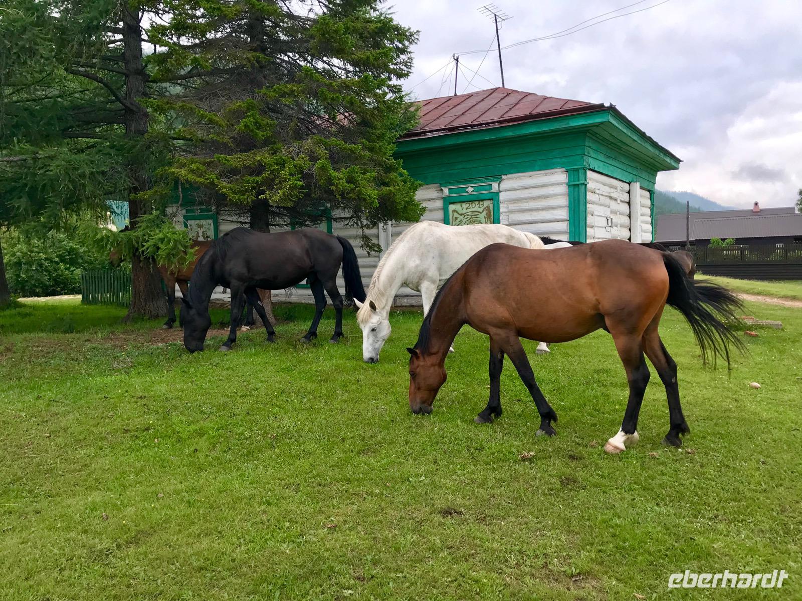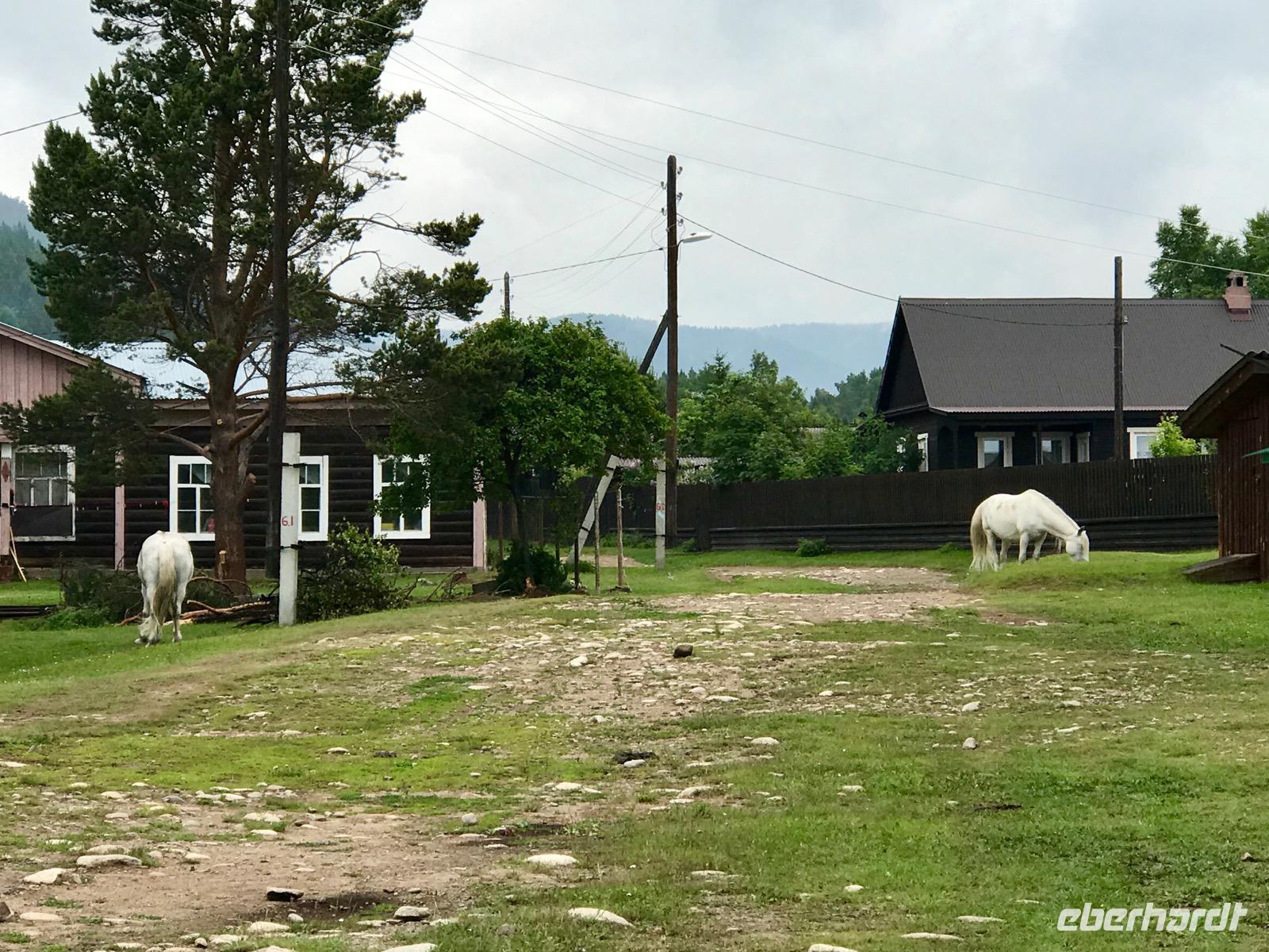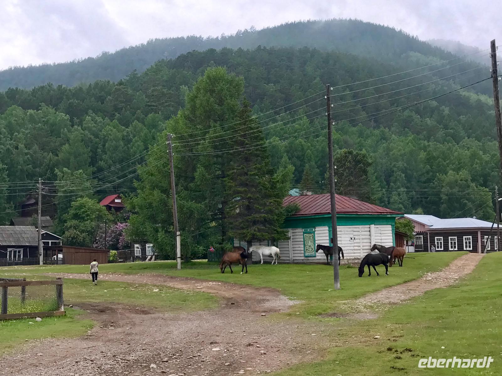 Ein Tag für uns ganz allein und ein wunderschöner Abschiedstag am Baikalsee. Am Vormittag wartet am Strand ein Motorboot auf uns. Leider regnet es etwas, aber wir finden Schutz unter der Plane am Heck des Schiffes. Wir fahren etwa 90 Minuten immer am Strand entlang und erreichen die kleine Siedlung Bolschije Koty, ca. 20 km von Listvjanka. Das Motorschiff verlassen wir mit etwas Schwierigkeit, denn eine ganz einfache Treppe wird ausgeschwenkt und man muss hinab an Land balancieren. Der Regen hat aufgehört. Das Dorf kann man nur per Schiff oder im Winter über das Eis erreichen. Hier gibt es Datschen, aber einige Russen haben sich auch Häuser gebaut, besonders die Pensionäre, die hier tageweise wohnen. Wir sind in die Vergangenheit versetzt. Ein friedliches Dorf, ohne Hektik, mit freilaufenden Pferden, einem Dorfladen, wo man alles kaufen kann, Studenten der Uni, die hier zum Praktikum sind, verschlafenen und windschiefen Häuschen, steinigen Wege durch Wiesen und in den Wald. Hier sind Moskau und die restliche Welt weit weg,