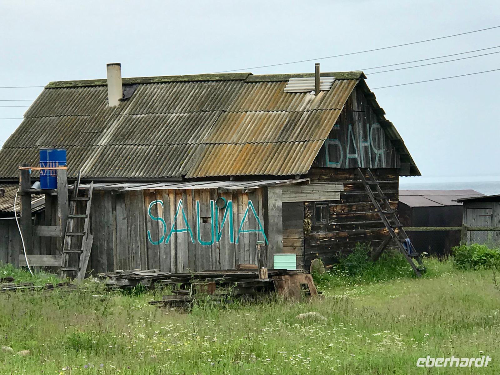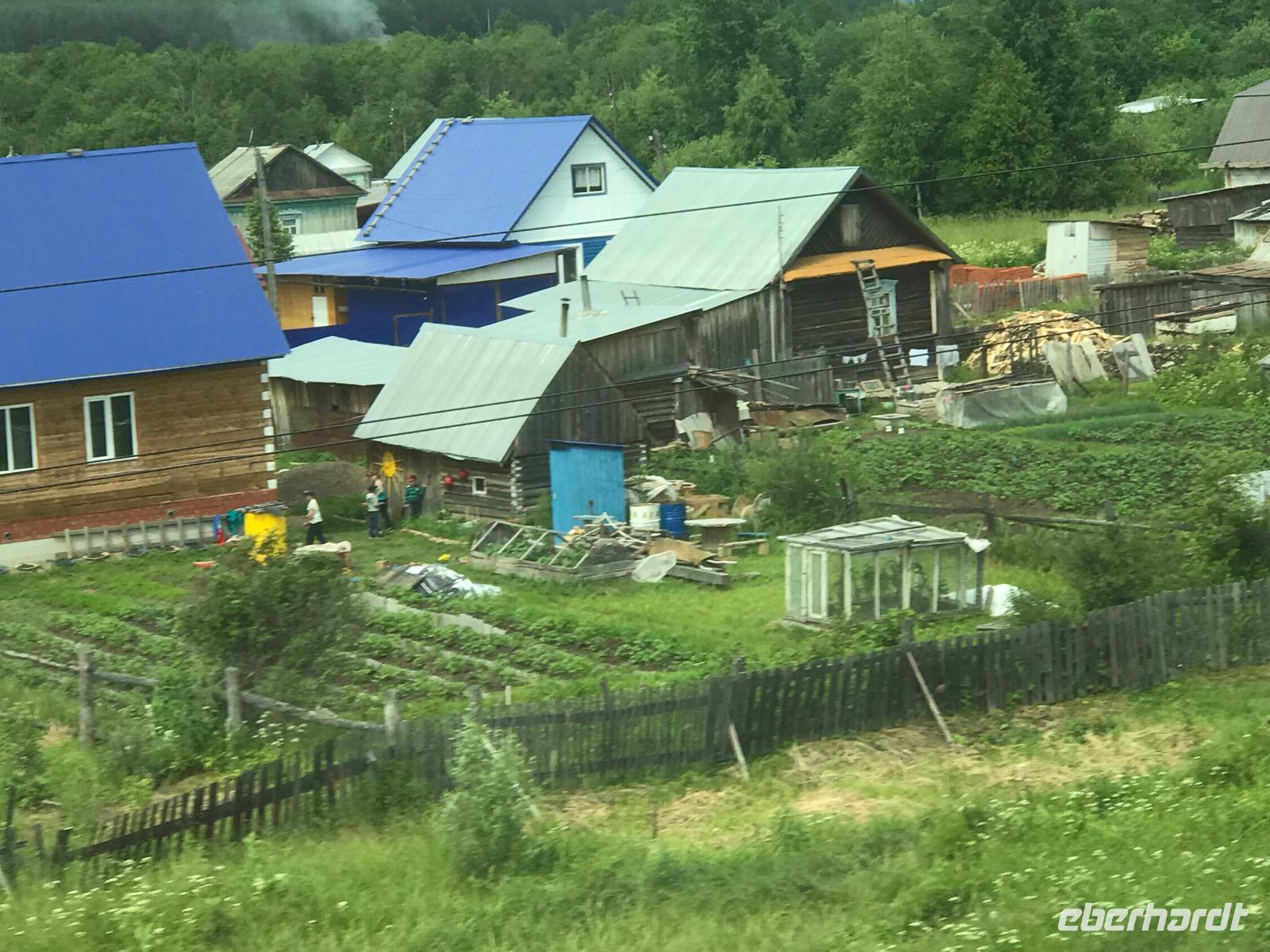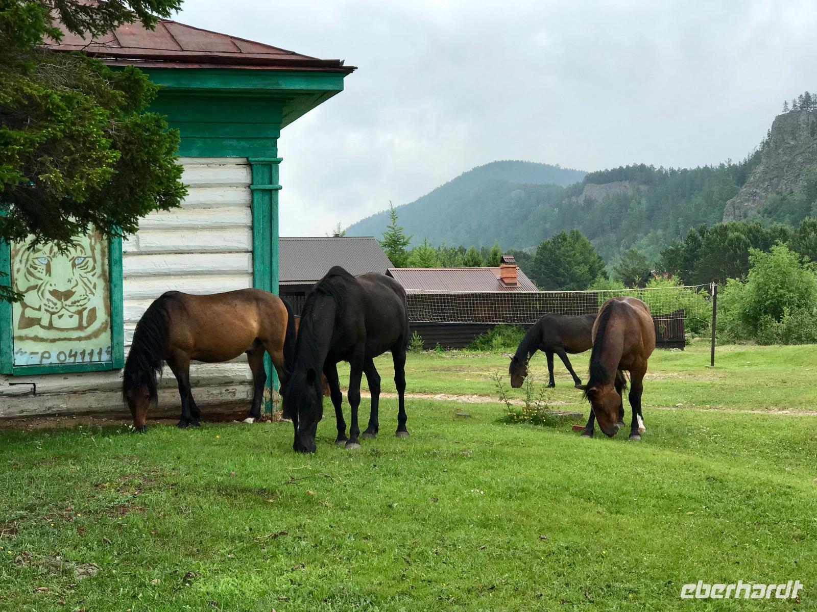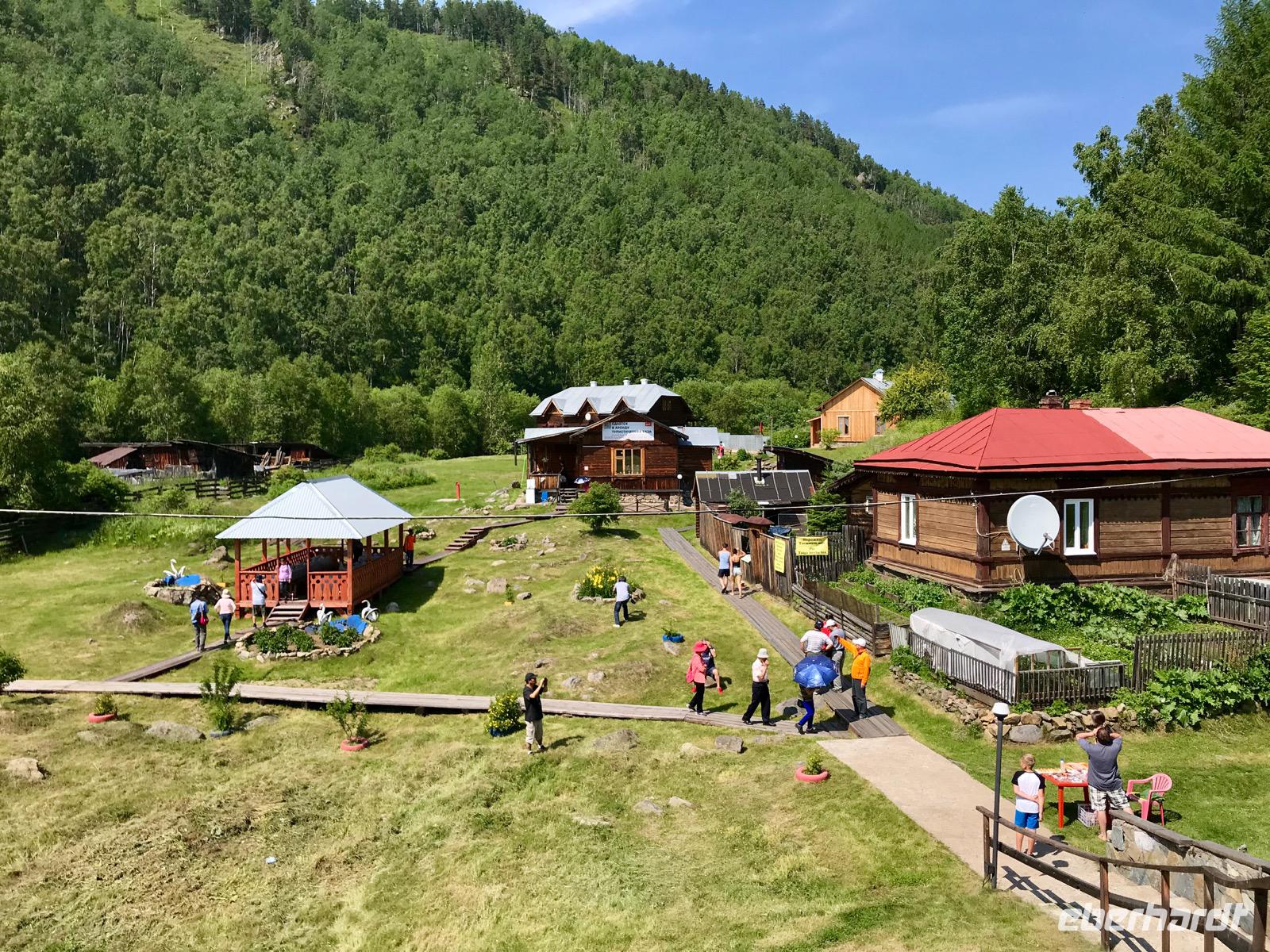 Ein Tag für uns ganz allein und ein wunderschöner Abschiedstag am Baikalsee. Am Vormittag wartet am Strand ein Motorboot auf uns. Leider regnet es etwas, aber wir finden Schutz unter der Plane am Heck des Schiffes. Wir fahren etwa 90 Minuten immer am Strand entlang und erreichen die kleine Siedlung Bolschije Koty, ca. 20 km von Listvjanka. Das Motorschiff verlassen wir mit etwas Schwierigkeit, denn eine ganz einfache Treppe wird ausgeschwenkt und man muss hinab an Land balancieren. Der Regen hat aufgehört. Das Dorf kann man nur per Schiff oder im Winter über das Eis erreichen. Hier gibt es Datschen, aber einige Russen haben sich auch Häuser gebaut, besonders die Pensionäre, die hier tageweise wohnen. Wir sind in die Vergangenheit versetzt. Ein friedliches Dorf, ohne Hektik, mit freilaufenden Pferden, einem Dorfladen, wo man alles kaufen kann, Studenten der Uni, die hier zum Praktikum sind, verschlafenen und windschiefen Häuschen, steinigen Wege durch Wiesen und in den Wald. Hier sind Moskau und die restliche Welt weit weg,