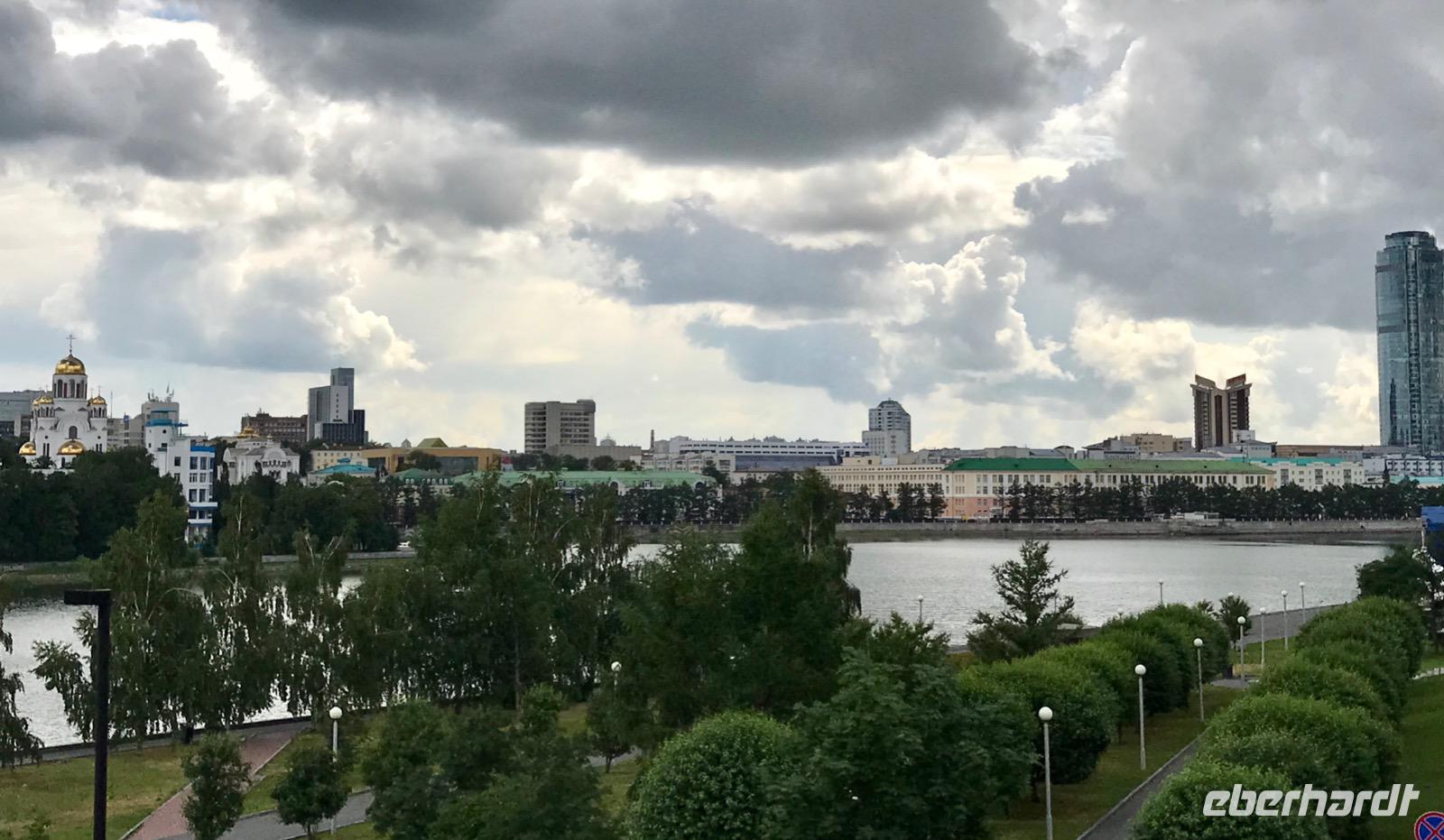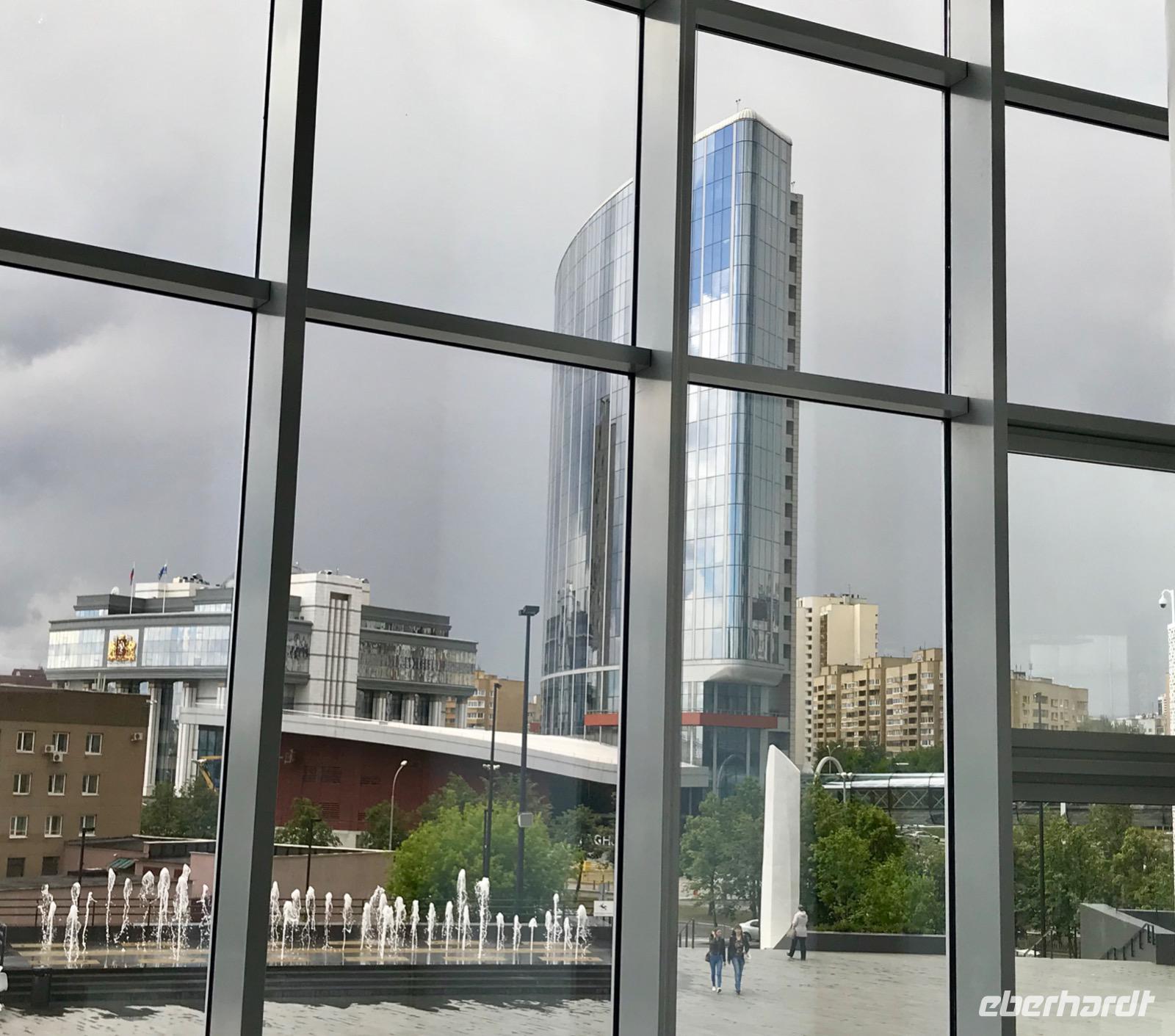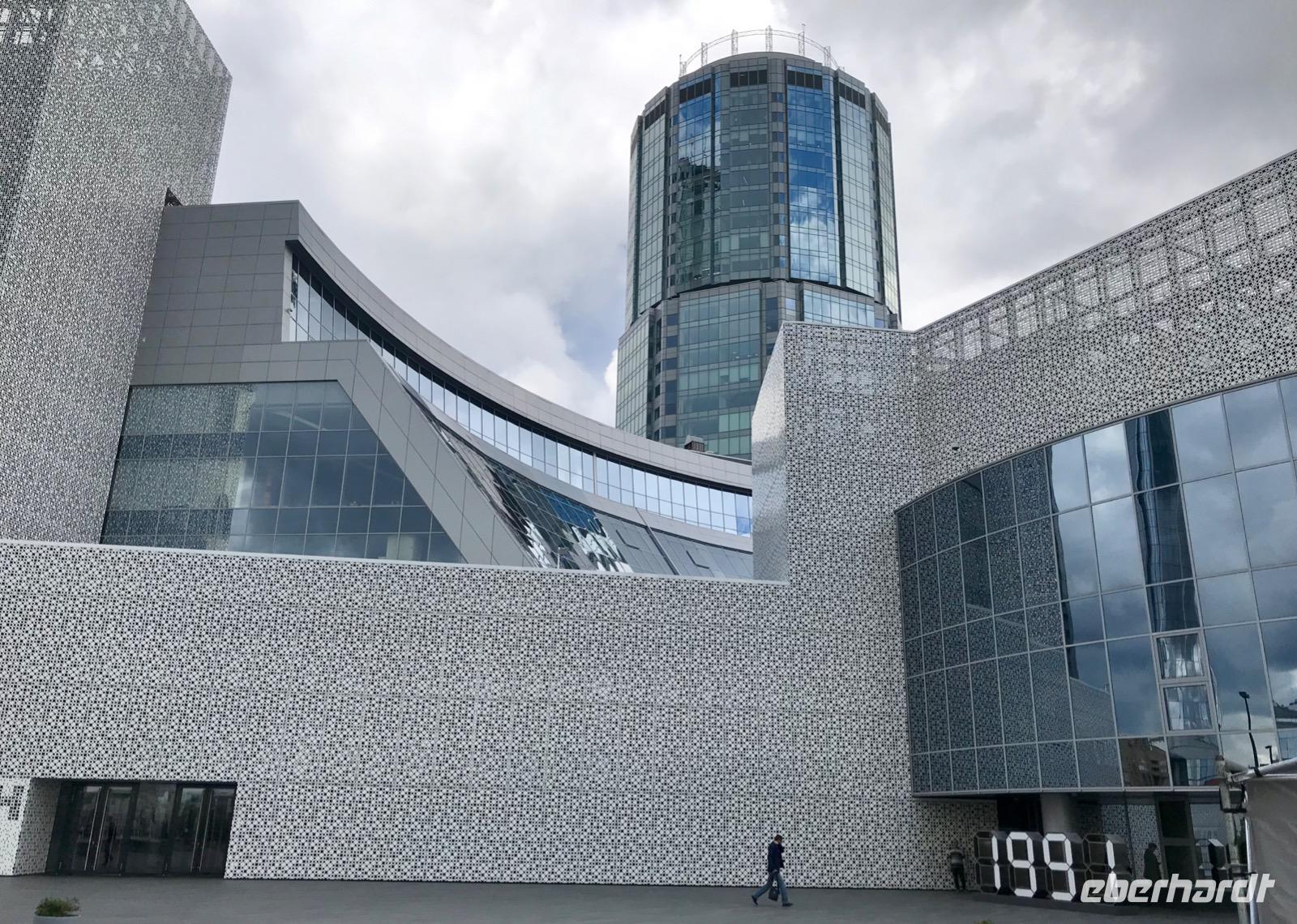 Wir sind an der Schnittstelle zwischen Europa und Asien, im Uralgebirge. Ekaterinburg entstand 1721 im Rahmen der Erschließung der Naturreichtümer des Urals und wurde von Zar Peter I. gefördert. Es war Vasilij Tatišcev, der an diesem Ort die erste Eisenfabrik gründete und mit dem Bau der Siedlung begann. Wir beginnen unseren Stadtrundgang am architektonisch bemerkenswerten, 2015 eröffneten Jelzin-Zentrum, das sich direkt am Ufer des Flusses Isset im Stadtzentrum befindet. Hauptteil des Zentrums ist das Jelzin-Museum, das dem ersten russischen Präsidenten gewidmet ist, der aus dem Ural stammt und der von 1976 bis 1985 Parteichef in dieser Stadt war. Unsere Reiseleiterin erzählt uns im Museum detailliert über die sieben historischen Tage, die die Sowjetunion und Russland grundlegend veränderten. Es ist ein außerordentlich gut gestaltetes Museum, dass dem Besucher in eindrucksvoller Weise die Zeit der Wende nahebringt. Auch wir haben Russlands Historie besser verstehen gelernt.