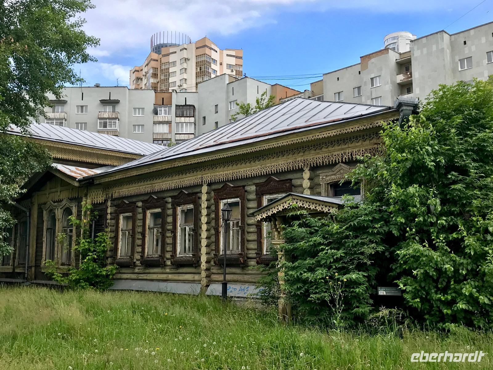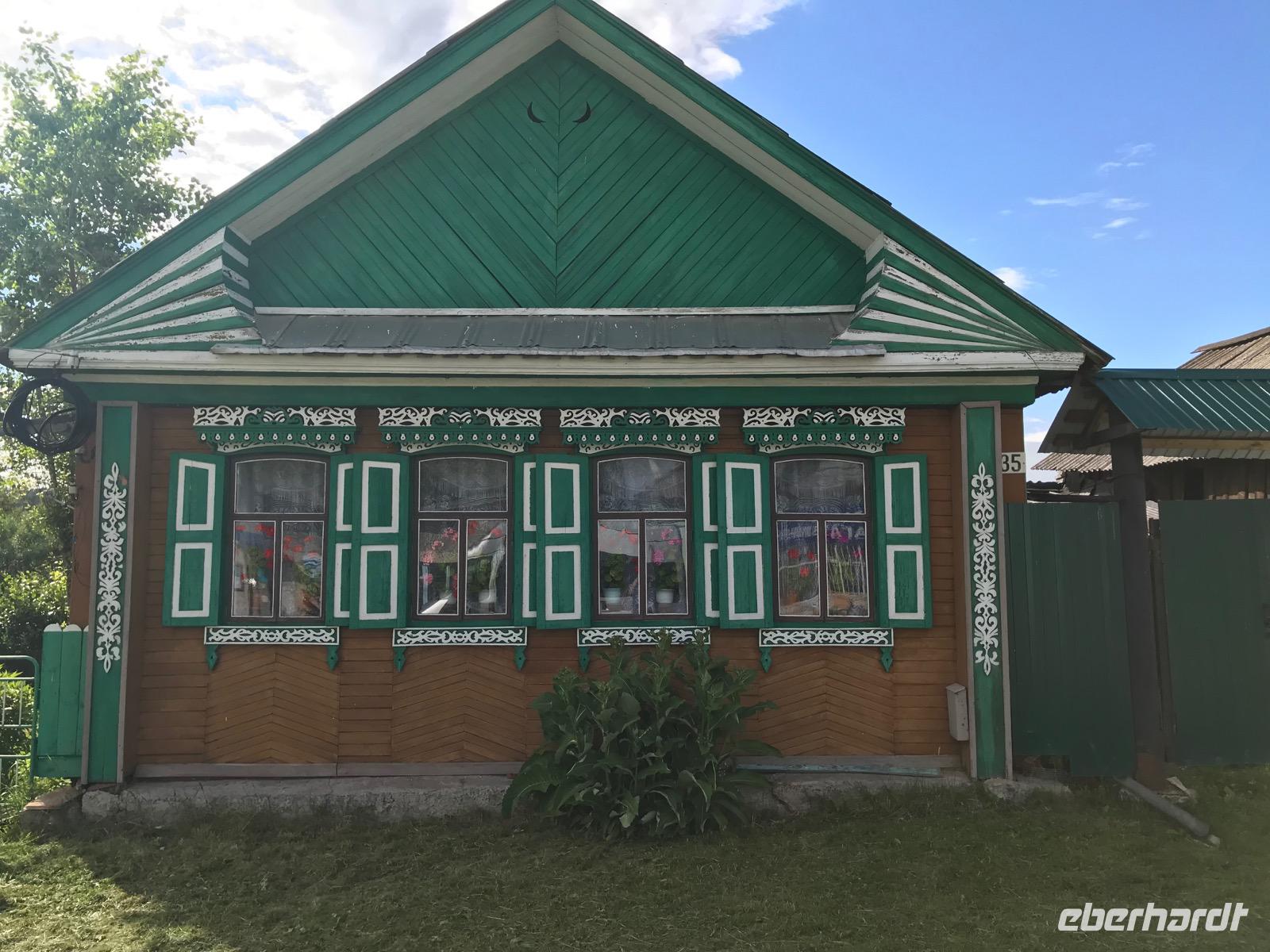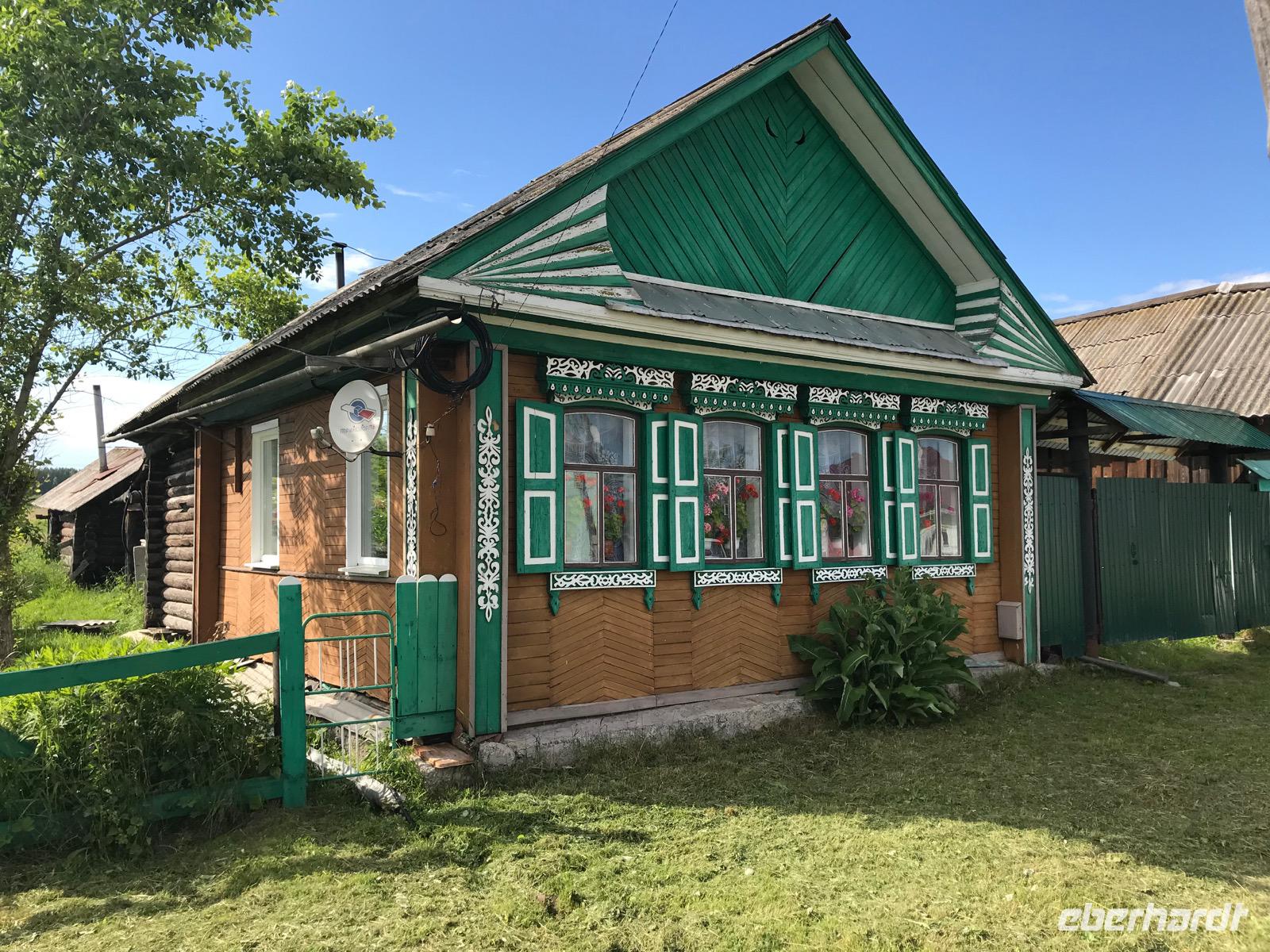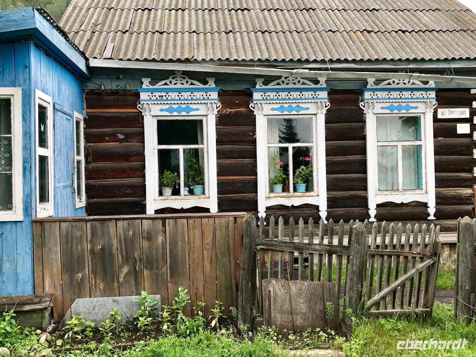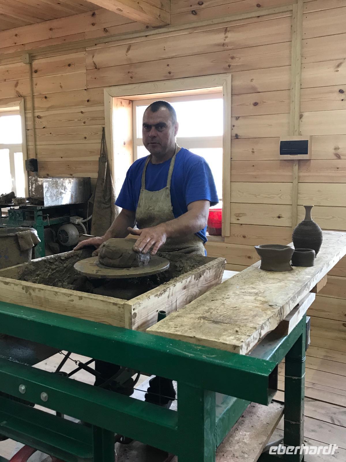 Gestärkt nach einem Mittagessen in Nevjansk fahren wir weiter in das kleine Dorf Byngi (wer kennt schon Byngi, lacht der Busfahrer) mit der alten Sankt Nikolaus Kirche, die seit langem restauriert wird und wo es noch vieler Spenden bedarf. Der Ort selbst ist lieblich, alte Holzhäuschen mit bunten Fenstern und Schnitzereien wie Spitzengardinen, mit vielen Holzscheiten vor dem Tor für den strengen Winter, freilaufenden Ziegen, Rindern und Pferden, kleinen und großen Gemüsegärten. Hier treffen wir später auch Stefan und Olga, die uns ihr Refugium zeigen. Aber zunächst besuchen wir das Dorf Tavalgi und den hiesigen Töpfer. Ihm muss wohl gerade das alte Holzhaus abgebrannt sein und fleißige Hände sind dabei, ein neues, weitaus größeres Holzhaus aus riesigen Baumstämmen zu bauen. Im Haus begrüßt uns der Töpfer und führt uns ein in die Welt der Herstellung von Haushaltsgeschirr aus Ton, der unweit des Dorfes am Ufer des Flusses geborgen wird. Die Vorführung begeistert uns, denn der Töpfer ist von seinem Handwerk besessen. Unser Tag neigt sich dem Ende zu, wir fahren zurück nach Ekaterinburg und wir denken an die vielen Menschen, die uns in dieser Region gastfreundlich aufgenommen haben und denen wir für die Zukunft Glück wünschen.