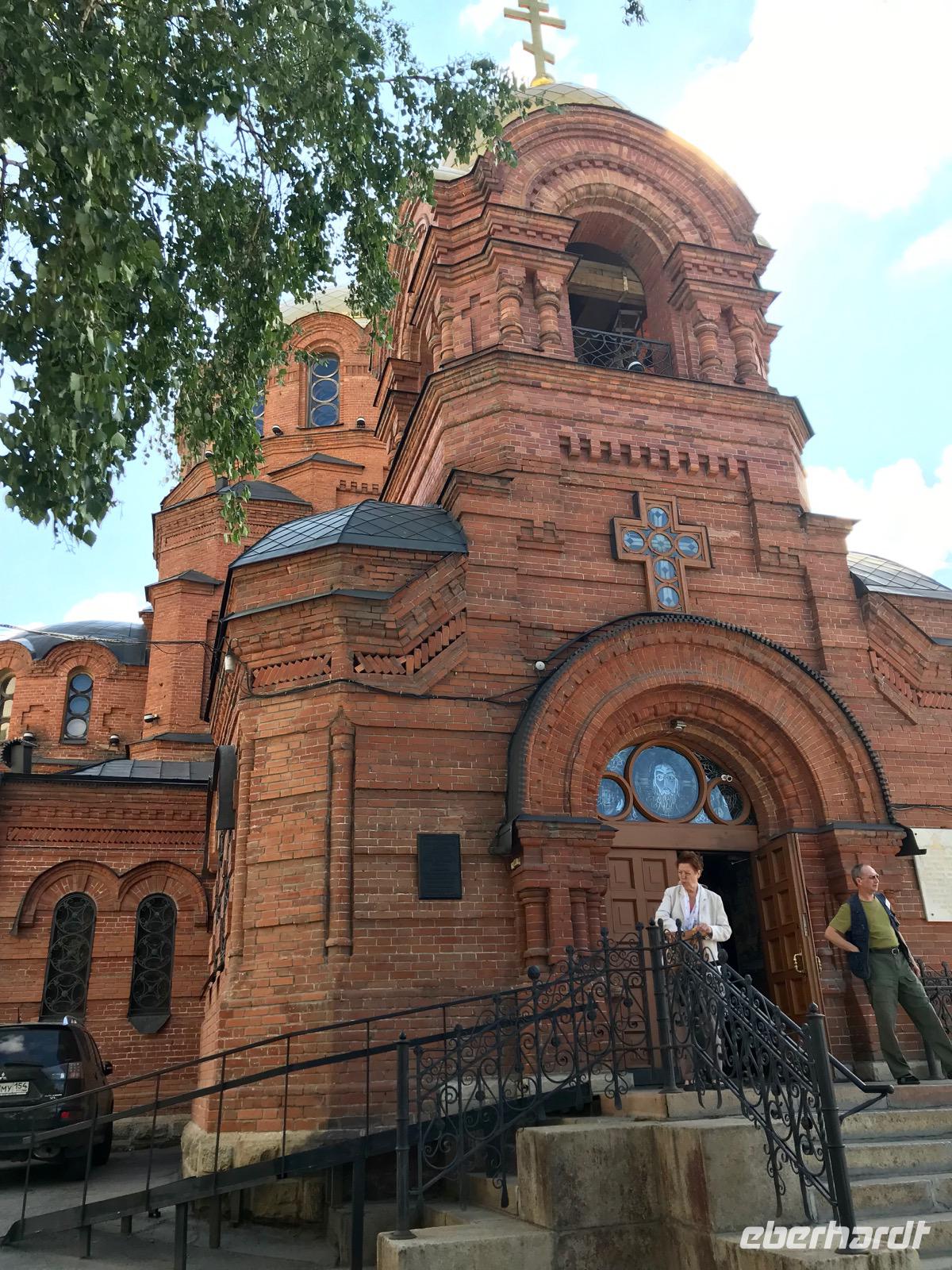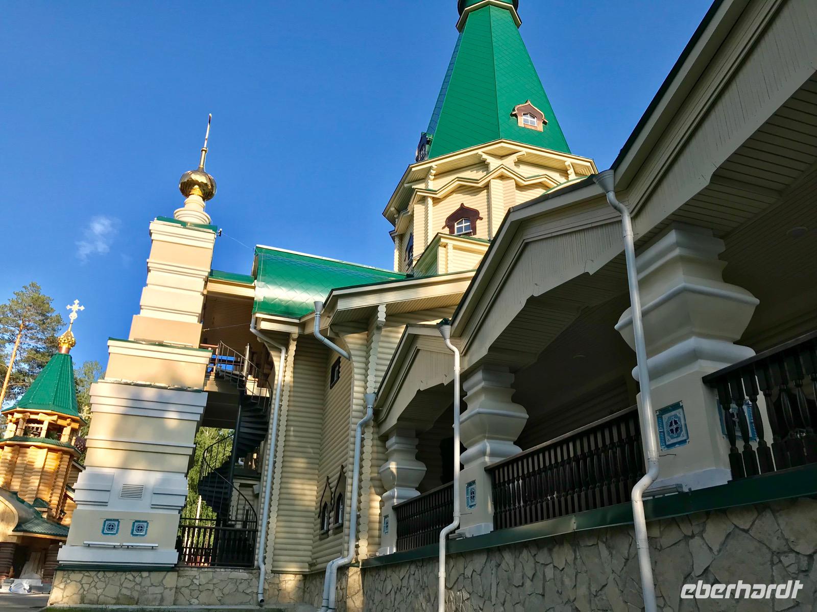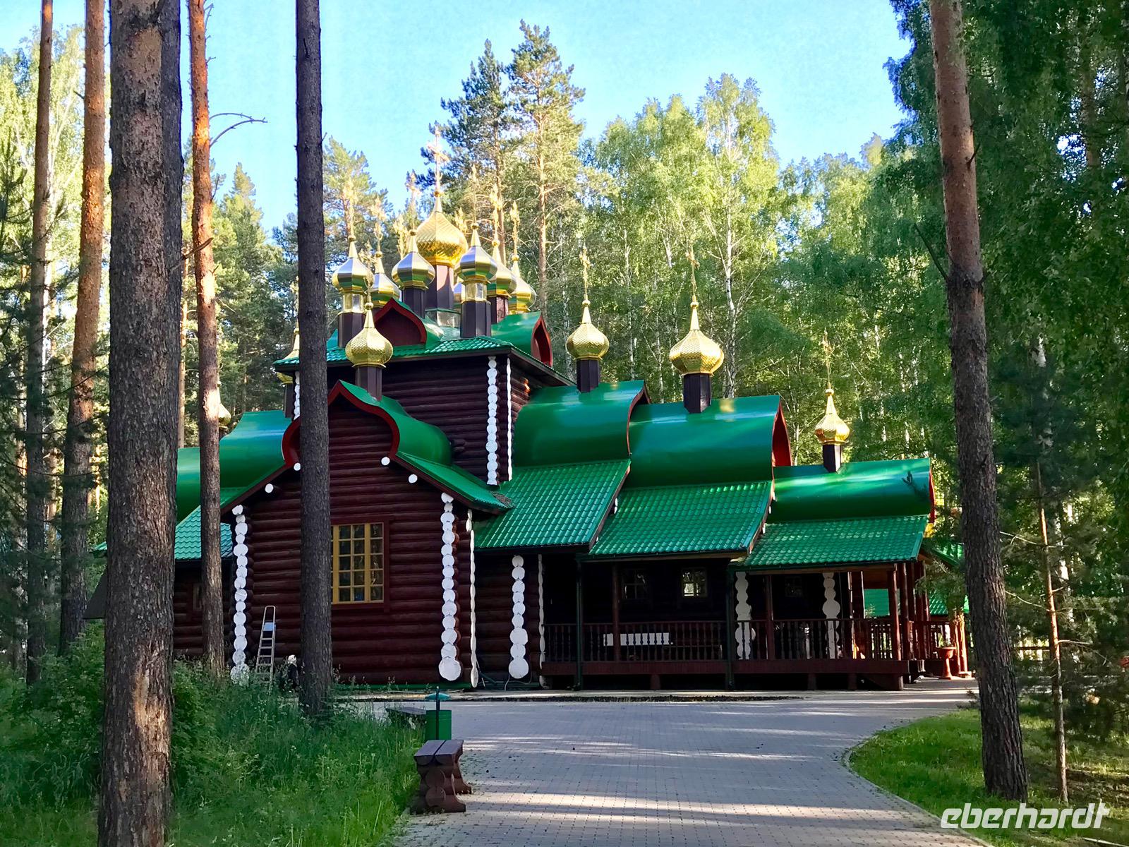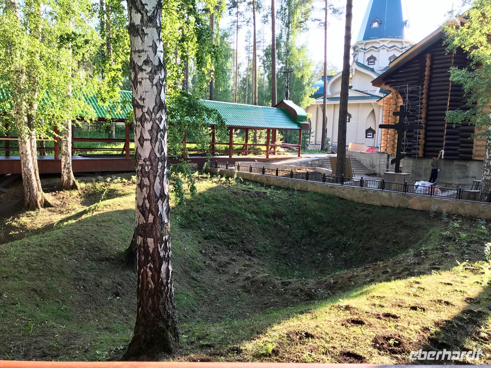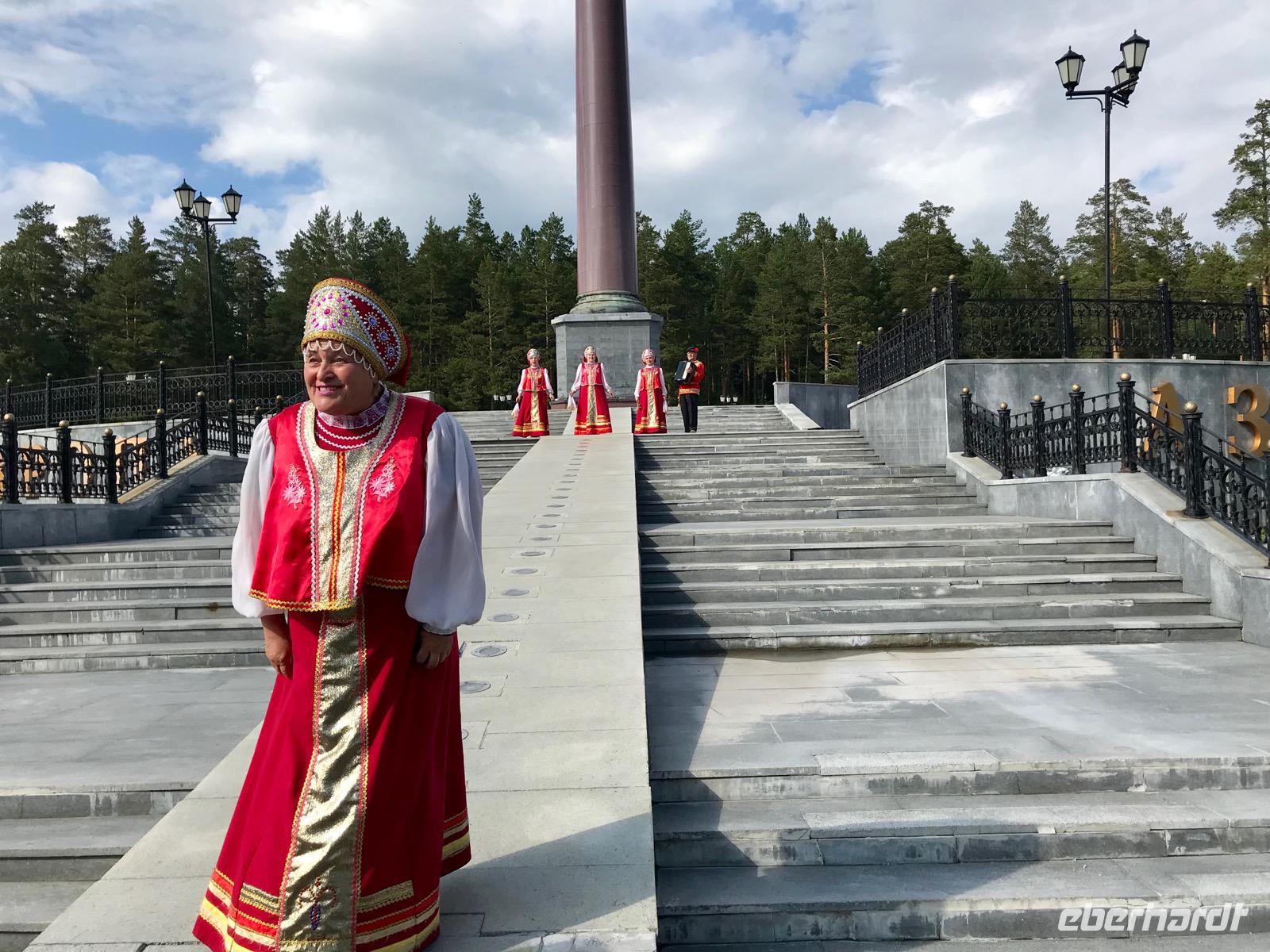 Auf unserem weiteren Ausflug widmen wir uns nunmehr einem eher traurigen Kapitel der Stadt. Im Jahre 1918 wurden auf einen Befehl Sverdlovs hin in der Stadt die Mitglieder der letzten Zarenfamilie der Romanovs mit ihren engen Bediensteten ermordet. Der letzte Aufenthaltsort der Romanovs war das Ipat'ev-Haus. In der Nacht vom 16. zum 17. Juli 1918 wurden im Keller des Hauses Zar Nikolaj II., Zarin Aleksandra und ihre Kinder Aleksej, Ol'ga, Tat'jana, Marija und Anastasija erschossen. An diesem Ort befindet sich heute die „Kirche auf dem Blute", die wir besichtigten. Es macht sich ein recht merkwürdiges Gefühl breit, wenn man an diese grausige Tat denkt. Die Leichen wurden noch in der Nacht zum Ort „Ganina Jama" (Ganjas Loch), etwa 40 km außerhalb der Stadt, gebracht, mit Säure übergossen und vergraben, anschließend am nächsten Tag wieder ausgegraben und einige Kilometer weiter im Wald an verschiedene Stellen verscharrt. Wir besuchen diesen Ort, wo in den letzten Jahren ein Kloster entstanden ist und der sich zu einem Wallfahrtsort entwickelt hat, Am Nachmittag fahren wir aus Ekaterinburg hinaus und halten zunächst an der Straße nach Moskau an, wo sich ein Denkmal für die Opfer des Stalinregimes befindet. Lange blieben die Toten und Ermordeten unerwähnt bis es endlich an der Zeit war, ihrer zu gedenken. Ein weiteres grausiges Kapitel russischer Geschichte. Weiter geht unsere Reise zur Grenzlinie zwischen Europa und Asien, wo es einen Obelisken in der Nähe der Stadt Pervouralsk gibt, der die Teilung der Kontinente markiert. Wir werden mit einem Glas Sekt begrüßt. Ein Folkloreensemble singt speziell für uns russische Lieder voller Lebensfreude und wir sind gespannt auf den Teil Asiens, der vor uns liegt. Bevor wir nach „Ganina Jama" kommen, halten wir bei einer russischen Familie am Wegesrand. Hier können wir hautnah erleben, wie die Menschen im Ural leben. Es bleibt nur eine kurze Zeit im Jahr, um den Garten zu bestellen. Umso mehr staunen wir, mit wieviel Mühe und Liebe der Garten angelegt wurde und wie Blumen und Gemüse prächtig gedeihen. Im Haus erwarten uns Tee und Blinys, die russischen Plinsen, mit Walderdbeeren, die uns die Hausherrin beschert. Ein guter Ort zum Ausruhen, Kennenlernen und gegenseitigem Verstehen.