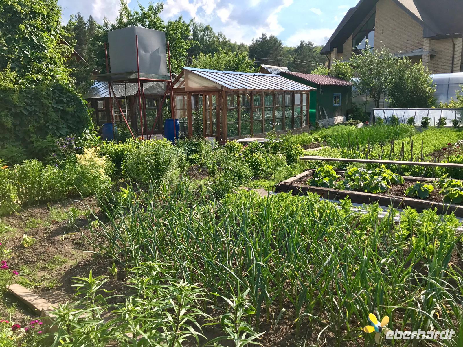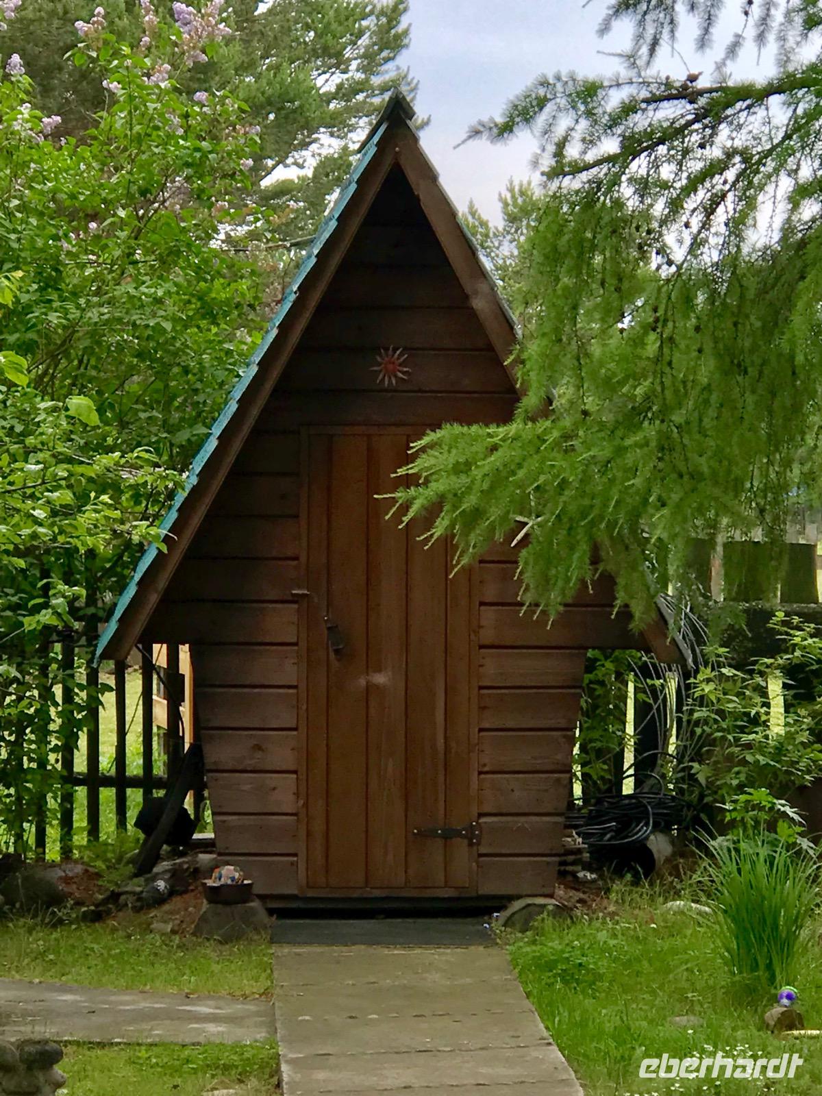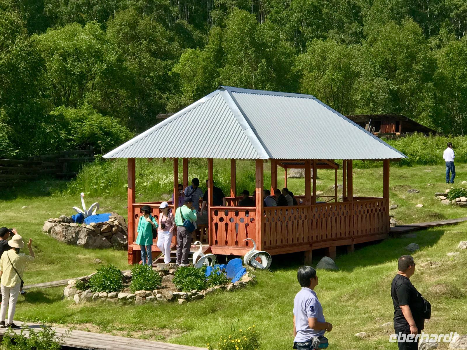 An einer Weggabelung erwartet uns Tat'jana. Sie hat für uns gekocht, gebraten und gebacken. Und es ist ein tolles Mahl, Borschtsch, Gurken, Tomaten und Paprika ganz frisch, Hühnchen mit Gemüse, Bratkartoffeln und Fisch aus dem Baikal, Apfelkuchen und Preiselbeertorte und ...ein Selbstgebrannter aus Kräutern. In Russland trinkt man solange man isst, das haben wir gelernt. Stolz zeigt uns Tat'jana auch den Garten, ausgerichtet auf Selbstversorgung, alles da, alles wächst und gedeiht, auch wenn die Blumen im Winter erfrieren, sie werden im Frühjahr neu gepflanzt. Und Tat'janas Mann führt uns durch die vielen Bauten auf seinem Grundstück, viel Handarbeit aus Holz und dazwischen die Schätze, alte Werkzeuge und was man auch sonst noch Antiquarisches an Haushaltsgeräten finden kann. Der Abschied naht und er fällt uns schwer. Da singen wir dann noch mit Veras Hilfe das Baikallied: Slavnoje morje, swjašcenij Baikal... (Herrliches Meer, o heiliger Baikal...). Tat'jana ist traurig, dass wir wieder gehen. Aber man muss im Leben immer Abschied nehmen, und so hoffen wir auf ein Wiedersehen, vielleicht... Danke Tat'jana für den wunderbaren Tag.
