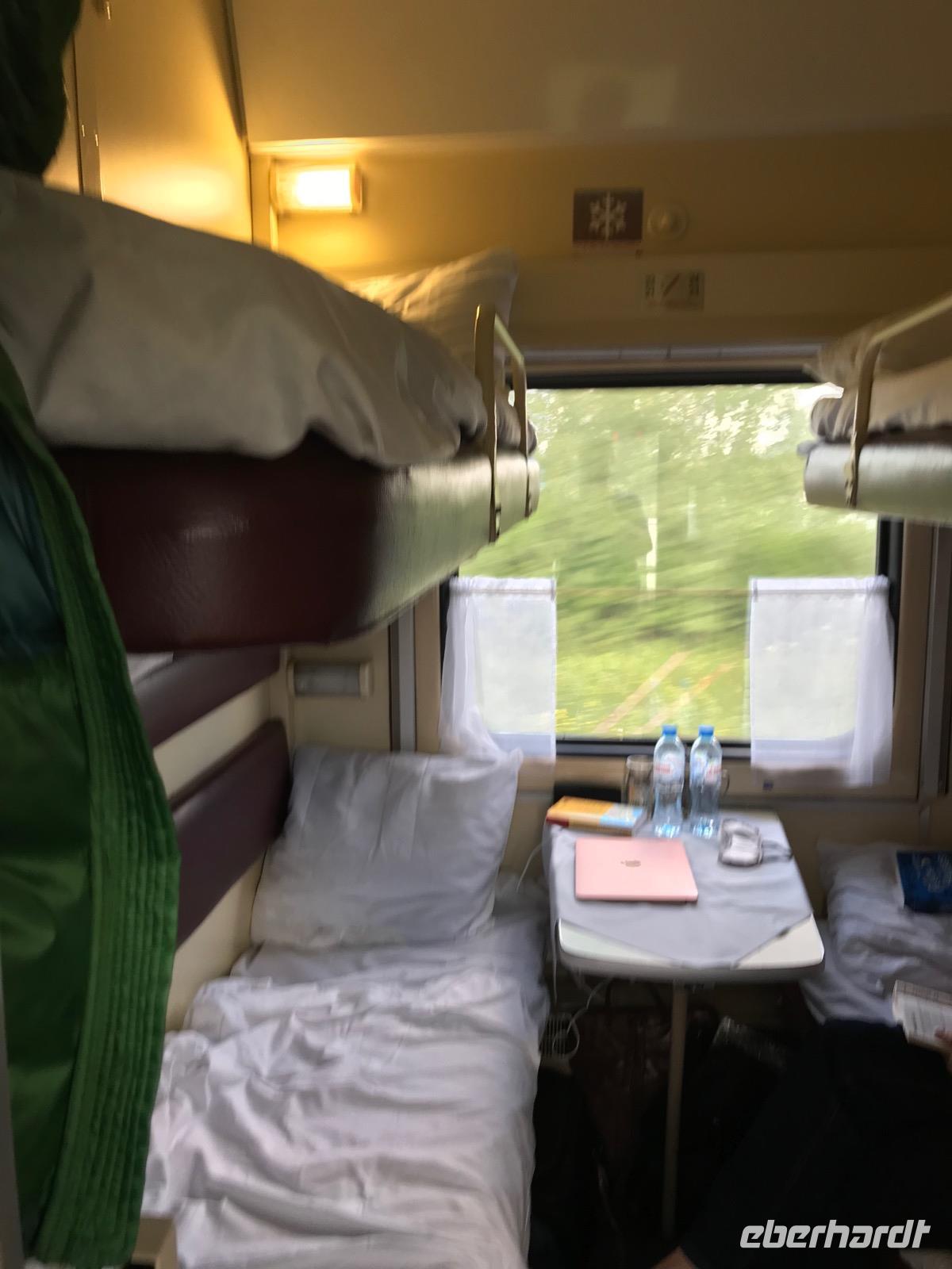 Um 20:50 Uhr beginnt unser großes Abenteuer am Kazaner Bahnhof, Zug Nr. 002. Einsteigen nur mit Pass und genauer Kontrolle der Fahrkarte, der Passnummer und des Lichtbildes. Bald sind wir geprüft und dürfen die Abteile betreten. Die Betten sind schon bezogen, das wird sich bald ändern und am Ende der Reise kann ein jeder von uns sein Bett auf engstem Raum beziehen. An dieser Stelle möchte ich mich von ganzem Herzen bei meinen Helferinnen bedanken, die mir bei jeder Etappe das Bett bezogen haben. Das hat mich sehr gefreut. Bevor der Zug losfährt, erhalten wir noch eine Einweisung, wie die Lichtschalter zu bedienen sind, wie die Klimatisierung arbeitet und wie der Fahrplan gelesen wird. Wenn früher der Fahrplan in Moskauer Zeit angegeben wurde, so kann man jetzt den Fahrplan mit lokaler Zeitangabe lesen. Die Überschreitungen der Zeitzonen sind auch eingezeichnet; wir werden davon mehrere erleben. Schon geht die Reise los, allen eine gute Nacht.