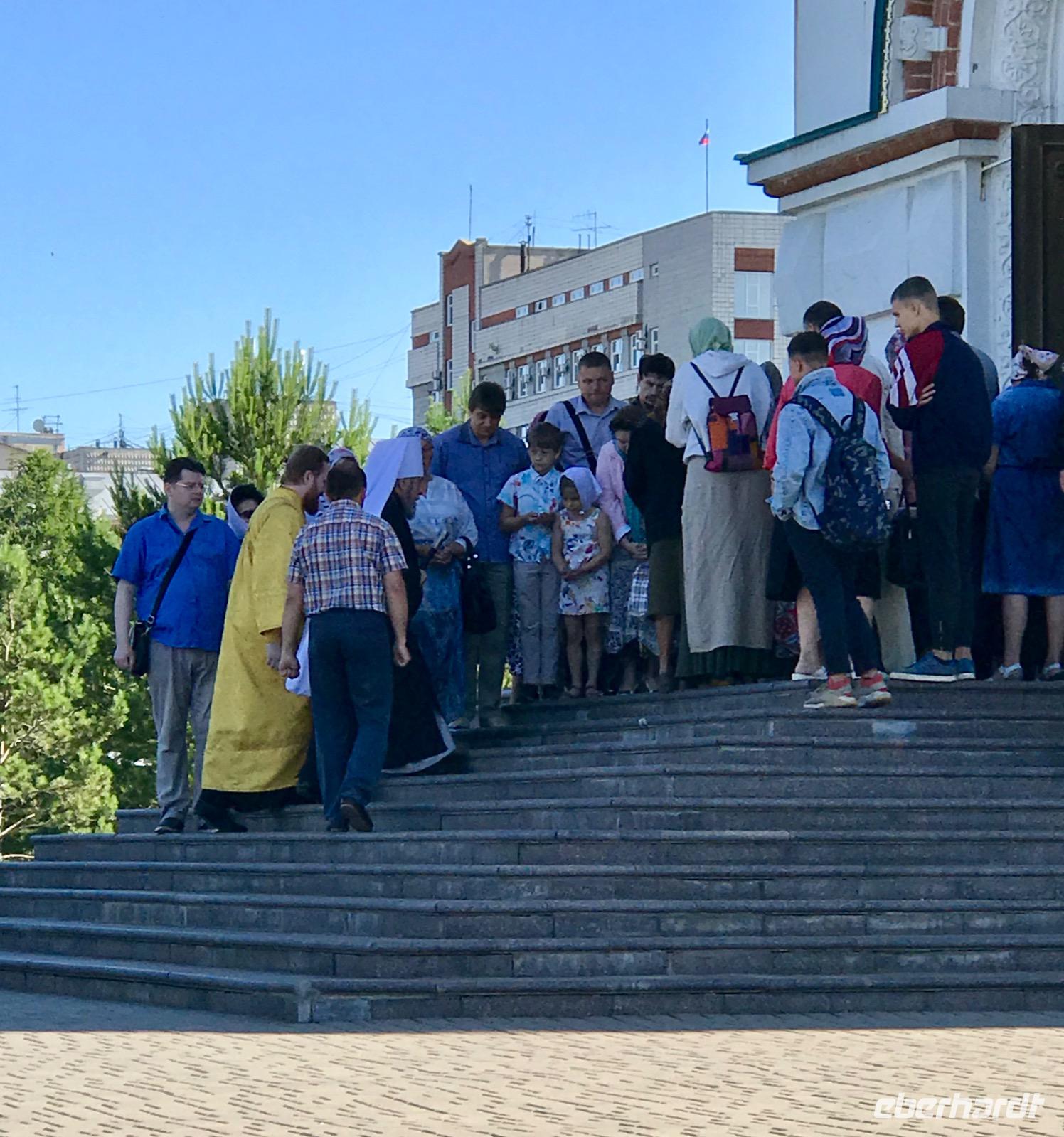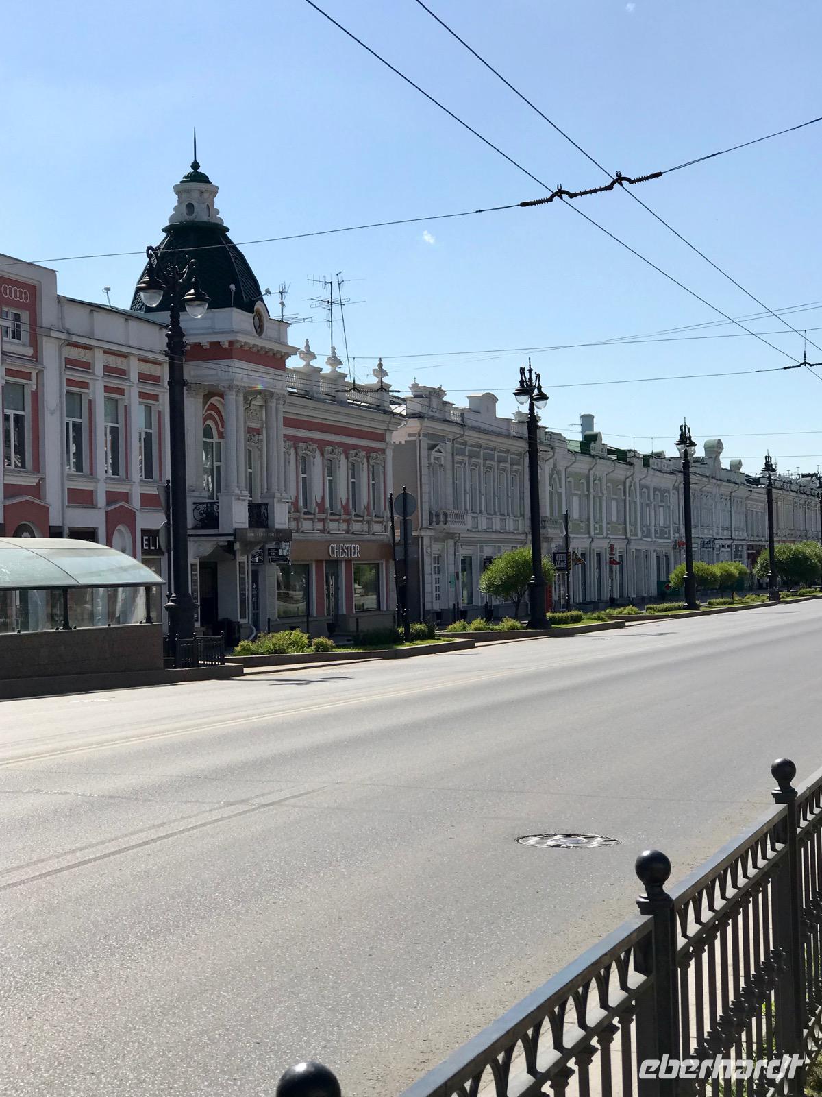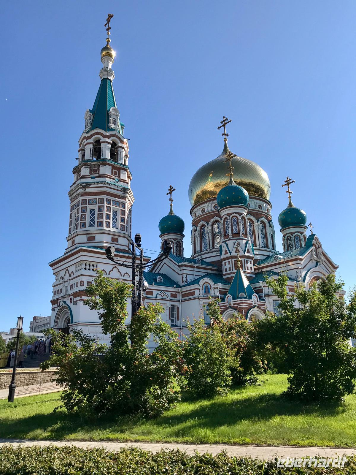 Es ist Sonntag und uns bleibt nicht allzu viel Zeit, bis wir wieder am Bahnhof sein müssen. Am Vormittag daher ein kurzer Stadtspaziergang. Es geht zunächst zu der Stelle, an welchem der Fluss Om' in den Irtyš mündet, dann zur Maria-Himmelfahrtskathedrale, wo die Gläubigen schon vor der Tür auf die Geistlichen warten. Noch schnell ein kurzes Hineinhören in den Gottesdienst und das Staunen über die wunderbaren Gesänge und Stimmen der Gläubigen, dann zur Neuen Festung am Nordufer des Om' und ein paar Worte zum Schriftsteller Dostojewski, der hier Jahre seiner Verbannung in der Festung verbrachte, dann zur Hauptstraße und ein Blick auf das Schauspielhaus und die Gemäldegalerie, die den Namen des Malers Michail Vrubel trägt, der aus Omsk stammte. Abschließend noch die Moskauer und die Omsker Handelshäuser ansehen - welche sind schöner? Schon ist die Abreise nahe. Eine schöne und auch idyllische Stadt ist Omsk an den Flüssen Om' und Irtyš. Einen Aufenthalt war es wert. Um 11.28 Uhr fährt unser Zug Nr. 070 in Omsk ab und am späten Abend kommen wir in Novosibirsk, der Hauptstadt Sibiriens, an. Wir bleiben im Hotel „Azimut Siberia".
