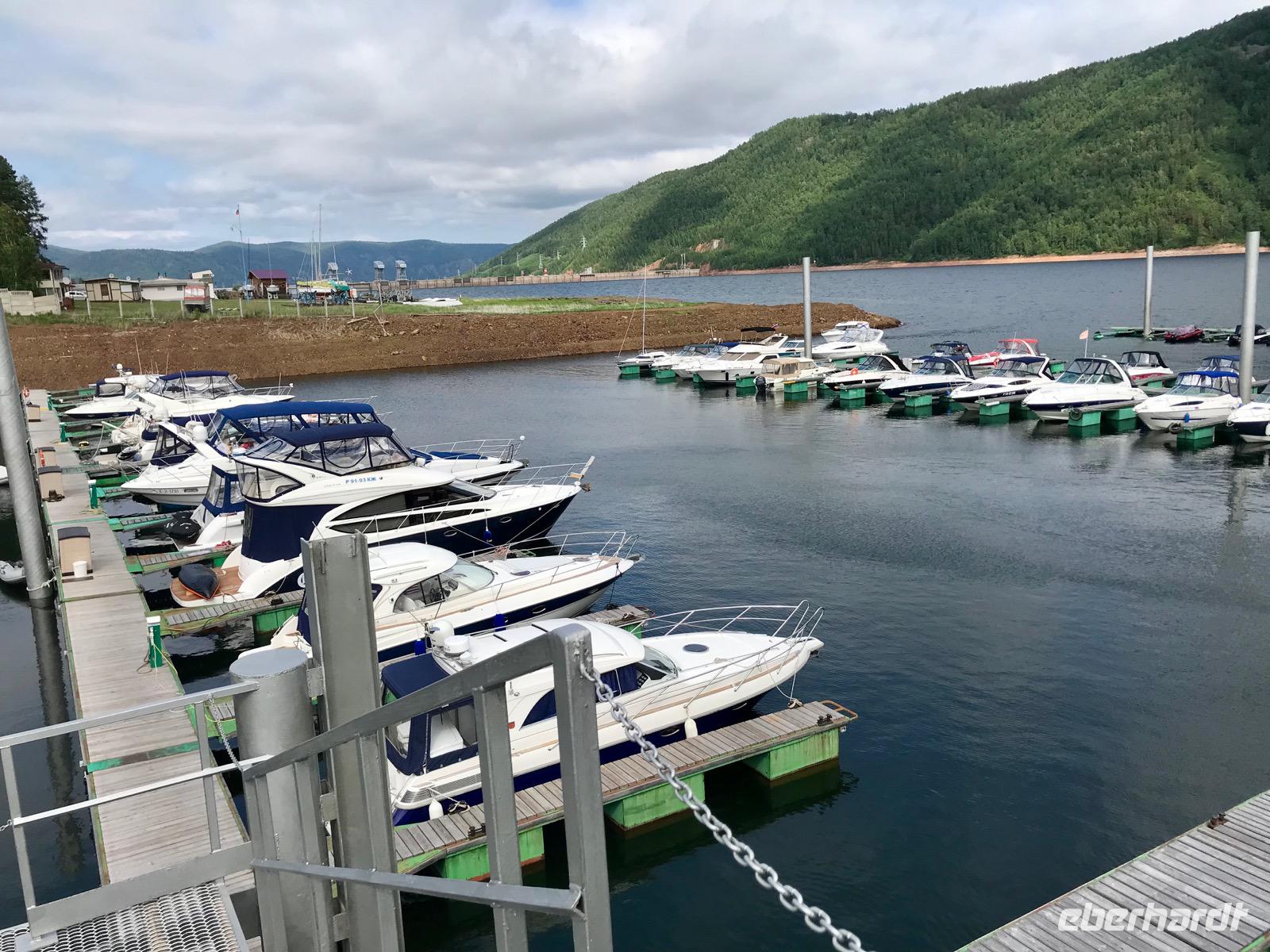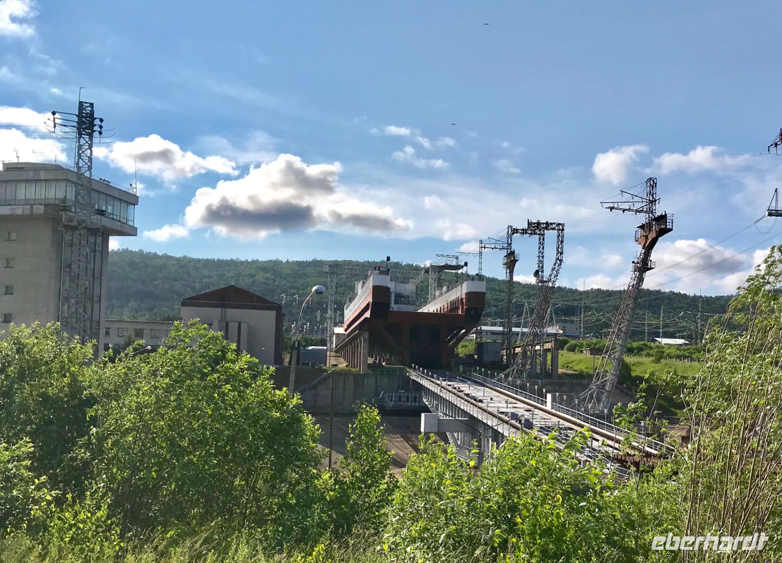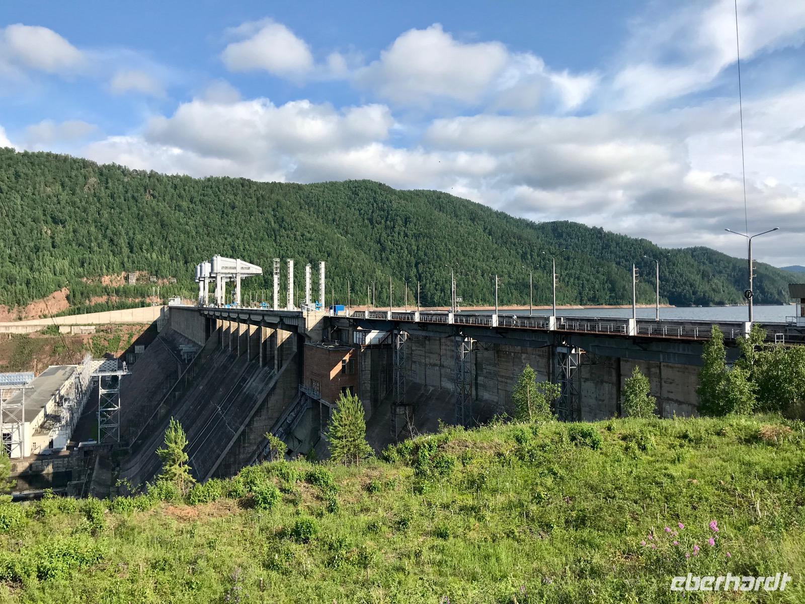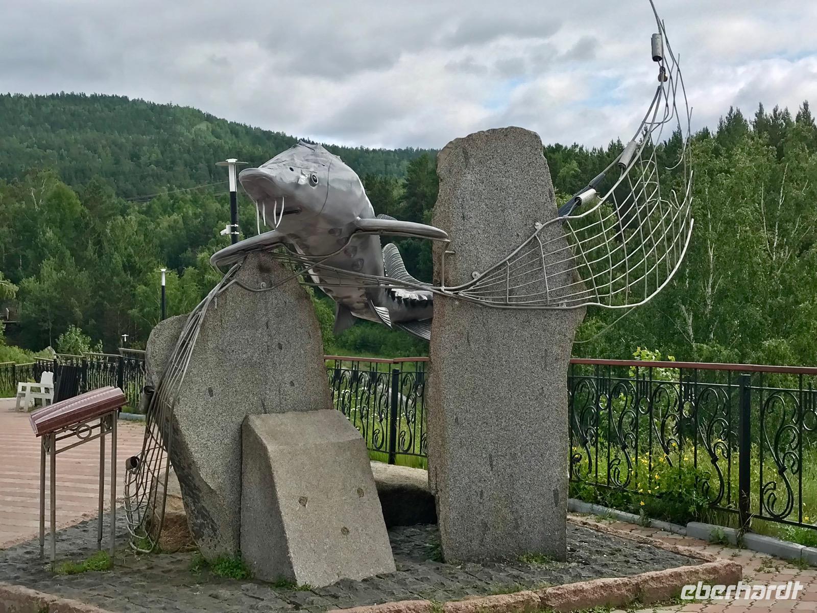 Wir werden am Bahnhof von der örtlichen Reiseleiterin Anna abgeholt. Nach dem Einchecken im Hotel „Krasnojarsk", direkt am zentralen Platz des Ortes, fahren wir schon bald an das Krasnojarsker Meer. Es ist kein Meer, sondern der Stausee oberhalb des Wasserkraftwerkes in Divnogorsk. Auf dem Weg dorthin halten wir an einer Aussichtsplattform auf der Silizneskij-Klippe über dem Enisej. Von hier hat man einen wunderbaren, ergreifenden Ausblick auf den majestätischen Fluss, der sich sein Bett durch das Tal der gebirgigen Landschaft gebahnt hat. Hier wurde 2004 die Skulptur Zar-Fisch, benannt nach der gleichnamigen Novelle des Schriftstellers Viktor Astaf'ev, aufgestellt. Unten am Enisej liegt das Dorf Ovsjanka, in dem Astaf'ev geboren wurde. Divnogorsk liegt etwa 35 km von Krasnojarsk entfernt. Hier wurde 1967 ein Wasserkraftwerk am Enisej in Betrieb genommen, das einen Meilenstein in der industriellen Erschließung Sibiriens darstellte. Es war damals das zweitgrößte Wasserkraftwerk Russlands. Die Staumauer ist 1072 Meter lang. Wir nehmen zunächst zwei Motorjachten und genießen einen einstündigen Ausflug auf dem Stausee, der knapp 400 km lang und von Bergen umgeben ist. Erst später betrachten wir das Wasserkraftwerk von der anderen Seite und versuchen die Funktion des Kraftwerks und des daneben erbauten Schiffshebewerks zu verstehen. Es ist ein schöner, entspannender Ausflug zum Genießen. Wasser, liebliche Landschaft, Sonne - was will man mehr. Am Abend machen wir noch einen kleinen Spaziergang die Springbrunnenkaskade hinab zum Enisejufer und erfreuen uns an der magischen Illumination der Springbrunnen am zentralen Platz und der Brücken am Fluss.