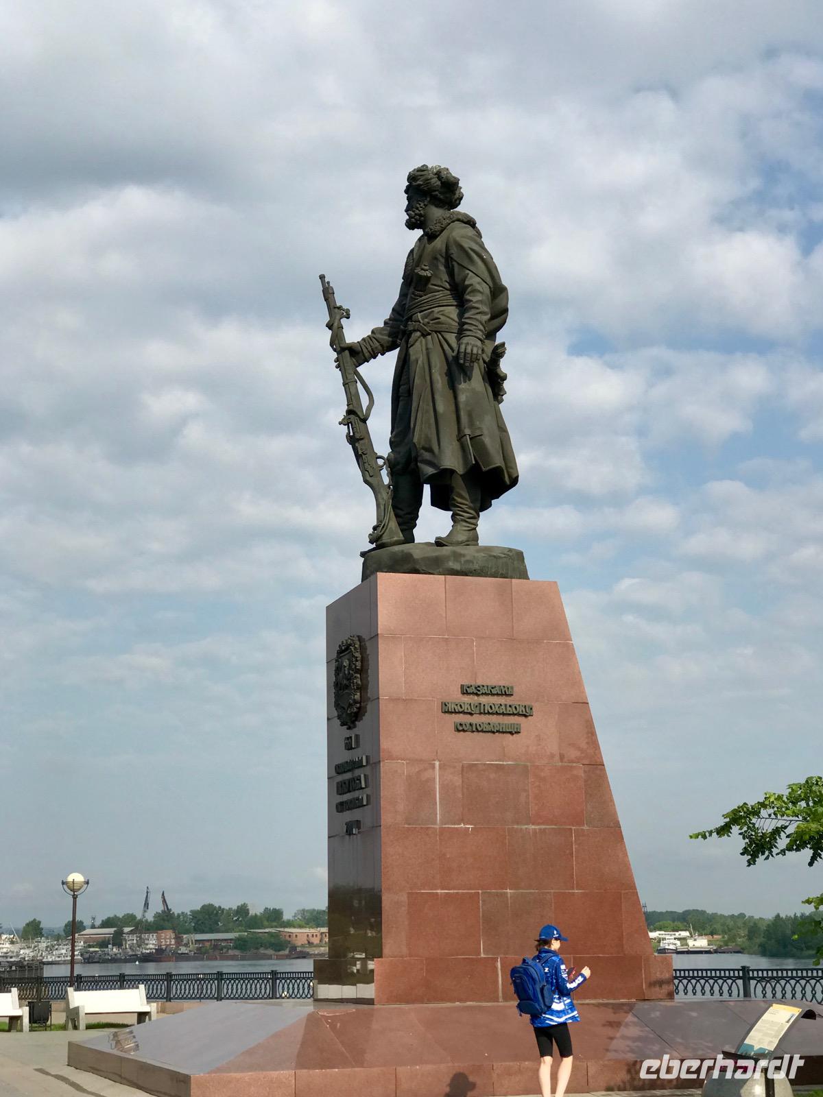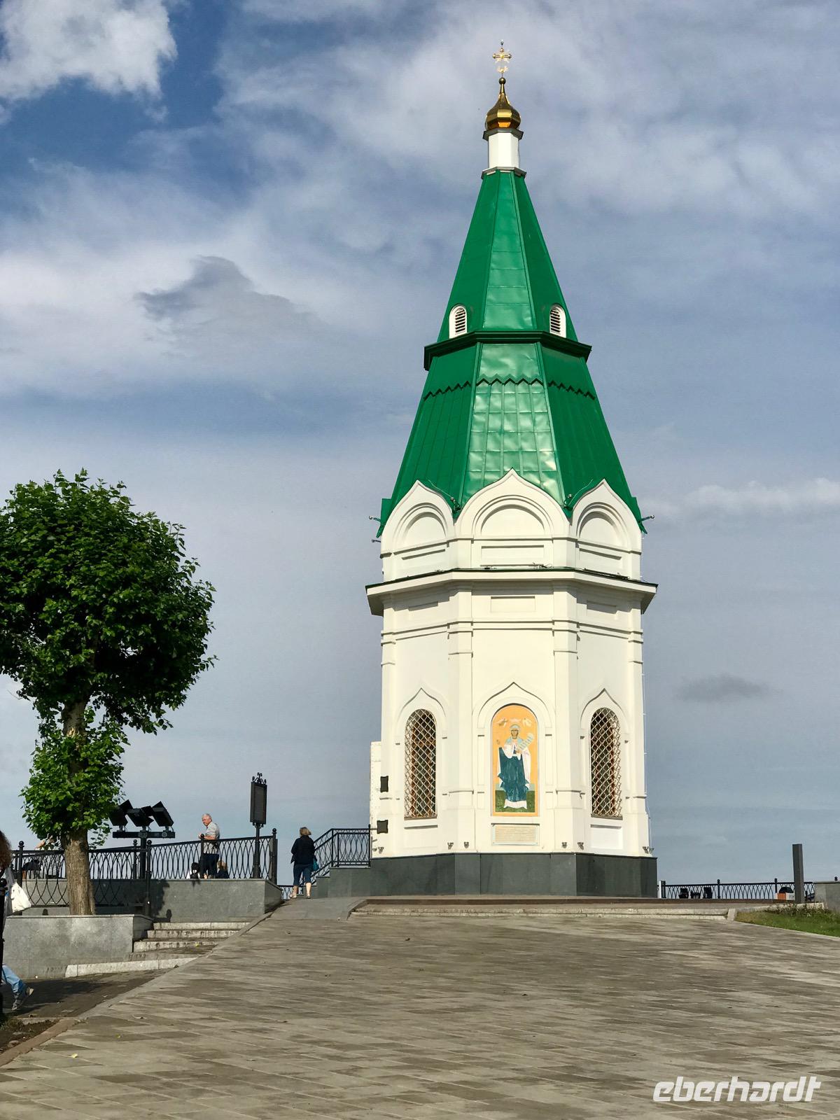 Wir haben nur wenig Zeit für einen Stadtspaziergang in Krasnojarsk. Unsere Reiseleiterin Anna führt uns zunächst zum Platz des Friedens, der durch das Kulturzentrum an der Strelka (Gabelung) bestimmt wird. Hier mündet der Fluss Kaca in den Enisej und hier etwa stand die alte Festung. Eine Fußgängerbrücke führt zur Tatyšev-Insel mit einem Park, die vom Enisej eingebettet ist. Wir gehen jedoch noch vorbei am Denkmal für Nikolaj Rezanov, dem Gründer der Russisch-Amerikanischen Handelsgesellschaft und hören die traurige Liebesgeschichte mit der Tochter des spanischen Gouverneurs in Los Angeles. Weiter auf der Promenade am Ufer des Enisejs steht die Skulptur eines Kosakenpferds. Der Kosakenführer Andrej Dubenskij gründete 1628 am linken Enisejufer das Fort „Kransnij Jar", was soviel wie roter Abhang bedeutet. Wir kommen noch vorbei am Dampfschiff St. Nikolaj, das 1891 den künftigen Zaren Nikolai II. und sechs Jahre später Wladimir Lenin beherbergte. Später fahren wir hinauf auf den Hügel, wo sich in den Anfangsjahren der Stadtgründung ein Wachturm und Aussichtspunkt der Kosaken befand, denn sie mussten stets vor den einheimischen Volksstämmen auf der Hut sein. Heute befindet sich hier die Paraskeva-Kapelle. Der Hügel ermöglicht einen phantastischen Blick auf die Stadt. Schließlich fahren wir noch durch das Stadtzentrum, erfahren einiges über die alten Kaufmannshäuser, über den Maler Vasilij Surikov, der hier geboren und gelebt hat, und besuchen eine alte Apotheke aus dem 18. Jahrhundert.