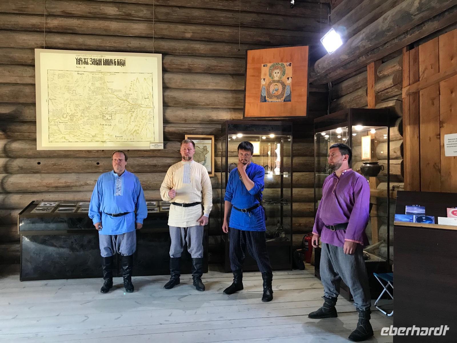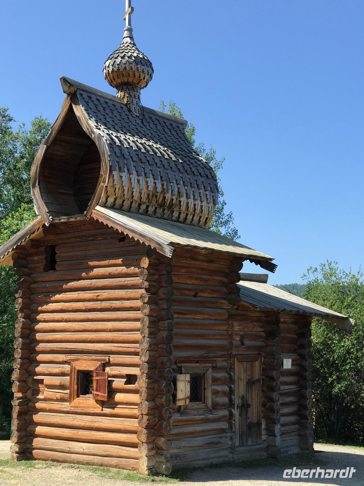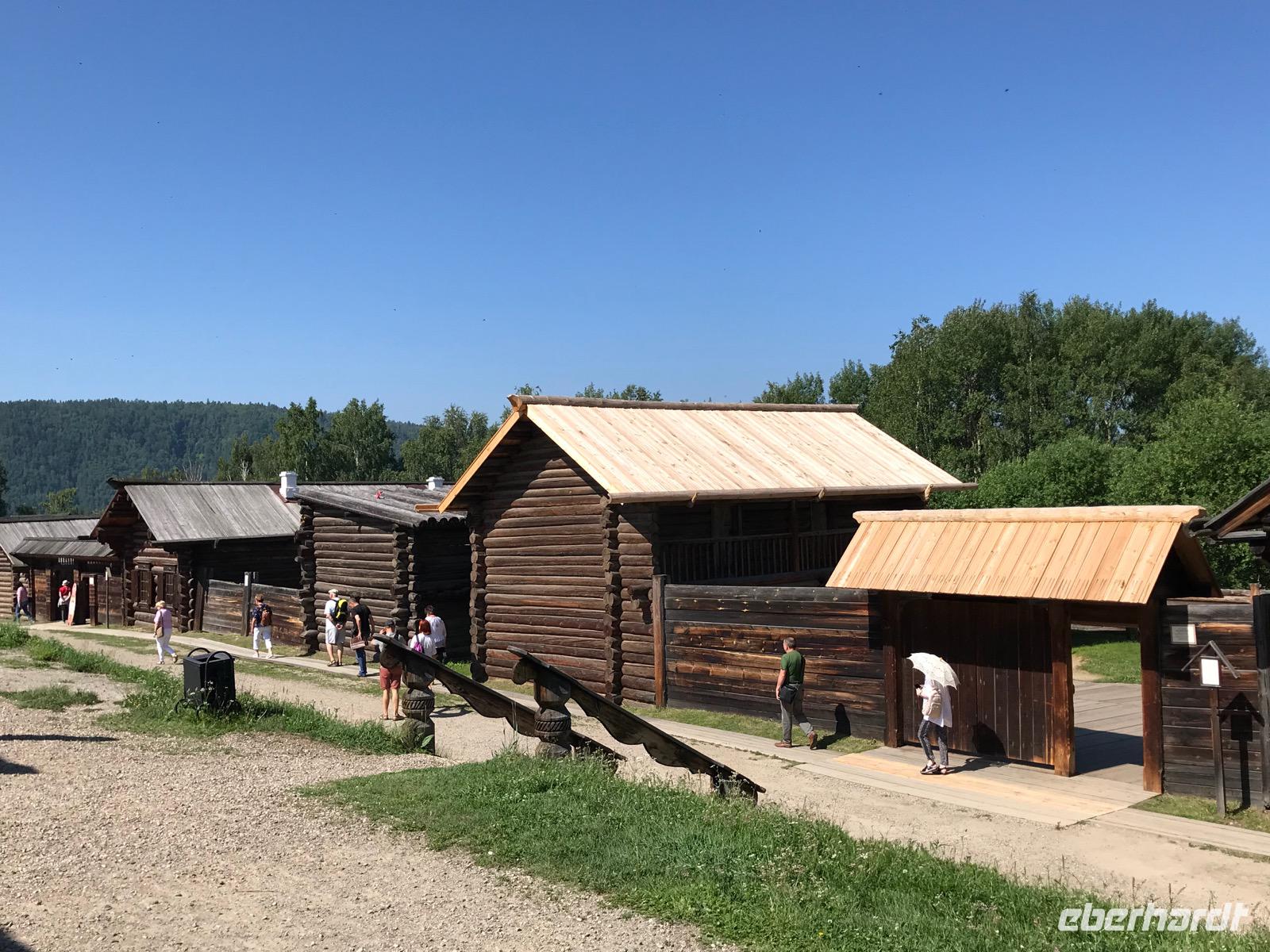 Am Morgen fahren wir mit dem Bus nach Listvjanka am Baikalsee. Unterwegs halten wir im Freilichtmuseum Tal'cy. Den Besuch hat unser Reiseveranstalter als WOW eingebaut, ein besonderes Extra der Reise. In Tal'cy sind aus mehreren Jahrhunderten und aus verschiedenen Orten typische Holzhäuser gesammelt und neu aufgestellt worden. Insbesondere als die Angara angestaut worden ist, sind ganze Dörfer überflutet und verloren gegangen. Wir wandeln die Dorfstraßen des Museums entlang und sehen uns an, wie die reichen und armen Bauern und die Kosaken gewohnt haben. In der Dorfkirche empfängt uns ein Kosakenchor und in der Dorfschule werden wir an die Kindheit unserer Eltern und Großeltern erinnert. Wir haben Freizeit und können eine kurze Pause an der Angara genießen, bevor uns Soljanka und Bliny vor einem Teehaus zum Essen verführen.