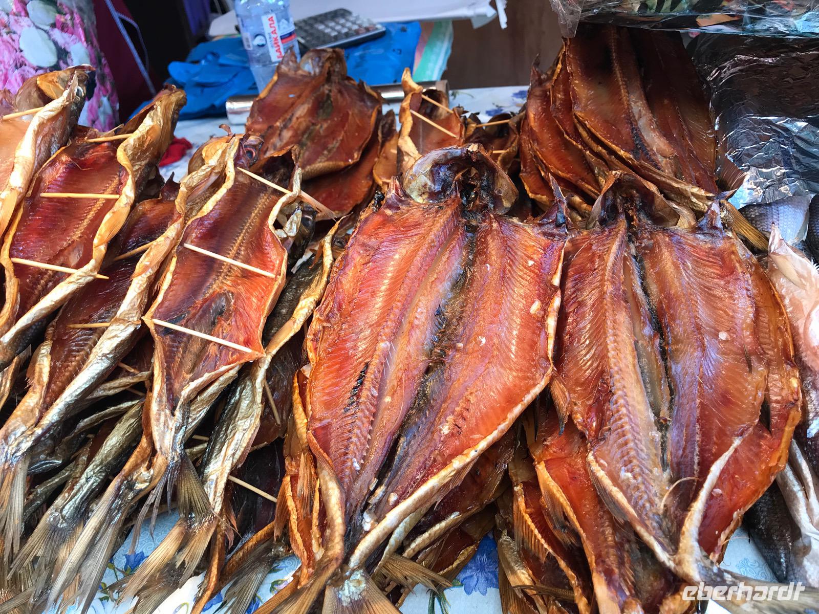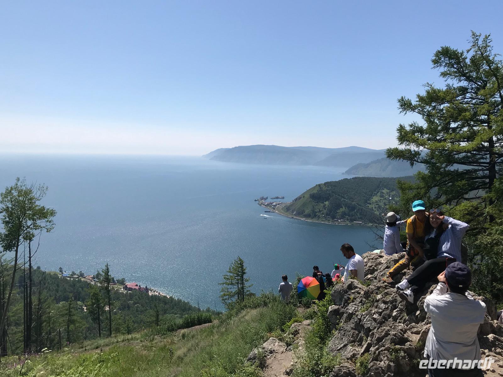 Schon bald geht die Fahrt weiter nach Listvjanka. Wir haben das Ziel unserer langen Reise auf der Transsib sehr bald erreicht und sehen zum ersten Mal den Baikalsee. Genau an der Stelle, wo die Angara den See verlässt und wo in mitten des Flusses der Schamanenstein liegt, gehen wir mit Vera an den Strand und begrüßen auf alte burjatische Weise Väterchen Baikal, mit einem Wodka natürlich und man darf das Tröpfeln nicht vergessen. Dann fahren wir in das Fischerdorf hinein, das sich langsam zum Touristenort wandelt. Den Ort können wir sehr gut von oben betrachten. Ein Sessellift bringt uns hinauf auf den Cerskij-Berg. Wenige Meter weiter liegt der Cerskij-Felsen, wo wir eine wunderbare Aussicht auf den Baikalsee haben. Wieder im Tal angekommen, besuchen wir den Fischmarkt und sehen den Omul', den Baikalfisch, frisch, geräuchert und in allen Variationen. Aber es gibt auf dem Markt auch Schmuck aus Edelsteinen und so manch einer von uns kann den bunten Steinen nicht wiederstehen. Mögen sie Glück und Gesundheit bringen. Am Abend erreichen wir unser Hotel „Krestovaja Pad''".