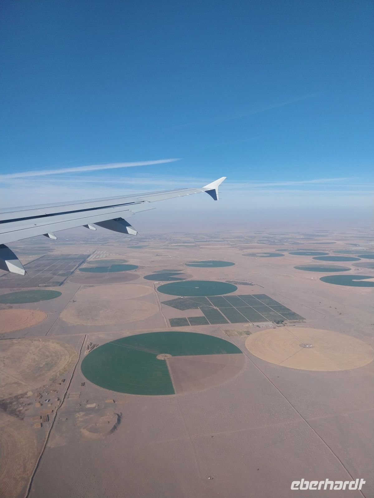 Pünktlich um 9.00 Uhr kommen wir zur Öffnung des saudischen Nationalmuseums. Das Museum spannt einen weiten Bogen von der Erdgeschichte mit Meteoritenfunden, der Steinzeit, altarabischen Königreichen über die Entwicklung des Islam bis zur Gründung des saudischen Königreiches. Bei diesen vielen Themen braucht Fauwaz mit der Museumsführung länger als geplant. Schnell ist es 12.00 Uhr. Um 14.00 startet unser Flieger nach Tabuk und wir brauchen eine Stunde bis zum Flughafen. Also jetzt „jallah“, das wird eng. Letztendlich bekommen wir noch unseren Flug. Pünktlich erreichen wir Tabuk im Nordwesten. Beim Landeanflug auf Tabuk sind sehr schön Bewässerungskreise zu sehen. Die riesigen grünen kreisförmigen Flächen entstehen durch die künstliche Bewässerung.
