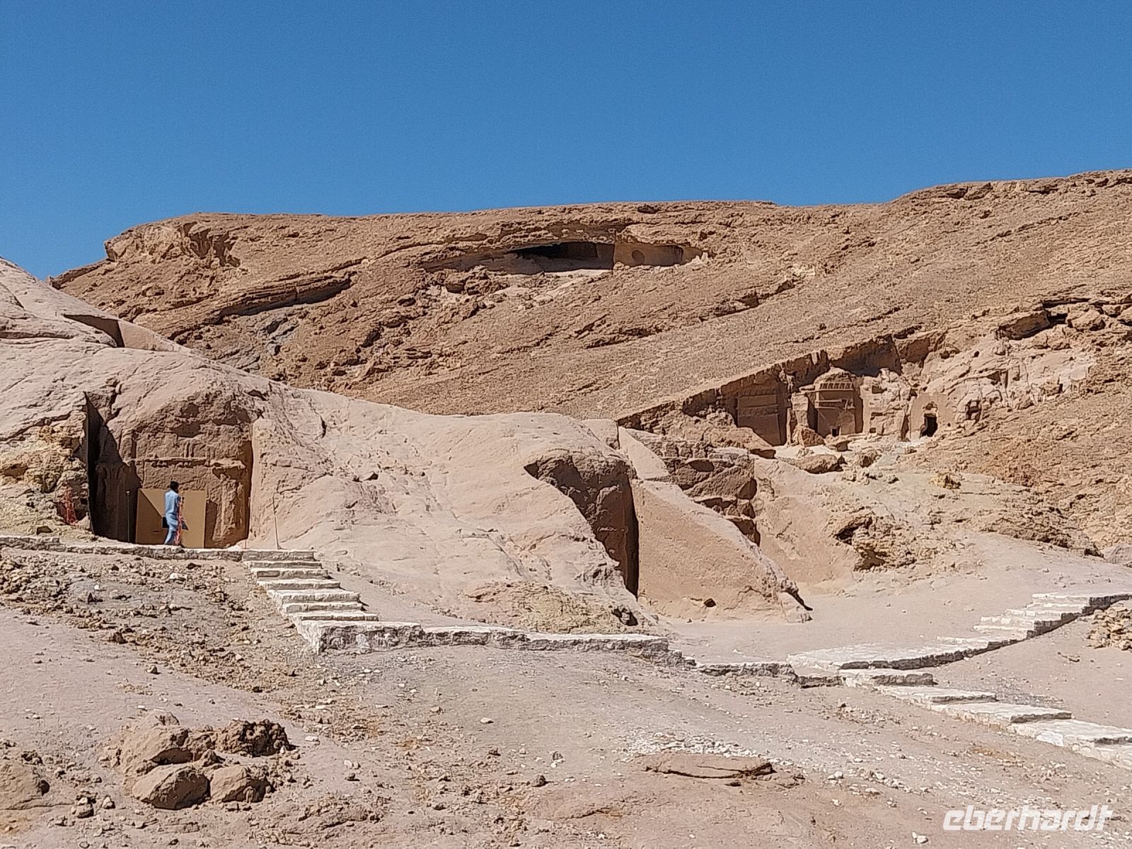 1.) Jebel Al Ahmar (roter Berg). In einem der hiesigen Gräber wurde 2014/2015 ein weitgehend vollständiges Frauenskelett entdeckt. Die nabatäische Frau hieß laut Grabinschrift Hinat. In einem aufwendigen Computer gestützten Verfahren wurde ihr Gesicht rekonstruiert (wird im Besucherzentrum gezeigt). Im gleichen Grab haben die Archäologen Überreste von weiteren etwa 80 Individuen entdeckt.