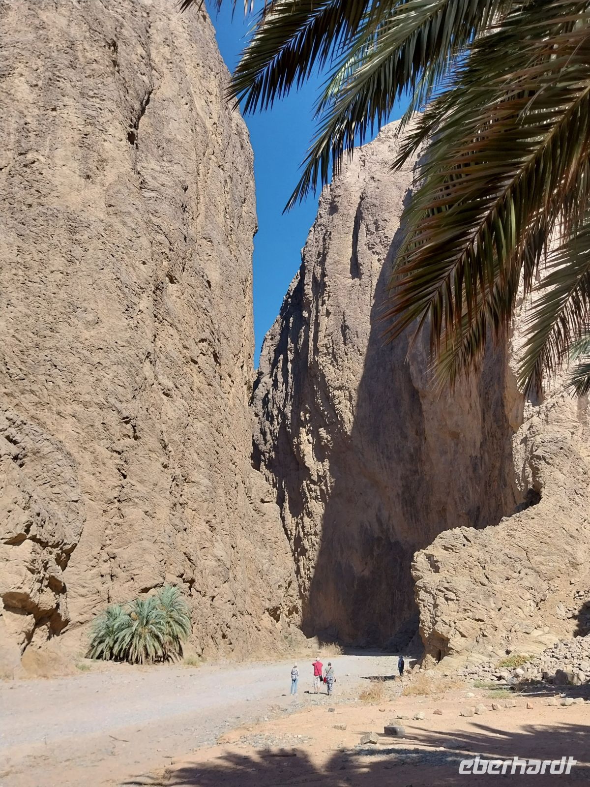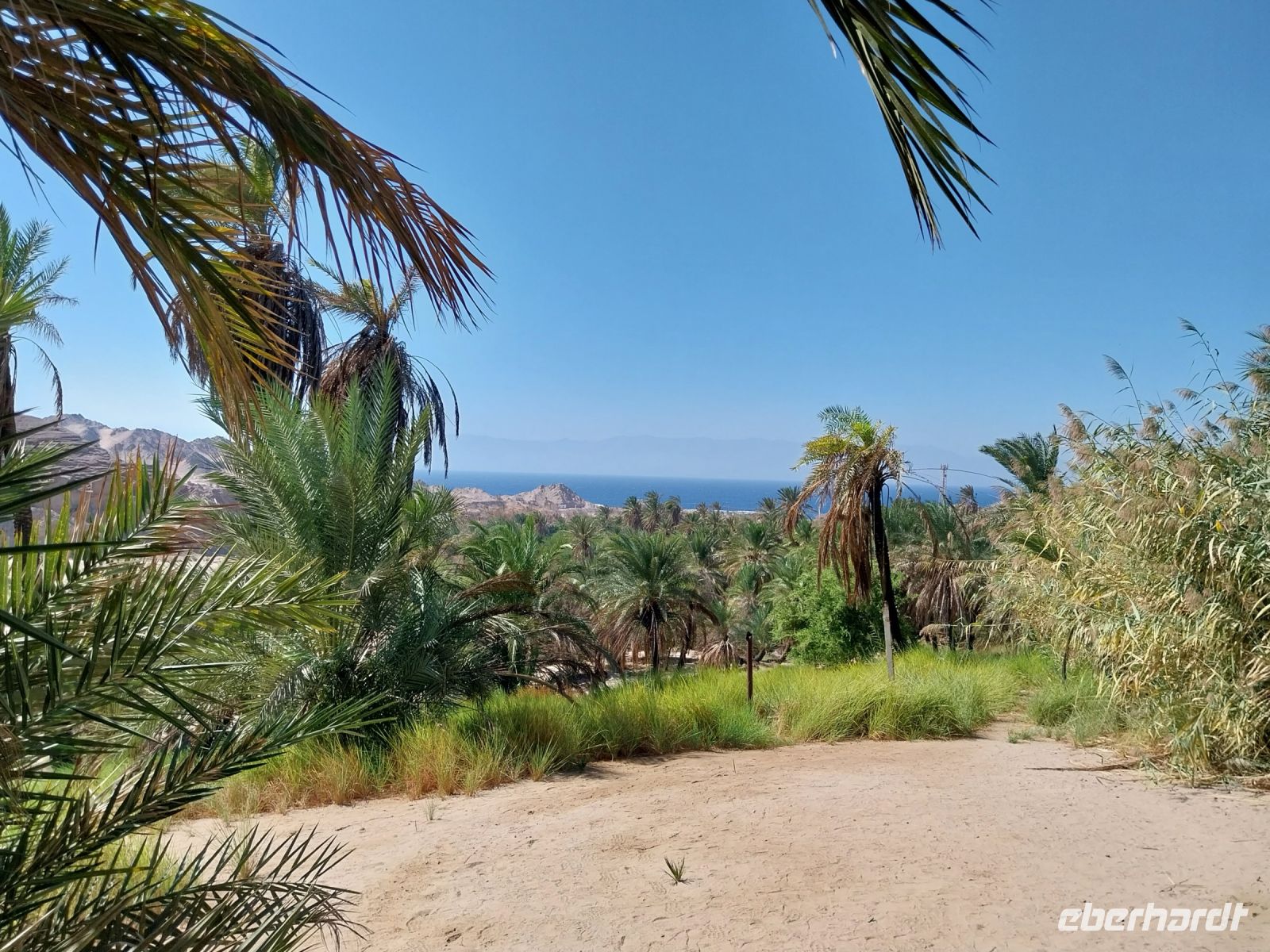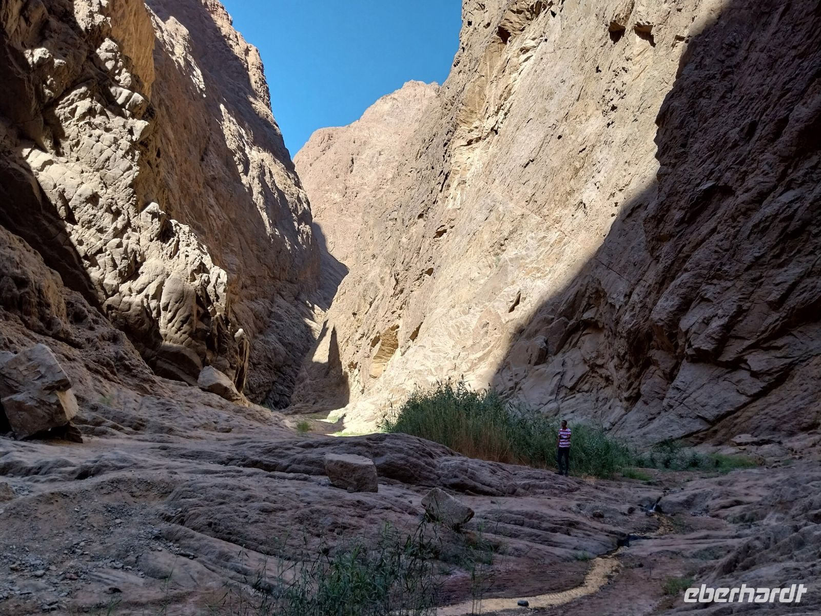Nachdem wir zwei Checkpoints passiert haben, erreichen wir direkt an der Küste den Zugang zu der 25 km langen Schlucht Tayib Ism. Natürlich war auch hier Moses – nach hiesiger Überzeugung kam Moses nach seiner Flucht aus Ägypten durch das Rote Meer genau an dieser Stelle an Land.