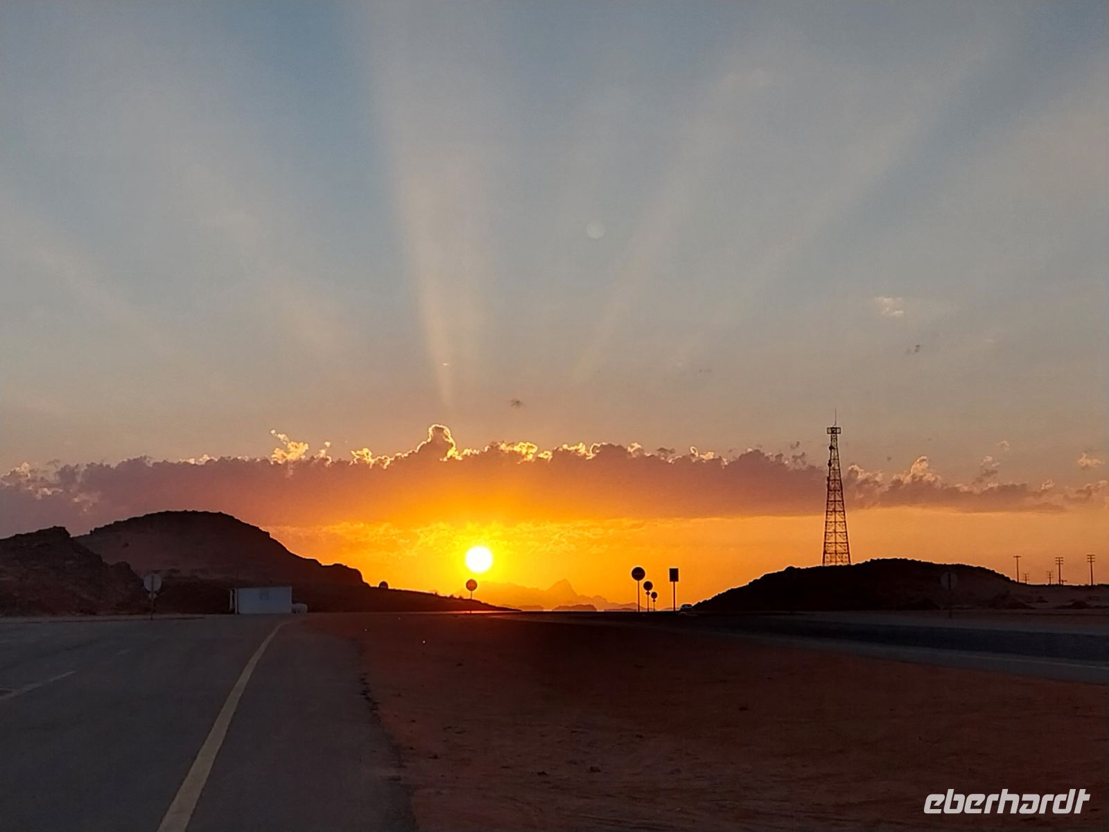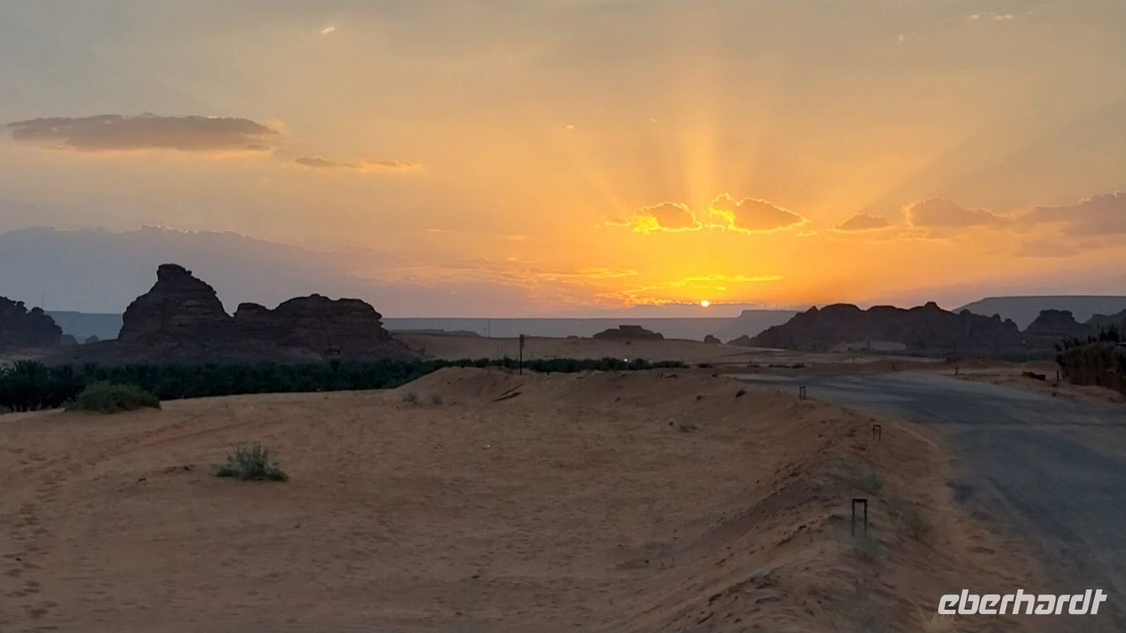 Am Nachmittag treten wir die Rückfahrt nach Tabuk an. Mit der tief stehenden Sonne im Rücken haben wir noch einmal schöne Perspektiven auf diese tolle Bergwelt. Während eines Halts vor Tabuk können wir einen schönen Sonnenuntergang erleben. Es ist damit auch Gebetszeit. Gern geben wir unseren Begleitern die Zeit für´s Gebet. Da es sich um einen Gebetsplatz im Freien handelt, können wir ihr Gebet auch gut verfolgen.
