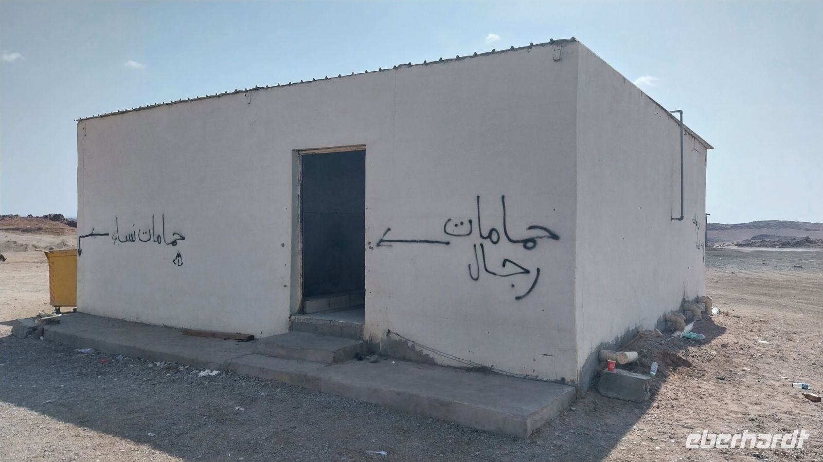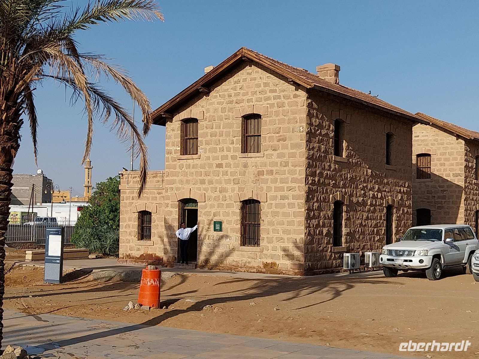 Bevor wir Tabuk verlassen, halten wir noch am historischen Bahnhof der Hedschasbahn. Im Lokschuppen gibt es eine kleine Ausstellung mit einer Originaleisenbahn. Tabuk war zu osmanischer Zeit eine wichtige Station der Pilgerbahn mit Versorgungseinrichtungen und sogar einem Gefängnis. Die Bahnstrecke verlief von Damaskus (mit Anschluss nach Norden an die Bagdadbahn) bis nach Medina. Der 1. Weltkrieg und regionale Konflikte führten allerdings zum schnellen Ende der Hedschasbahn.