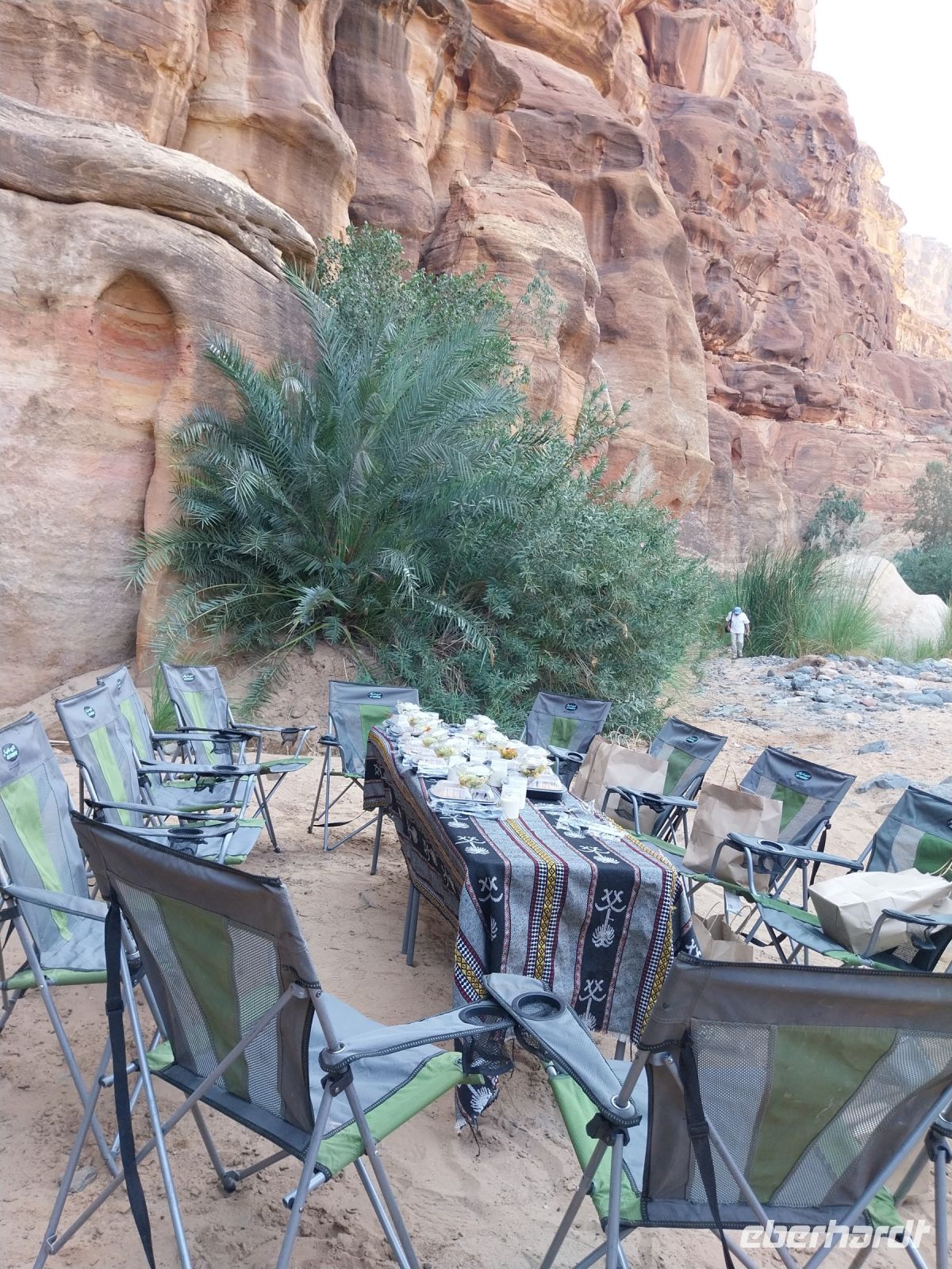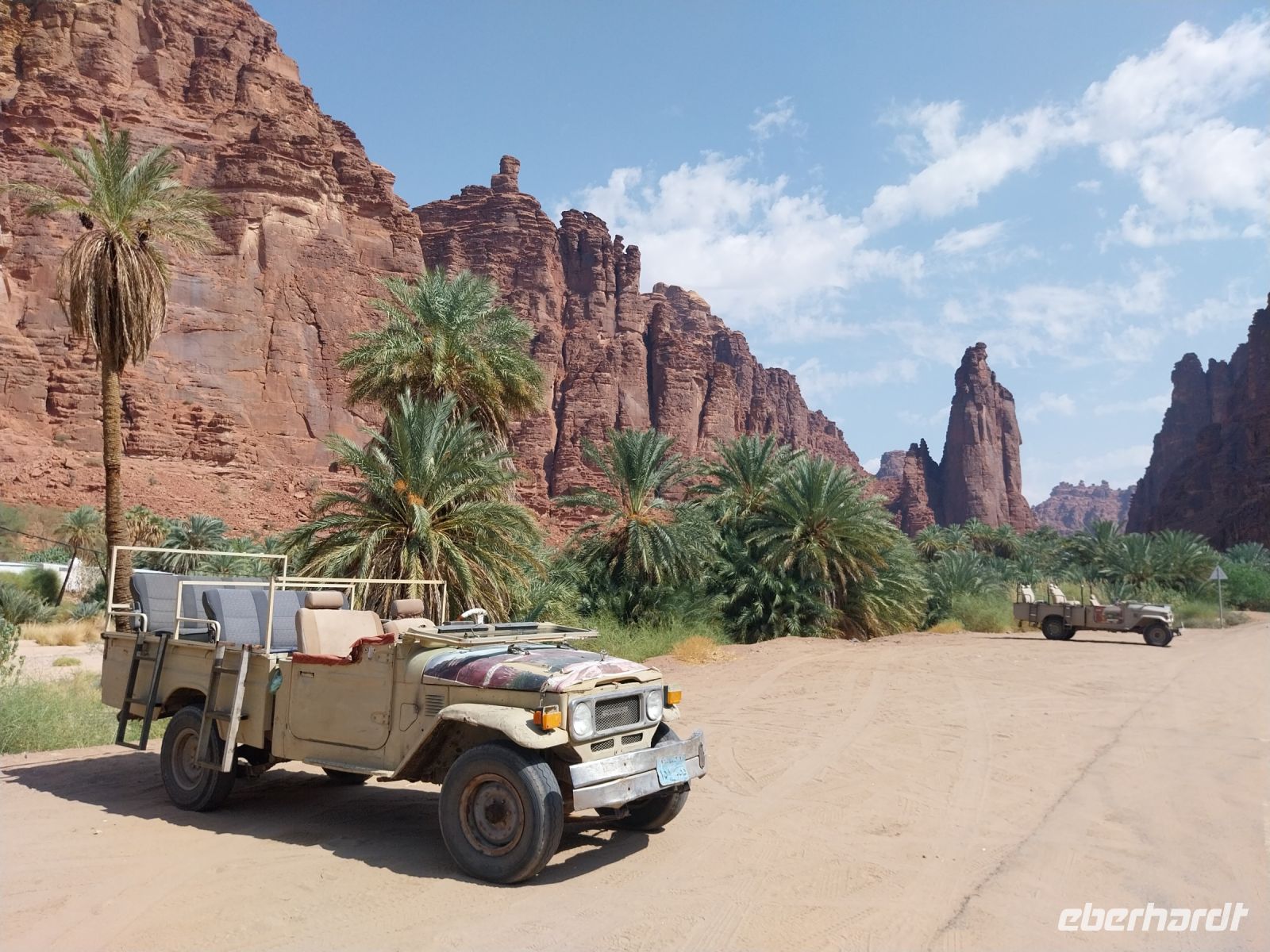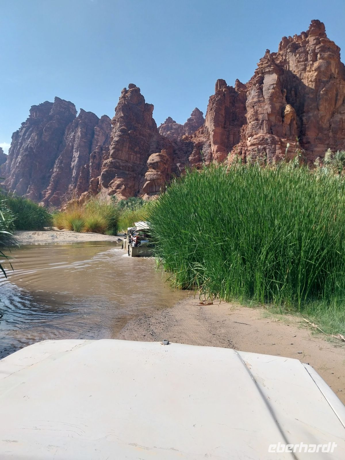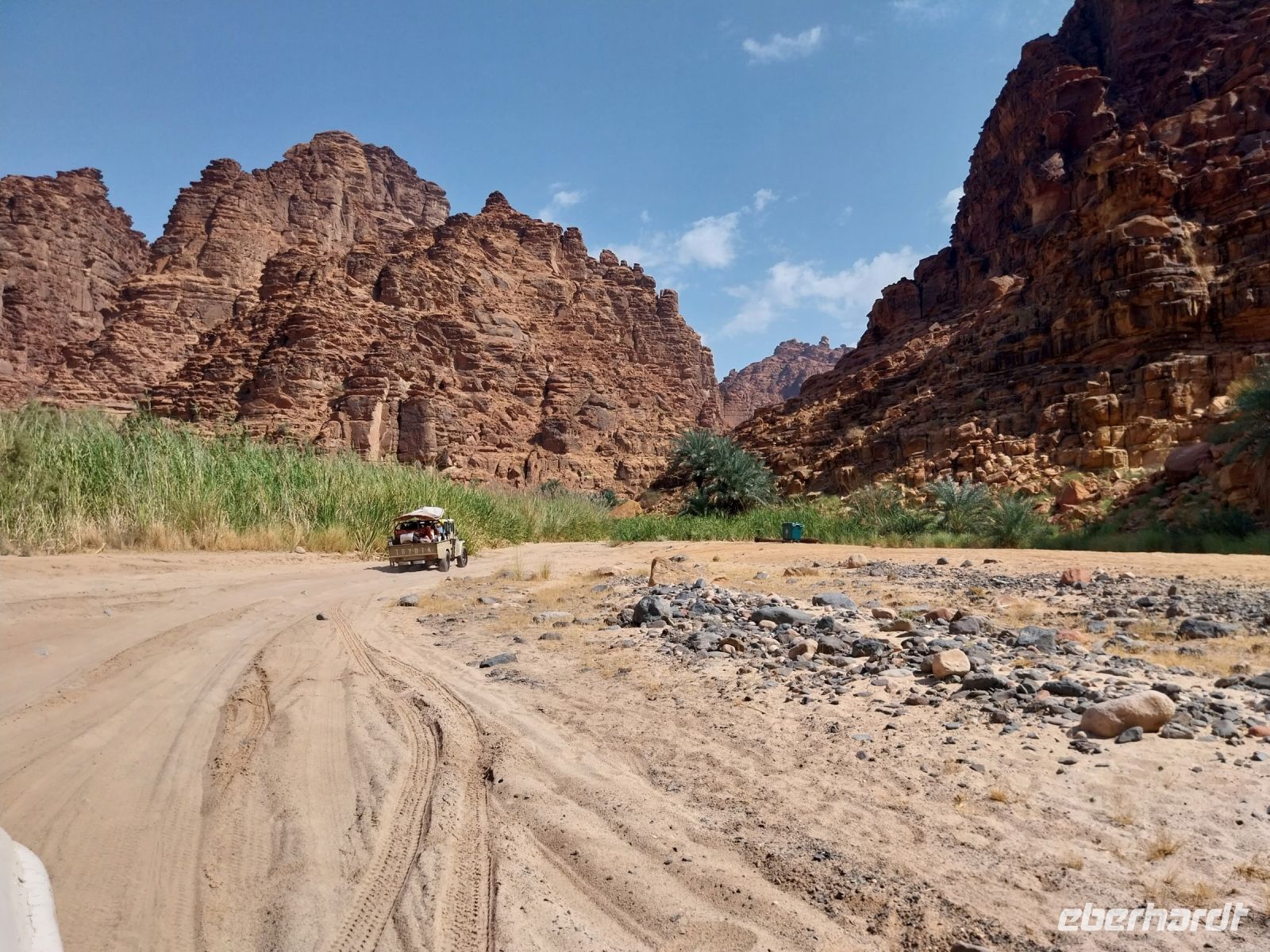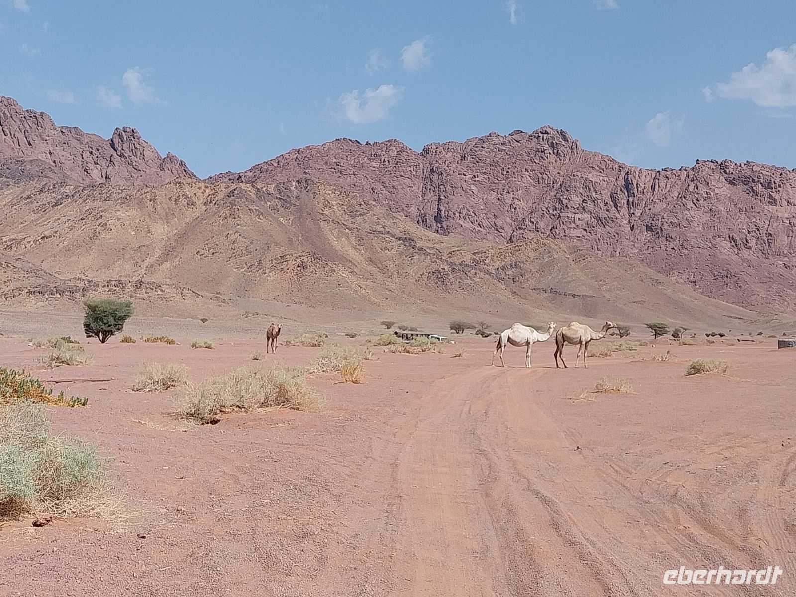 Wir verlassen Tabuk Richtung Wadi Dissah. Unterwegs begegnen wir öfters Kamelen. Auch bieten sich immer wieder schöne Aussichten auf die Bergwelt, besonders als wir eine imposante Serpentinenstraße hinunter fahren. Die Mittagszeit verbringen wir im Wadi Dissah, welches zu den spektakulärsten Landschaften in Saudi Arabien zählt. Es handelt sich um eine ca. 15 Kilometer lange Schlucht. Einzelne Klippen ragen bis zu 500 Meter in die Höhe. Stetig fließendes Wasser sorgt für eine üppige Vegetation im Wadi.