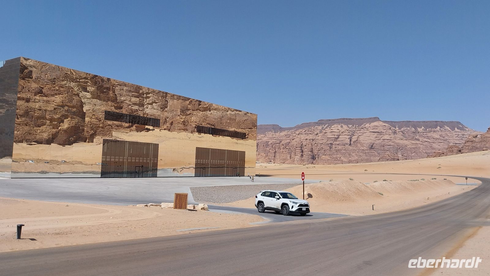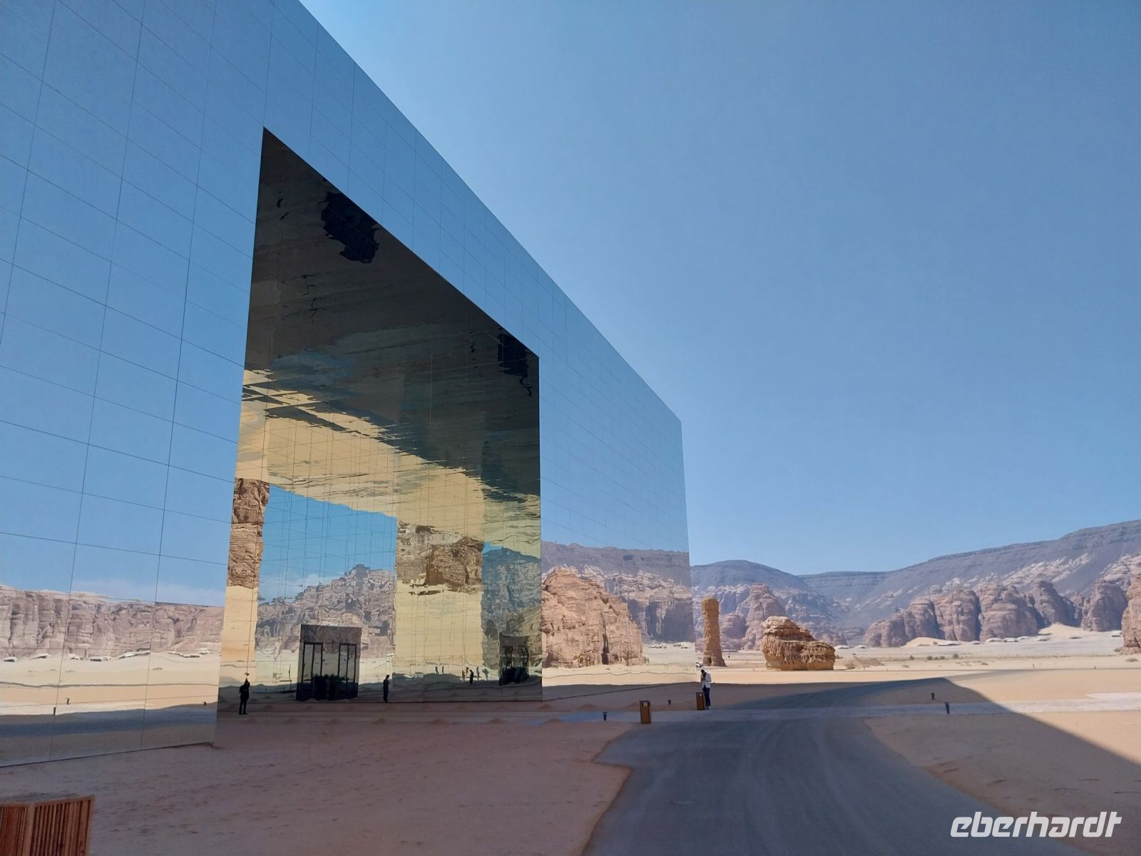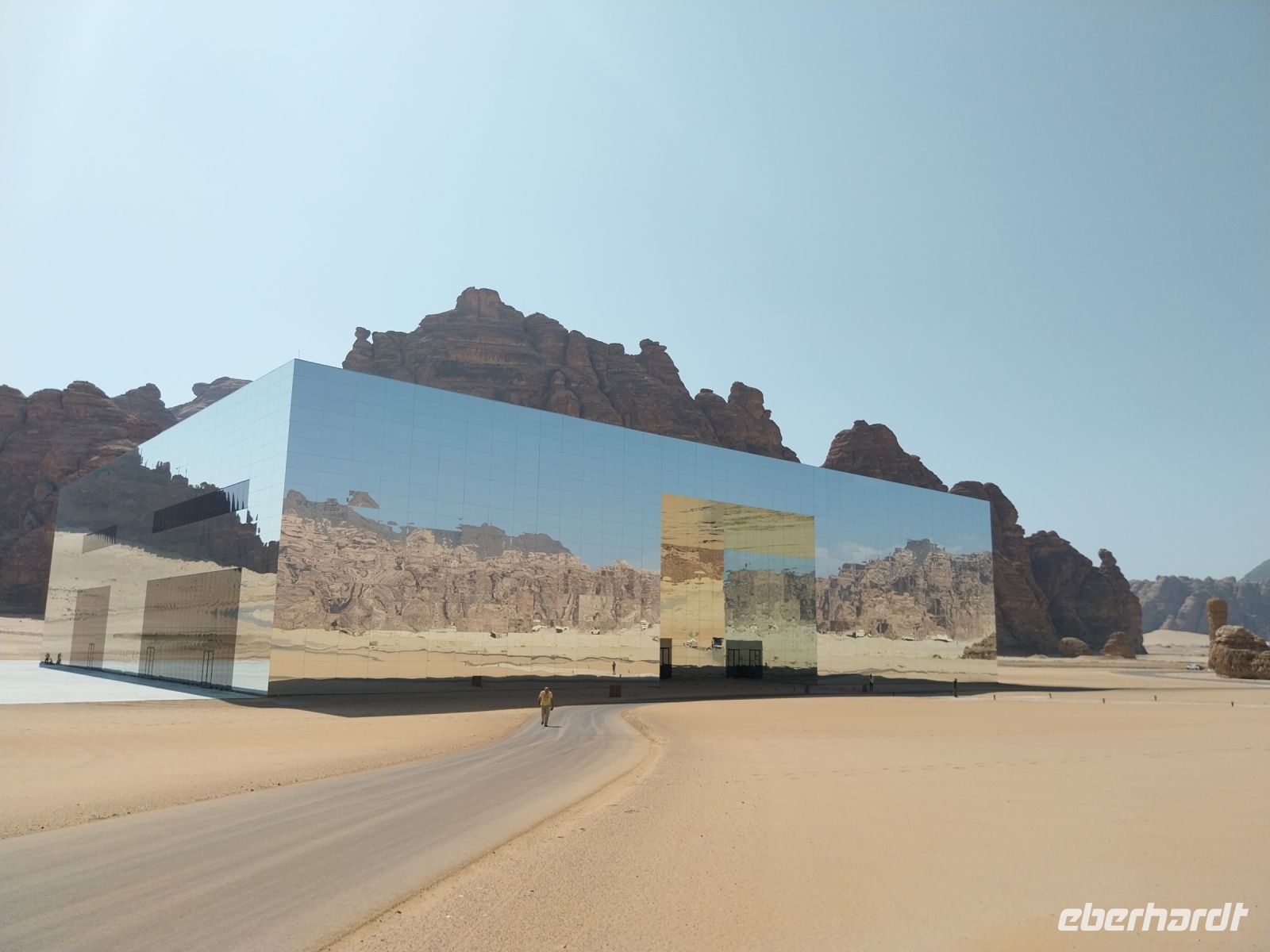 Anschließend begeben wir uns in ein Seitental der Al Ula Oase, in das landschaftlich wunderschöne Ashar-Tal. Die Saudis wünschten sich in dieser faszinierenden Kulisse einen Konzertsaal, ohne dass die Landschaft zerstört wird. Der ausgewählte italienische Architekt kam auf die Idee, die Fassade des Konzertsaals „Maraya“ zu verspiegeln. Je nach Standort ergeben sich für den Betrachter bei Maraya (arab. „Spiegel“) sehr interessante Perspektiven…eine tolle Idee. Nach diesem außergewöhnlichen Erlebnis bleiben wir noch im Ashar-Tal, um in einem der beiden Luxusressorts Mittag zu essen. Das Restaurant befindet sich am Pool, eingebettet in bizarre Felsen.