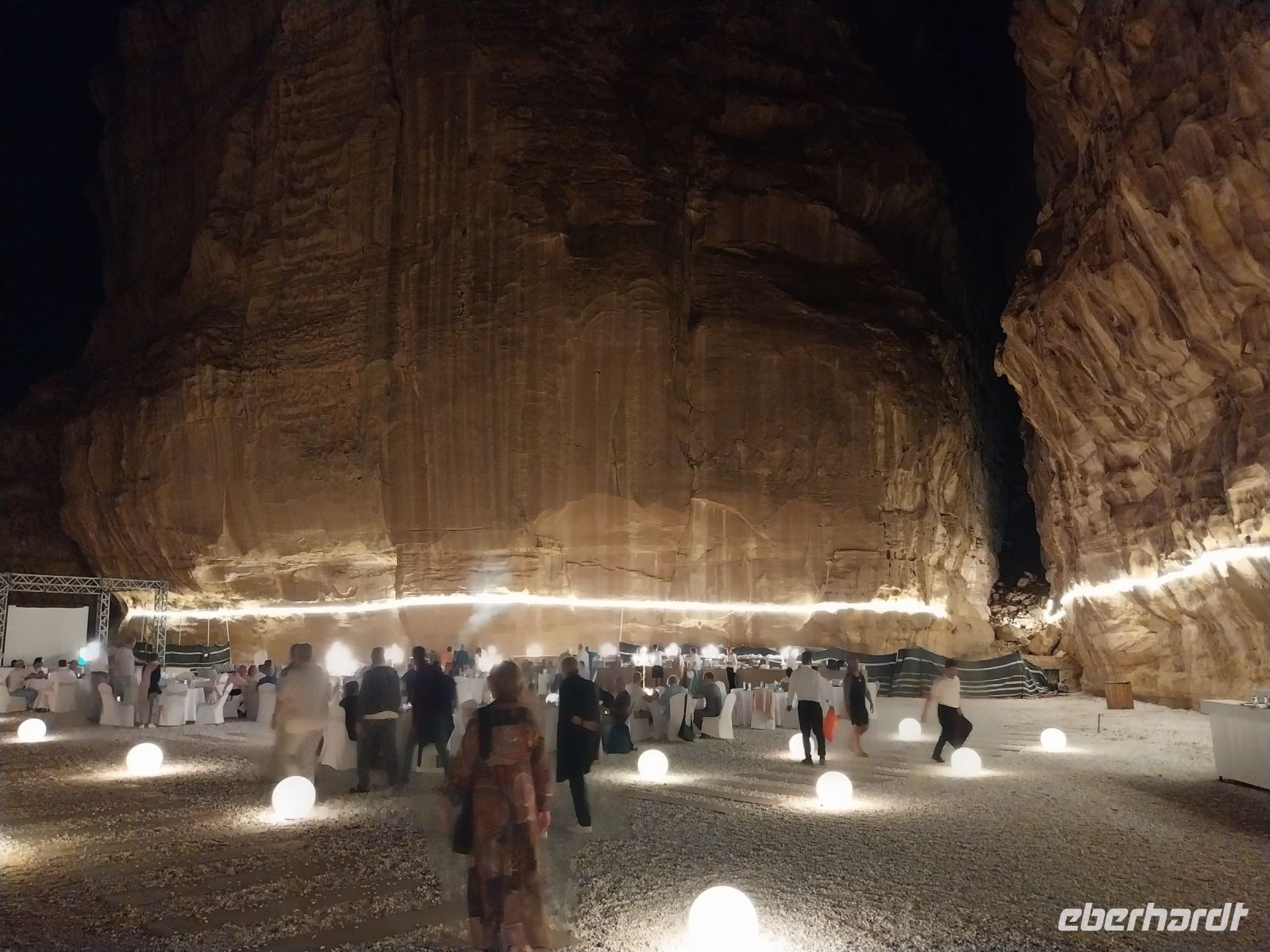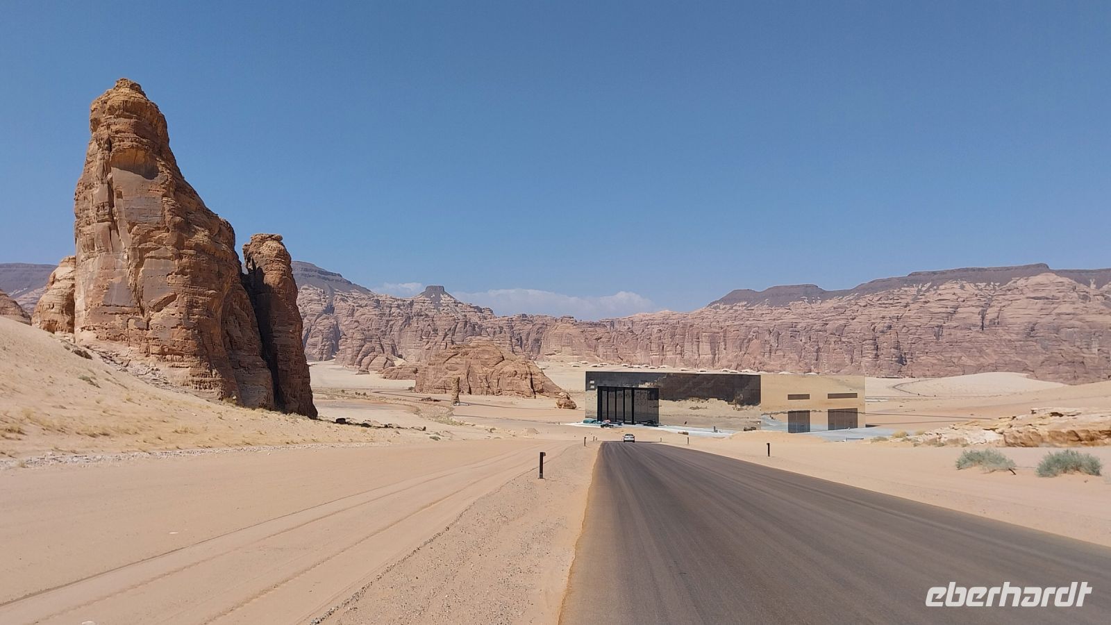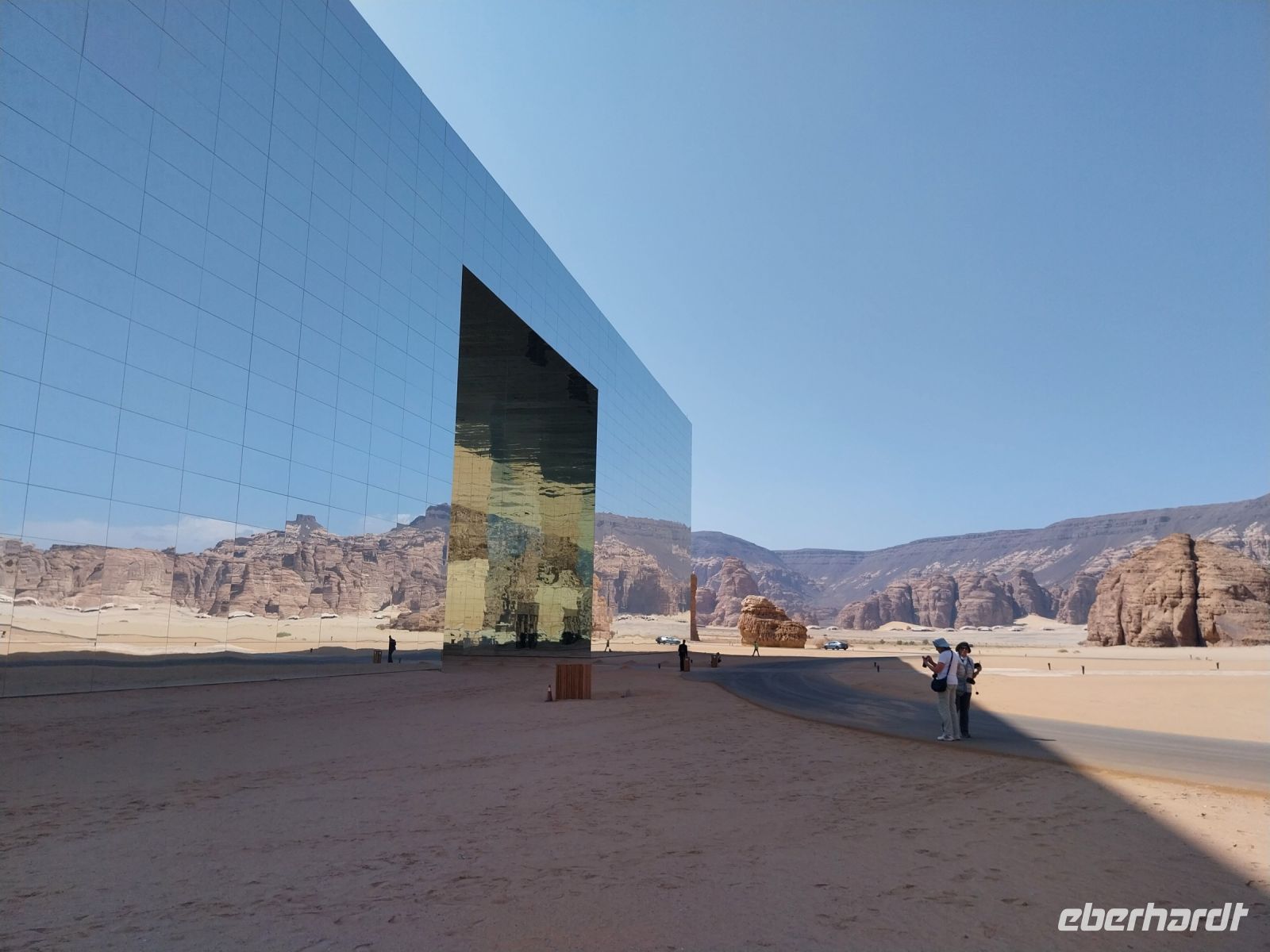 Anschließend begeben wir uns in ein Seitental der Al Ula Oase, in das landschaftlich wunderschöne Ashar-Tal. Die Saudis wünschten sich in dieser faszinierenden Kulisse einen Konzertsaal, ohne dass die Landschaft zerstört wird. Der ausgewählte italienische Architekt kam auf die Idee, die Fassade des Konzertsaals „Maraya“ zu verspiegeln. Je nach Standort ergeben sich für den Betrachter bei Maraya (arab. „Spiegel“) sehr interessante Perspektiven…eine tolle Idee. Nach diesem außergewöhnlichen Erlebnis bleiben wir noch im Ashar-Tal, um in einem der beiden Luxusressorts Mittag zu essen. Das Restaurant befindet sich am Pool, eingebettet in bizarre Felsen.
