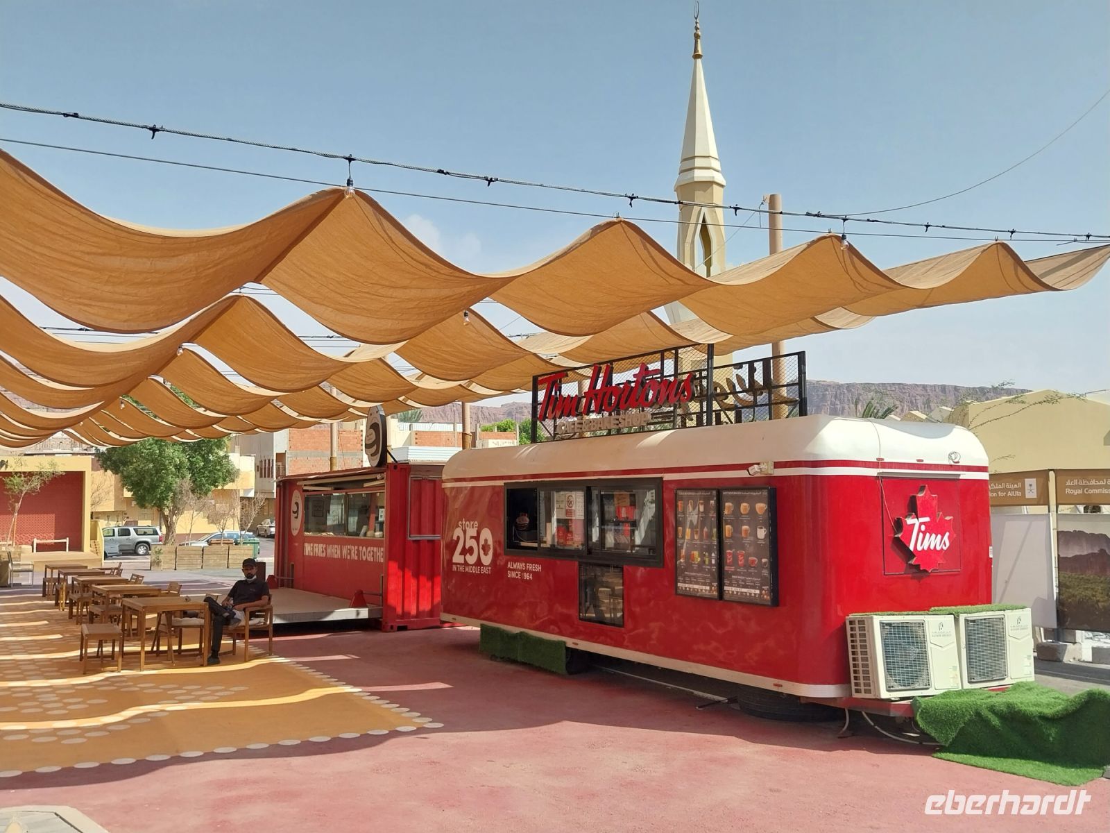 Heute Vormittag besichtigen wir einige der imposanten Monumentalgräber der Nabatäer von Mada´in Saleh (Hegra). Bevor wir mit anderen Besuchern in den Bus von Experience Al Ula einsteigen, lassen wir es uns im Besucherzentrum gut gehen. Hier gibt es kostenfreie Getränke und Naschereien und eine Souvenirshop, wo es sogar Postkarten angeboten werden.