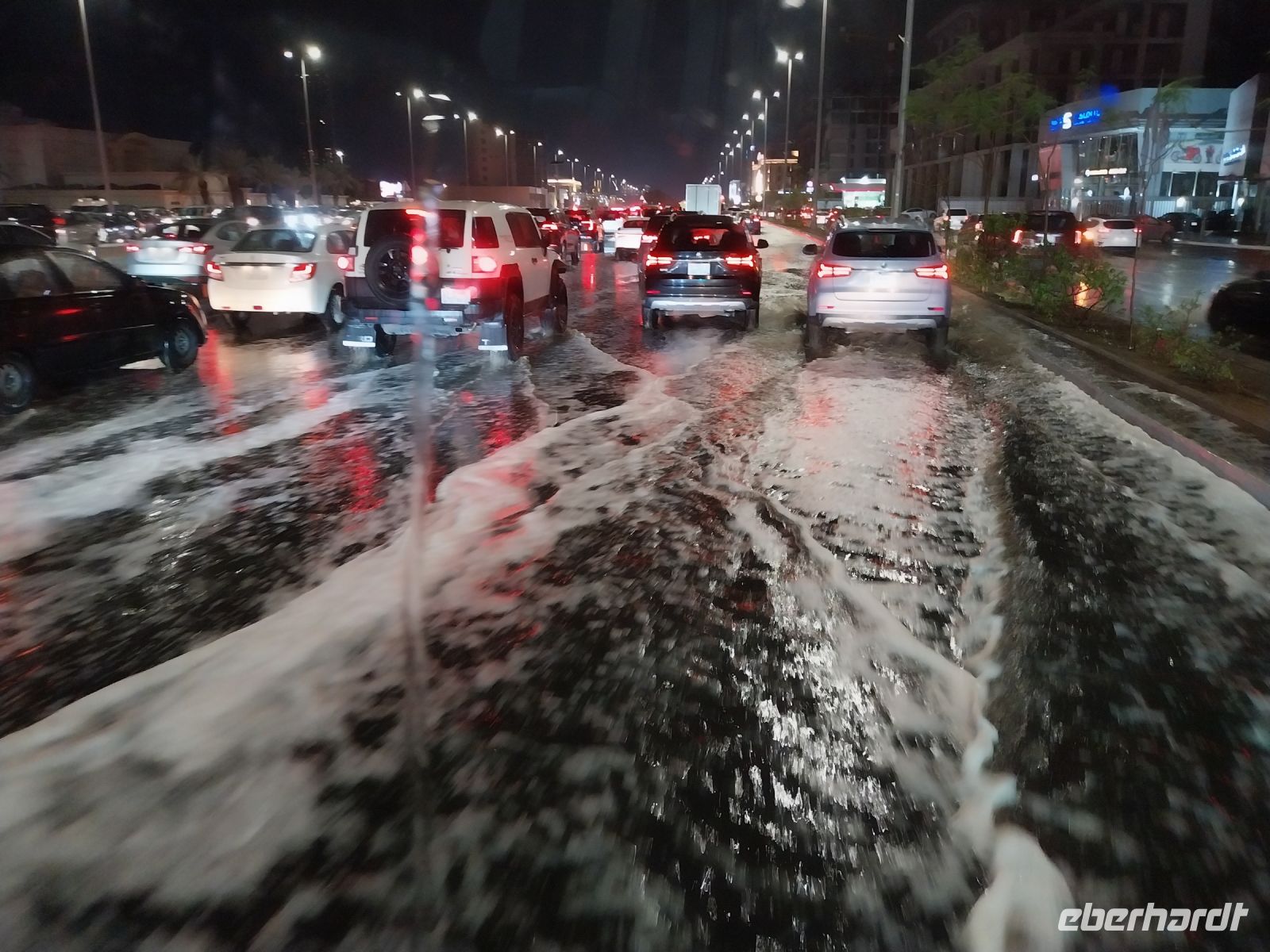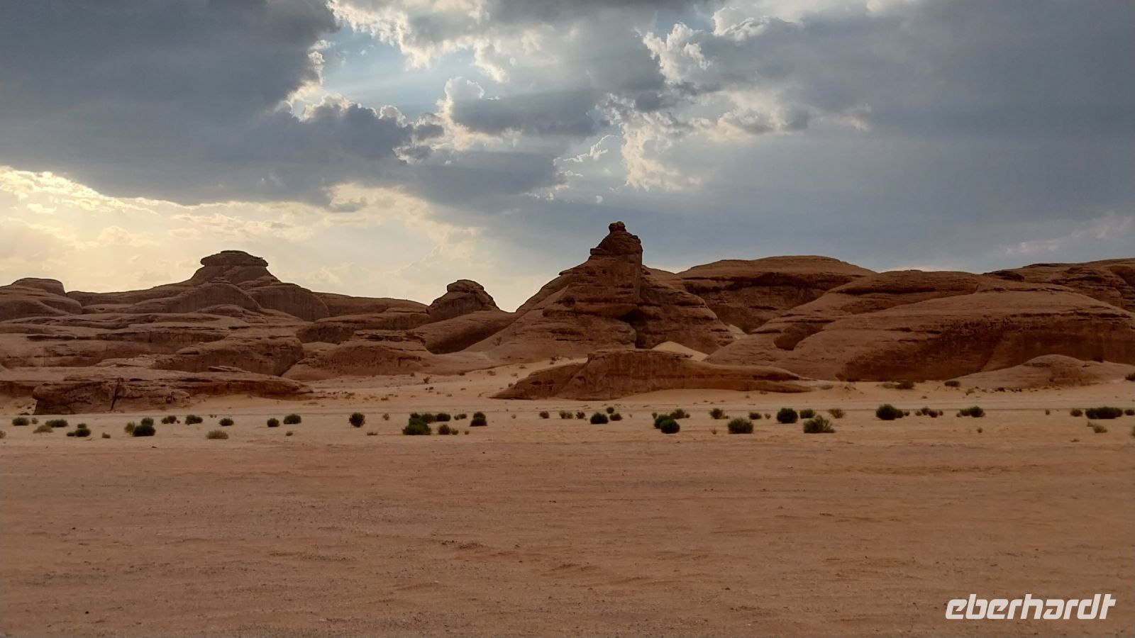 Nachmittags, während der Fahrt nach Al Ula erleben wir zwei Wetterphänomene: einen Regenschauer in der Wüste und einen Sandsturm, beides zum Glück lokal begrenzt. Als wir am Abend im Sahary Resort in Al Ula ankommen, ist das Wetter wieder freundlich.