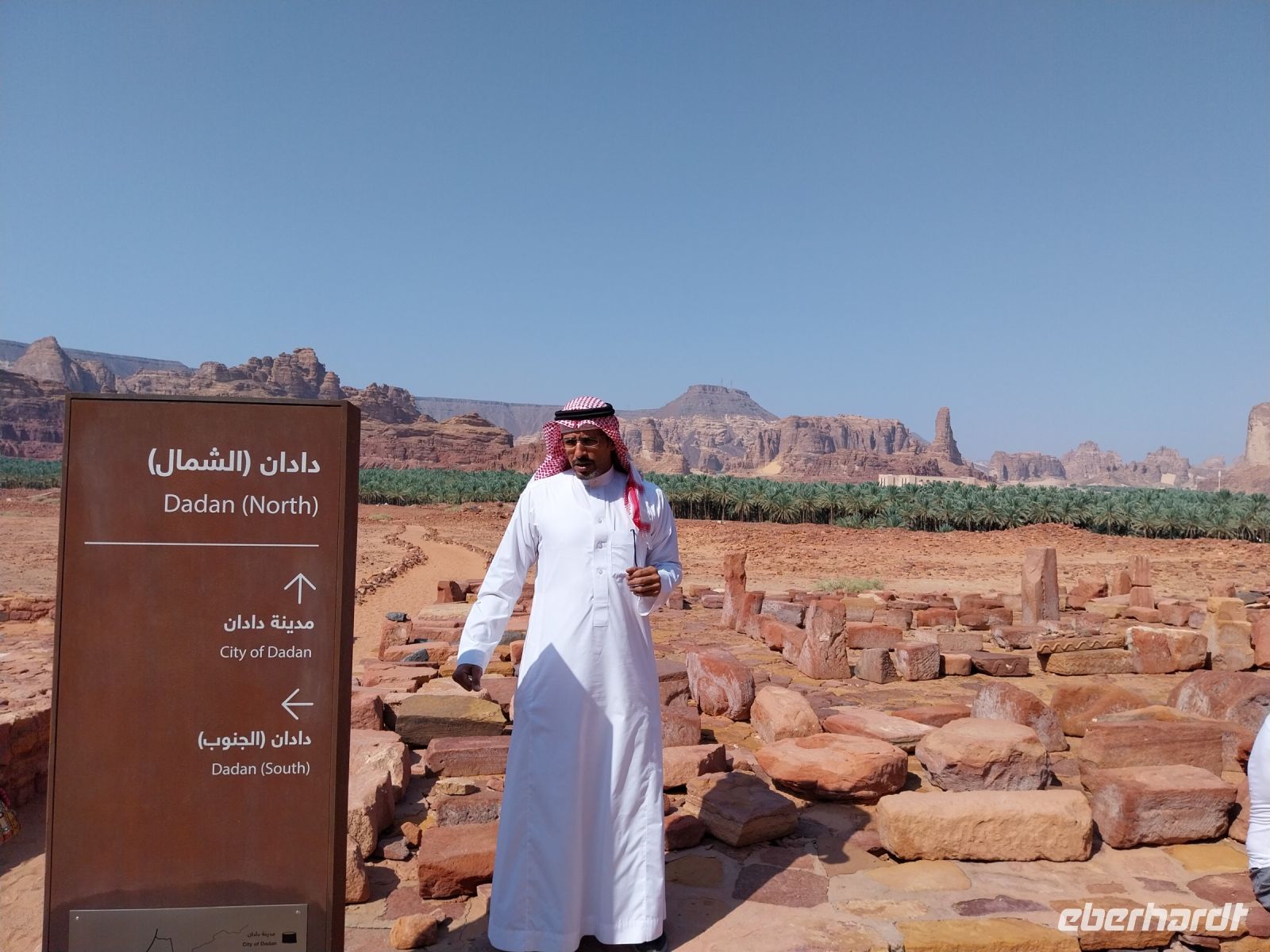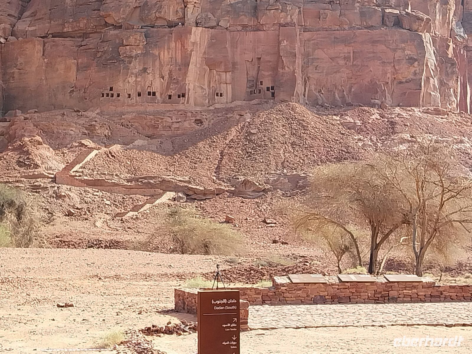 Ähnlich wie gestern, gibt es auch hier in Dadan ein Besucherzentrum, wo kostenfreie Getränke und kleine Naschereien angeboten werden. Das Wahrzeichen von Dadan, zwei Löwenreliefs über einem Felsengrab, ist schwer zugänglich, weshalb Ferngläser bereit liegen, um sie deutlich sehen zu können. Dadan bietet für Archäologen ein großes Betätigungsfeld. Bisher haben sie über 1.200 Gräber identifizieren können. An einer Stelle in Dadan finden gerade Ausgrabungen statt. Hier wurde ein Brunnen, ein Wasserspeicher, ein Tempel und Wohnbereiche freigelegt.
