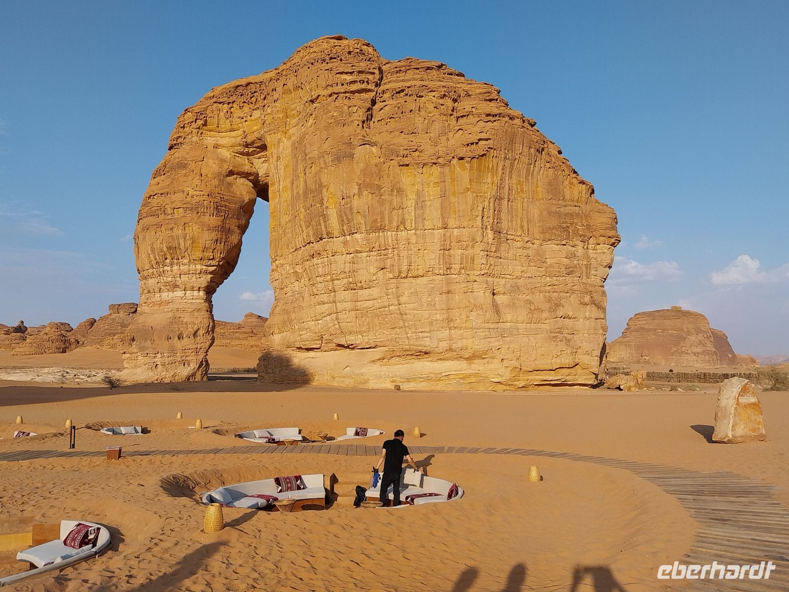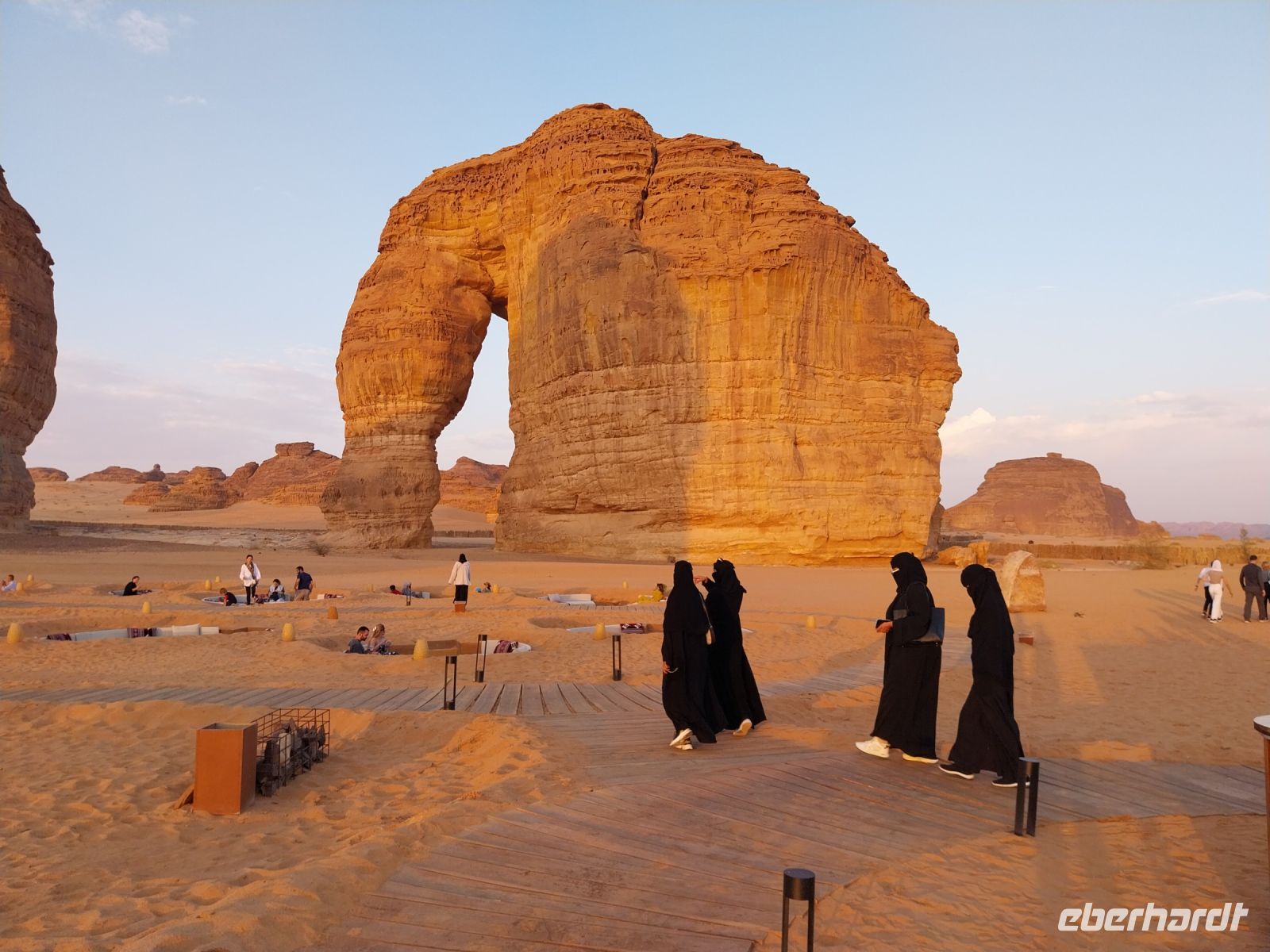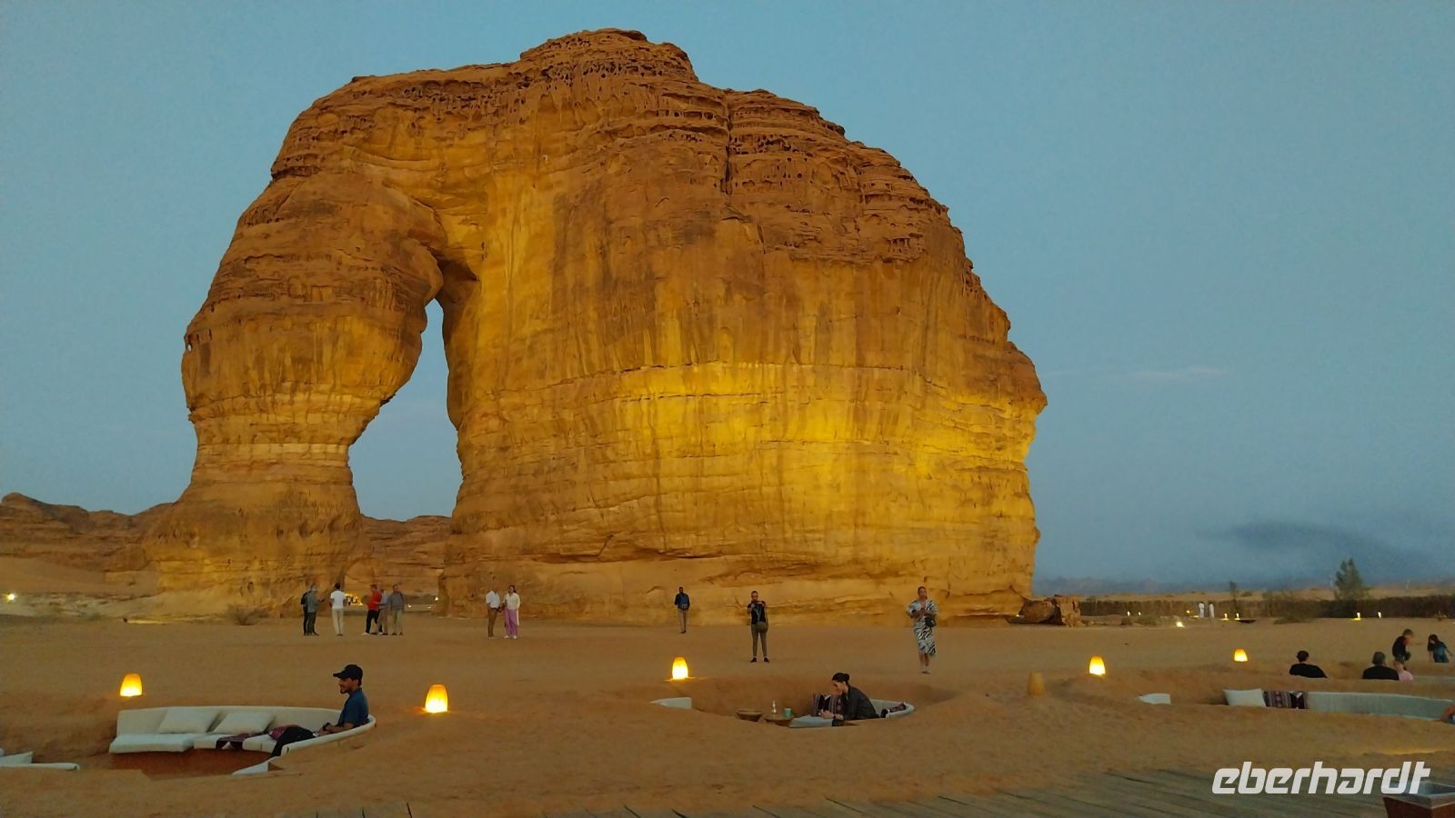 Den Rest des Nachmittags verbringen wir am sogenannten Elephant Rock, ein riesiger Fels in Form eines Elefanten und Wahrzeichen von Al Ula. Im Boden vor dem Elephant Rock gibt es originelle Sitzmöglichkeiten in kreisförmigen Vertiefungen, genug Platz für unsere kleine Gruppe. Wir erleben hier den Sonnenuntergang und später die abendliche Atmosphäre mit dezenter Beleuchtung.