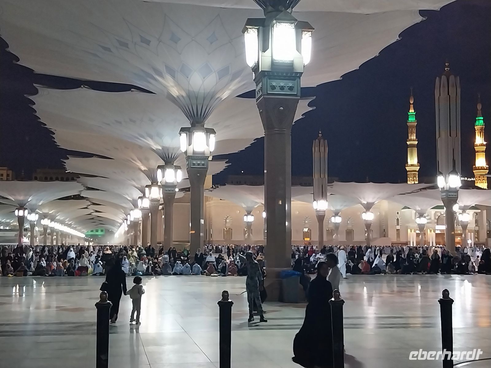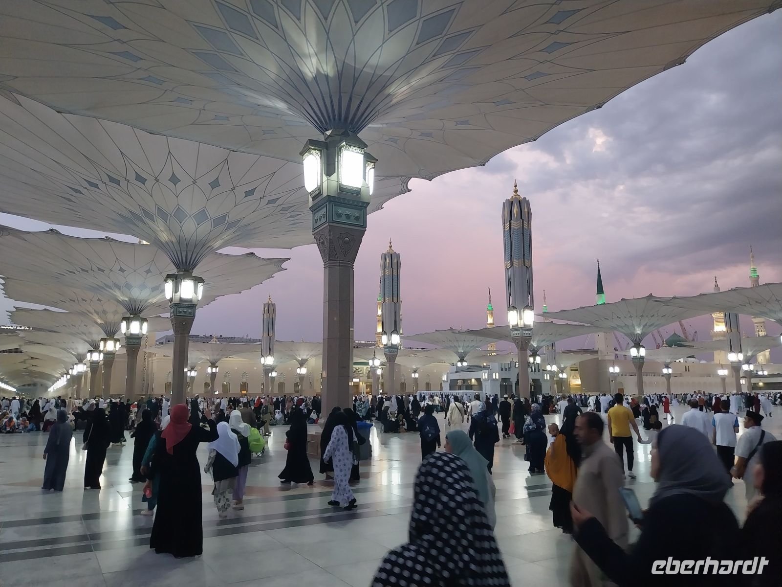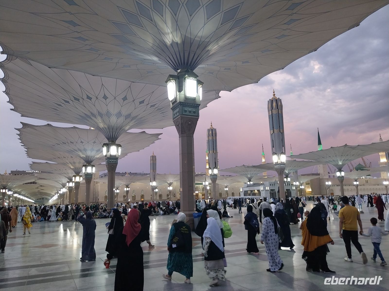 Nun nehmen wir uns ausgiebig Zeit für die Prophetenmoschee Masjid an Nabi. Wir befinden uns an jenem Ort, wo der Prophet Muhammad mit seiner ersten Gemeinde lebte und begraben ist. Es ist nach Mekka der heiligste Ort für Muslime. Noch vor kurzer Zeit war es undenkbar, dass man sich hier als Nichtmuslim aufhalten darf. Die Ausmaße der Masjid an Nabi sind unbeschreiblich. Die Prophetenmoschee bildet das Stadtzentrum und kann vom Betrachter als Ganzes nicht überblickt werden. Tausende von Pilgerreisenden und Muslimen strömen in die Moschee, denn gleich ist Sonnenuntergang und der Muezzin wird zum Abendgebet rufen, was für eine Atmosphäre! Aus gebührenden Abstand können wir das Abendgebet jener Muslime verfolgen, die sich auf dem Vorplatz der Moschee eingefunden haben. Noch eine Weile genießen wir die tolle Abendstimmung an der Moschee.