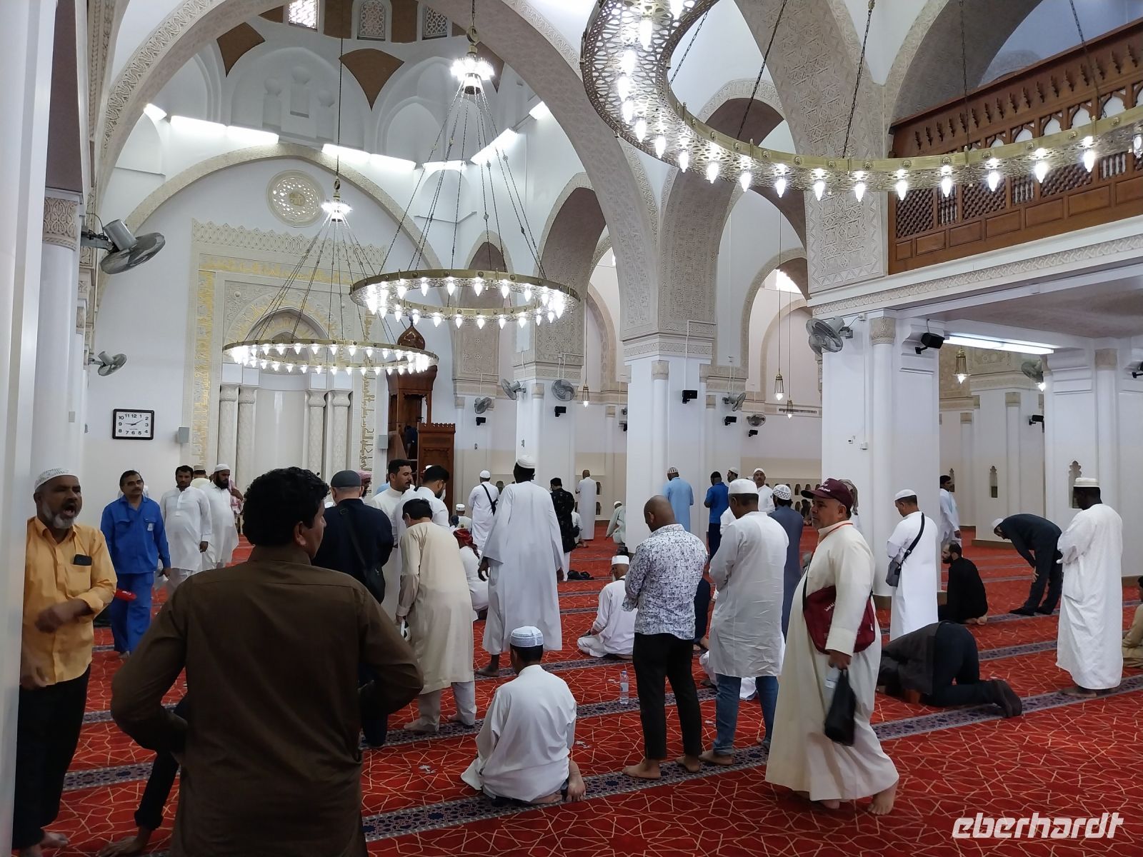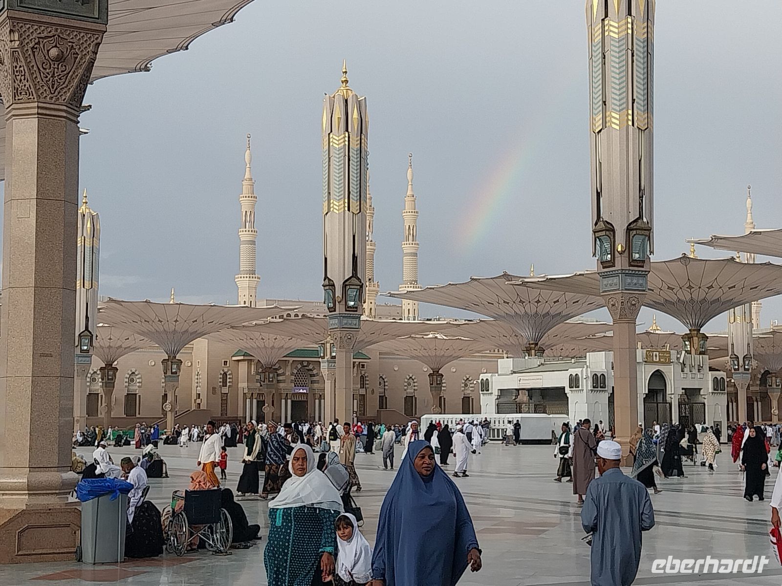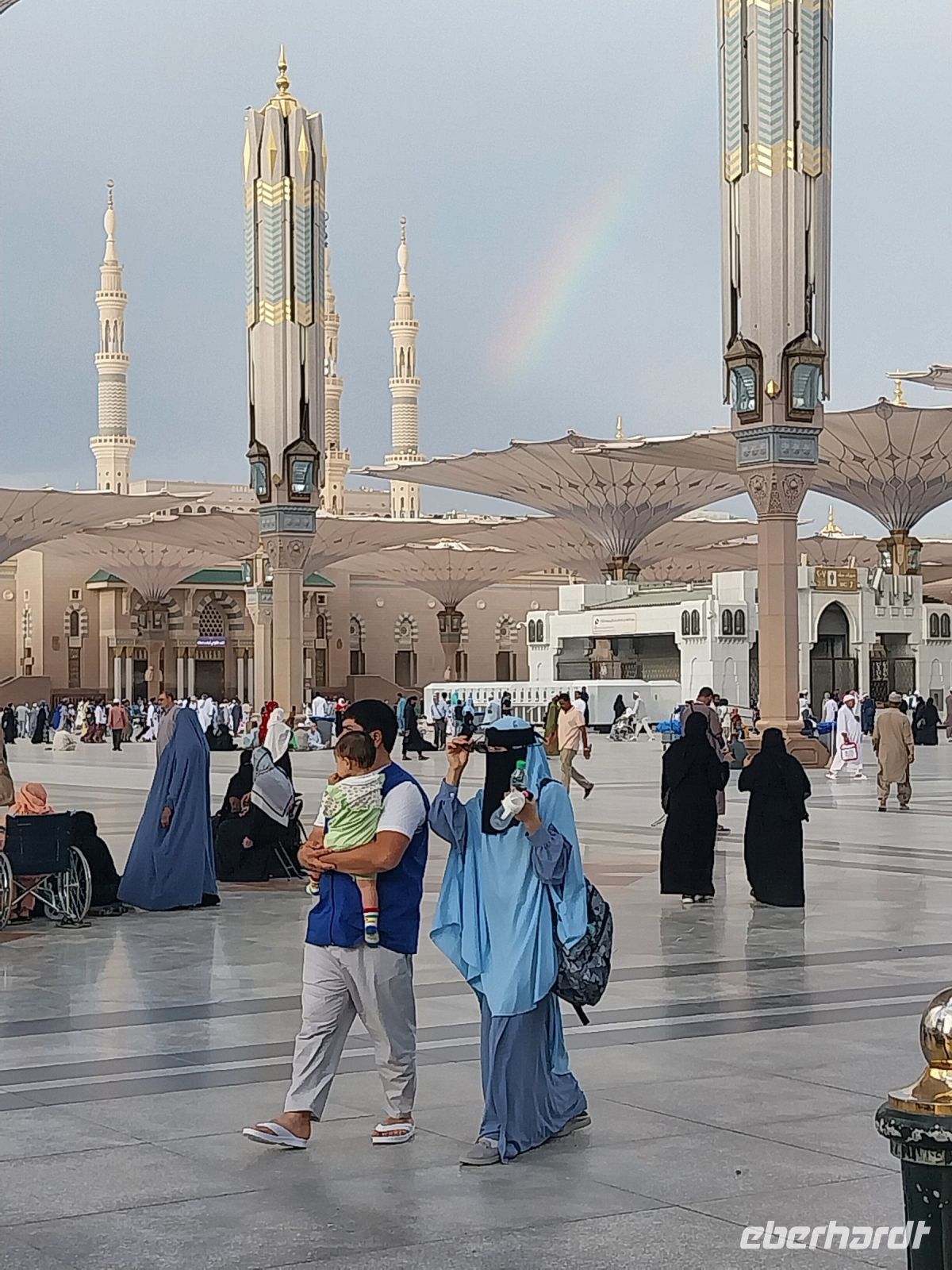 Nun nehmen wir uns ausgiebig Zeit für die Prophetenmoschee Masjid an Nabi. Wir befinden uns an jenem Ort, wo der Prophet Muhammad mit seiner ersten Gemeinde lebte und begraben ist. Es ist nach Mekka der heiligste Ort für Muslime. Noch vor kurzer Zeit war es undenkbar, dass man sich hier als Nichtmuslim aufhalten darf. Die Ausmaße der Masjid an Nabi sind unbeschreiblich. Die Prophetenmoschee bildet das Stadtzentrum und kann vom Betrachter als Ganzes nicht überblickt werden. Tausende von Pilgerreisenden und Muslimen strömen in die Moschee, denn gleich ist Sonnenuntergang und der Muezzin wird zum Abendgebet rufen, was für eine Atmosphäre! Aus gebührenden Abstand können wir das Abendgebet jener Muslime verfolgen, die sich auf dem Vorplatz der Moschee eingefunden haben. Noch eine Weile genießen wir die tolle Abendstimmung an der Moschee.