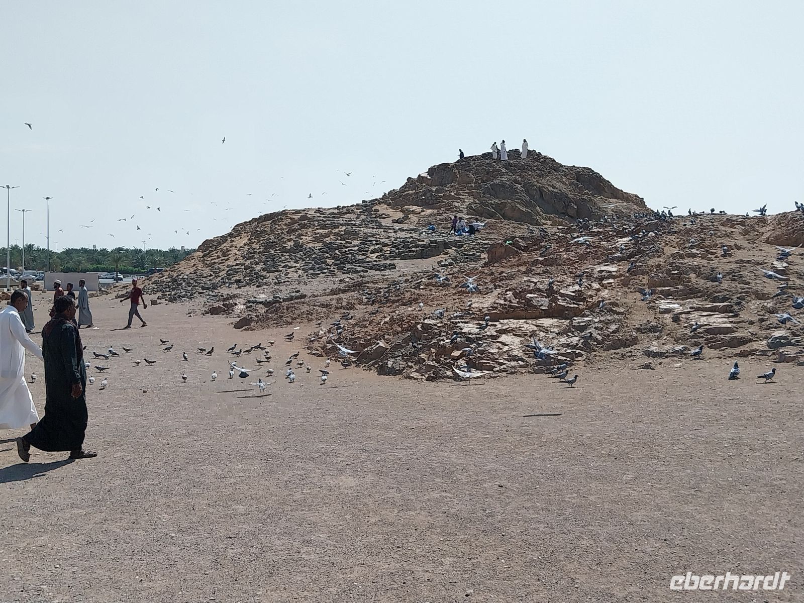 Auf der Fahrt nach Medina unternehmen wir einen Abstecher zur Altstadt von Khaibar. Hier lebten früher viele Juden und zu Lebzeiten des Propheten Muhammad gab es Spannungen zwischen ihnen und den Muslimen. Aktuell scheint es so, dass das für die Saudis ein sensibler Ort ist. Als wir fotografieren möchten, erscheint sofort Polizei. Ich spreche mit ihnen, sie meinen, fotografieren ist verboten, Gründe nennen sie (wie üblich in diesem Land) nicht. Aber wenn ich ein Erlaubnis vom König vorlege, ist das kein Problem…