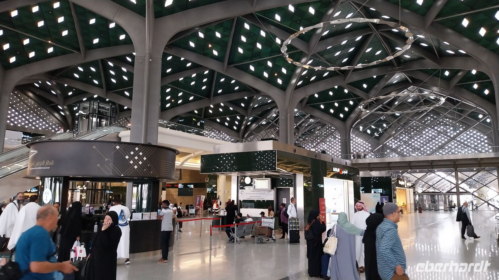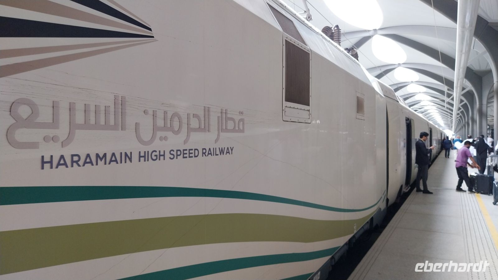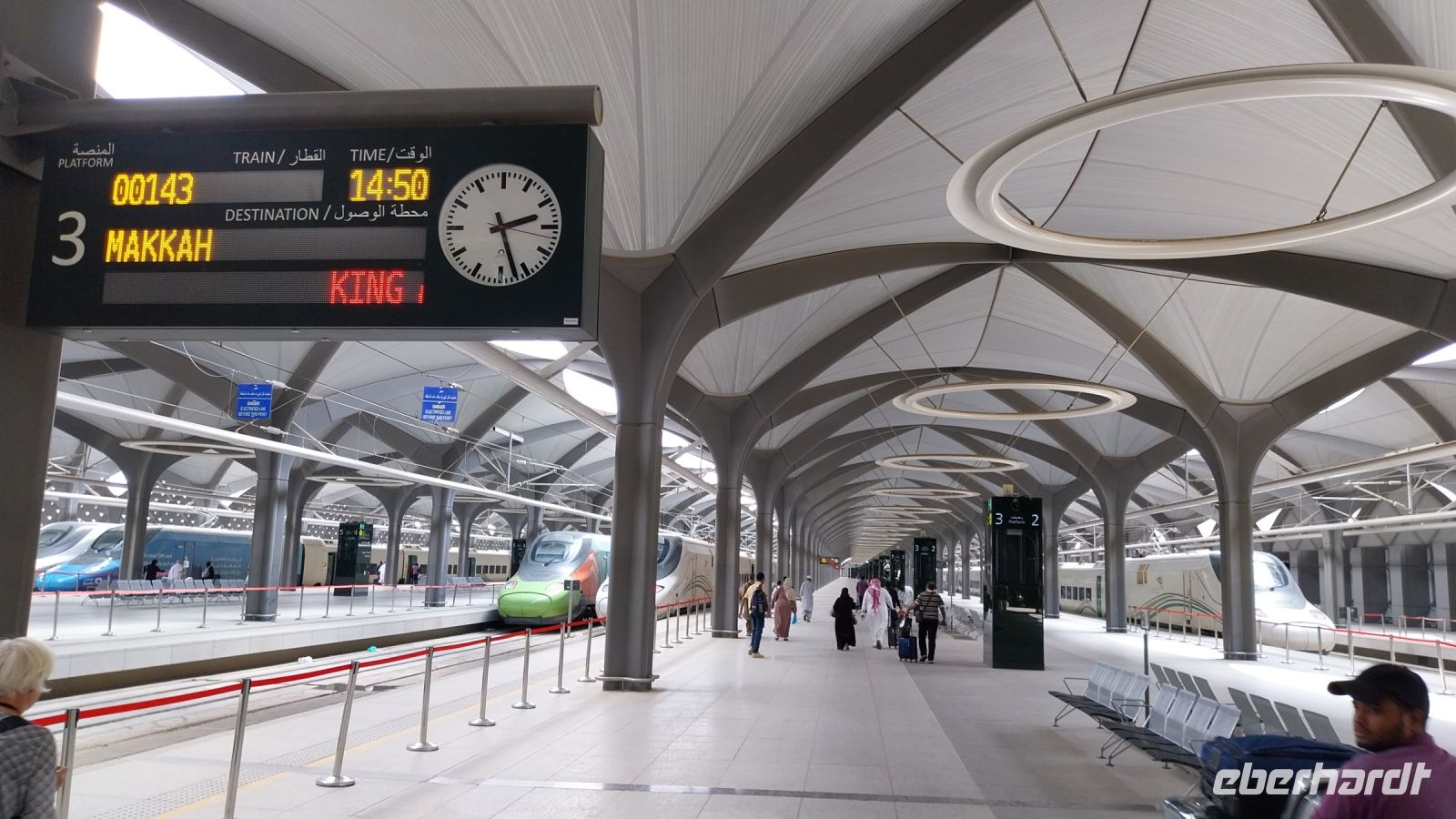 Es ist Freitag. Mittag steht das wichtigste muslimische Gebet der Woche an, deshalb sind die meisten Geschäfte und sonstige Einrichtungen zumindest bis mittags geschlossen. Glück haben wir, dass Starbucks geöffnet hat. Dann geht´s weiter zum Bahnhof, ein imposantes modernes Gebäude. Mit dem "Haramain High Speed Railway“ benötigen wir für die etwas mehr als 400 km lange Strecke nach Jeddah knapp zwei Stunden. Die Höchstgeschwindigkeit beträgt 300 km/h. „Haramain“ bedeutet „zwei Heiligtümer“, gemeint sind Mekka und Medina. Der Zug verbindet diese beiden wichtigsten islamischen Stätten. So befinden sich in unserem Zug auch viele Pilgerer, welche nach Mekka weiter fahren. Sie sind leicht an den zwei weißen Baumwolltüchern, welche sie tragen, zu erkennen.