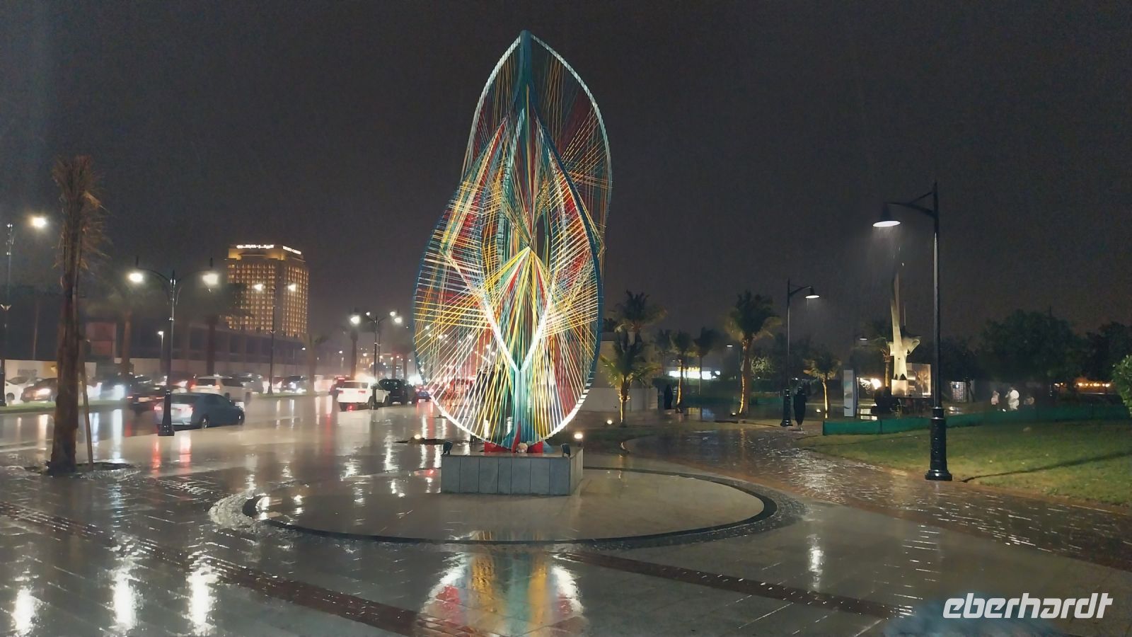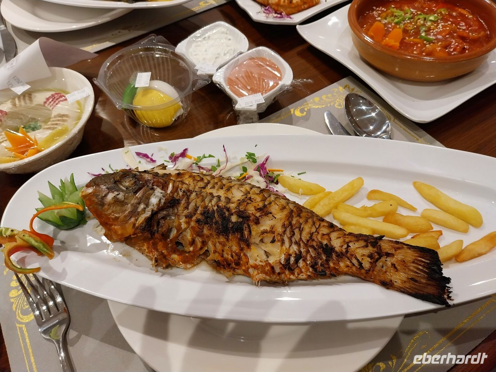 Am Bahnhof in Jeddah kommt uns die schwül heiße Luft entgegen. Das ist Jeddah. Eldou fährt uns erst einmal ins Hotel. Abends wollen wir noch einmal los, zur Fontäne und einem Fischrestaurant am Rande der Stadt. Doch das Wetter hat etwas dagegen. Gerade als wir uns die welthöchste Fontäne ansehen wollen, wird sie aufgrund starker Sturmböen abgeschaltet. Den Sturmböen folgen Gewitter und Regen, was wiederum zu langen Staus auf den Straßen führt. So brauchen wir eine gefühlte halbe Ewigkeit bis zum Fischrestaurant. Das Abendessen selbst ist sehr schmackhaft, es gibt Papageifisch und gegrillte Riesengarnelen.