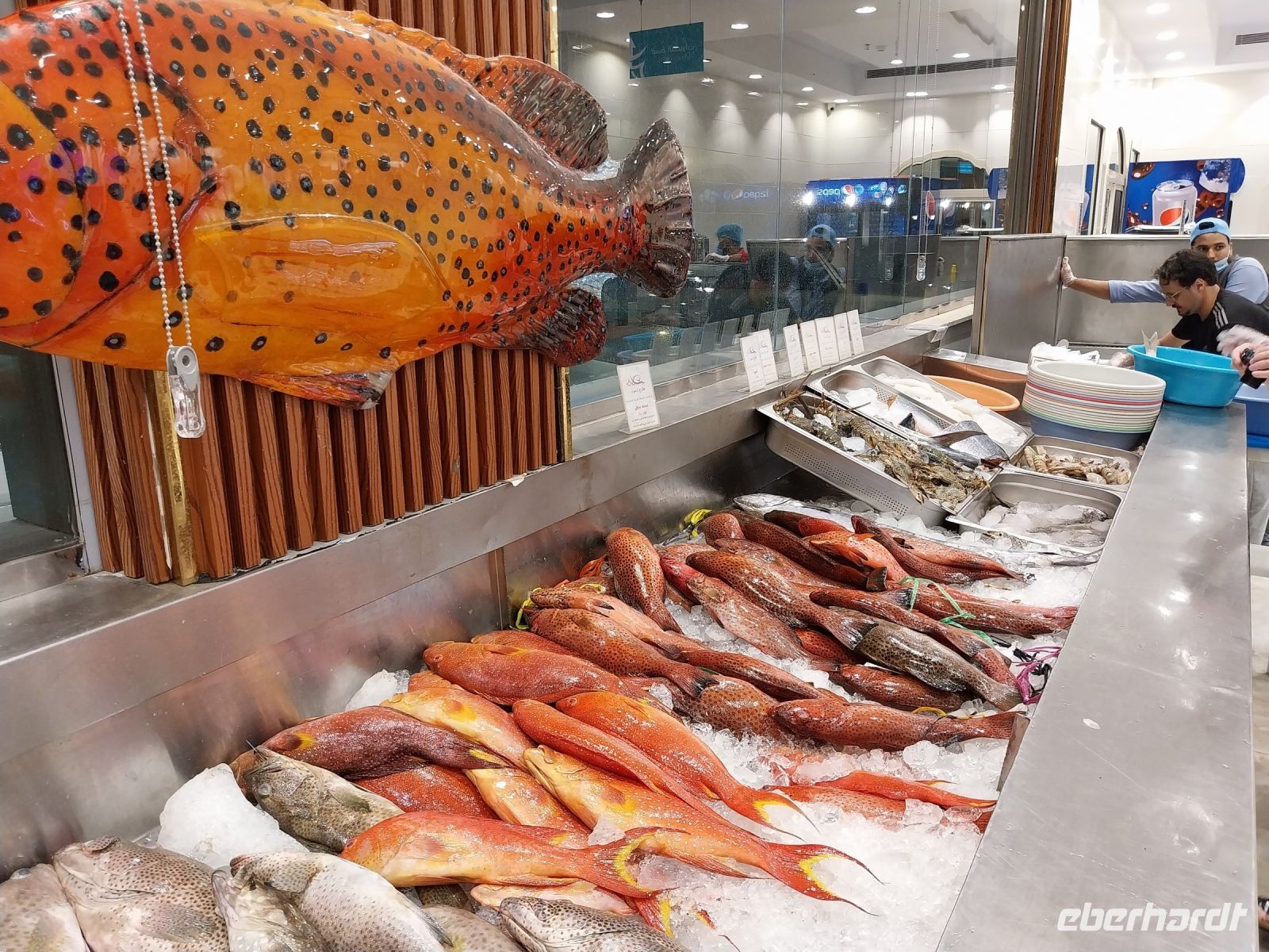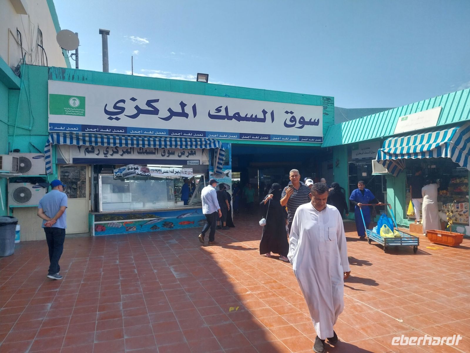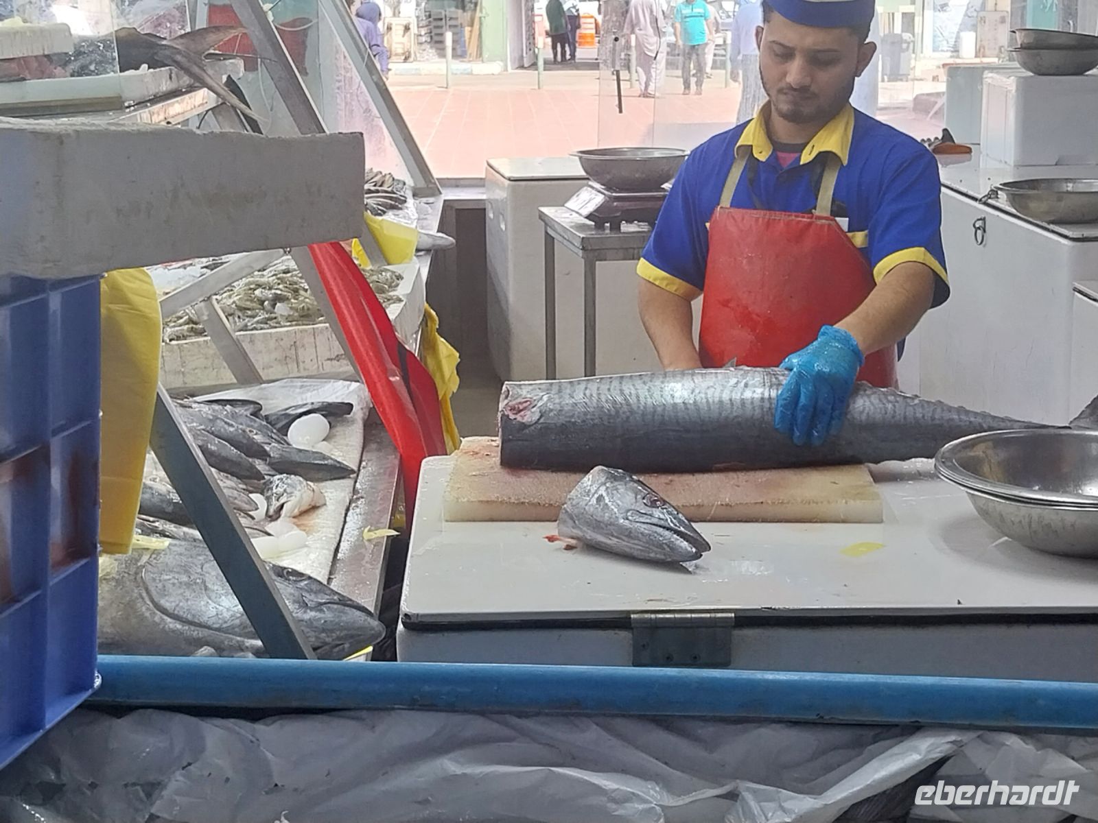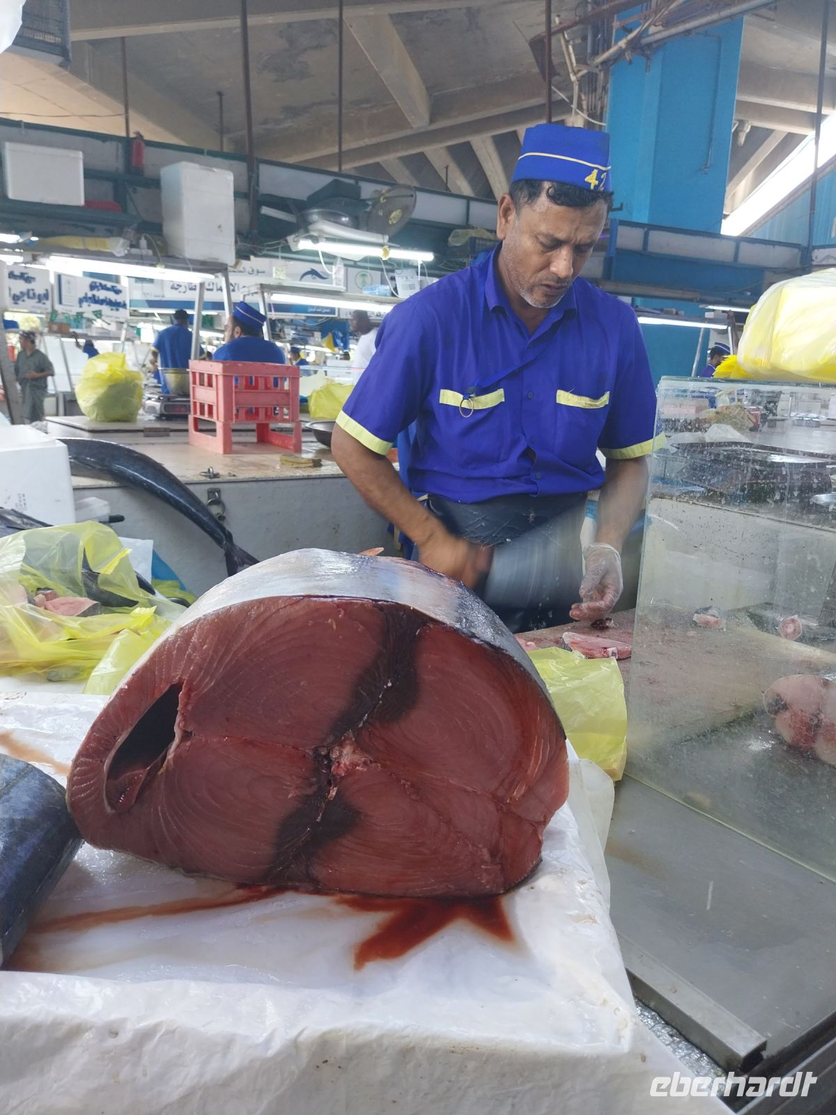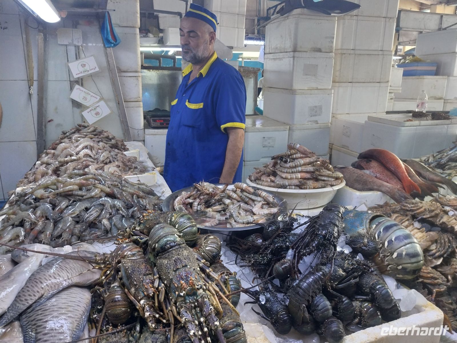Auf dem Weg zur Corniche legen wir einen Halt am Fischmarkt ein. Auf dem Markt herrscht den ganzen Tag geschäftiges Treiben. Wir können zwei Fischauktionen verfolgen. Und wir suchen nach Papageifischen – weil wir gestern welche gegessen hatten, wollen wir sehen, wie sie aussehen.