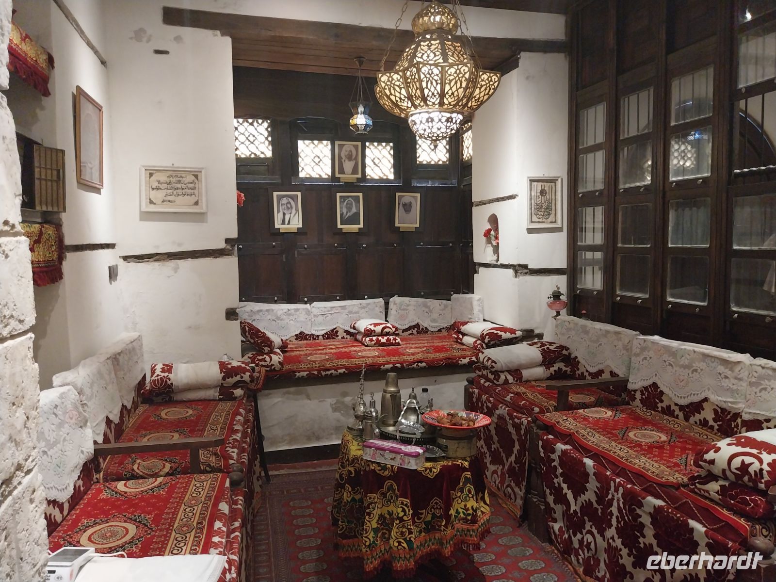 Nach einem Blick in eine Gemäldesammlung mit historischen Motiven der Region legen wir einen Halt im Museum Bait Salum ein. Es handelt sich um ein renoviertes historisches Altstadtgebäude. Wir werden typisch mit arabischem Kardamomkaffee und Datteln begrüßt, bevor wir uns die verschieden Räume ansehen.