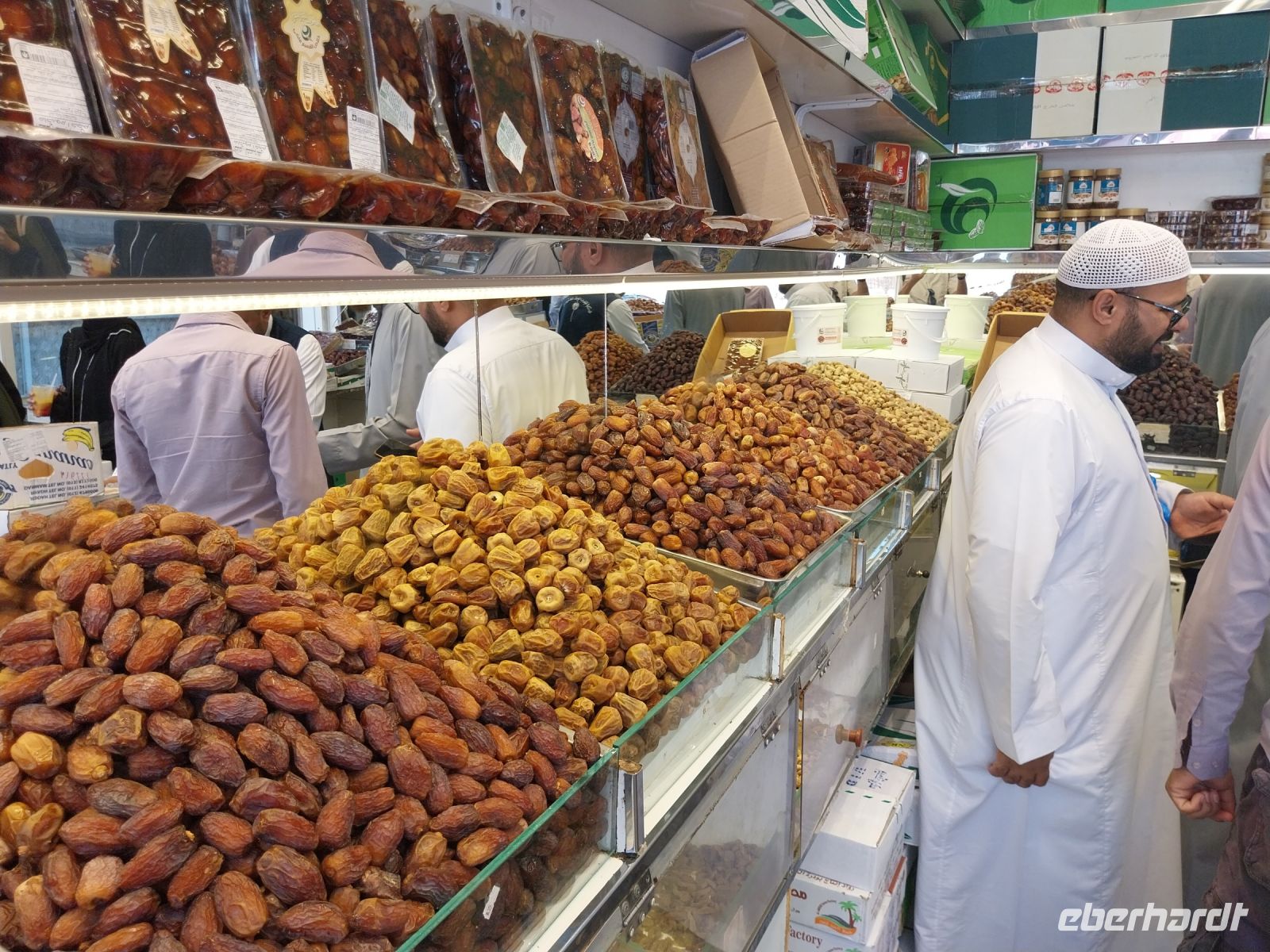 In Medina angekommen, checken wir zunächst im Hotel ein, weil ich bis in die Abendstunden in der Innenstadt mit Euch unterwegs sein möchte. Auf dem Weg zur Prophetenmoschee halten wir am Dattelmarkt. Hier gibt es unzählige Sorten und man natürlich auch gern probieren. Als wir aufbrechen wollen, kommen drei Busse mit Pilgerreisenden aus Usbekistan an. Jetzt wird es im Laden voll und wir können weiterziehen.