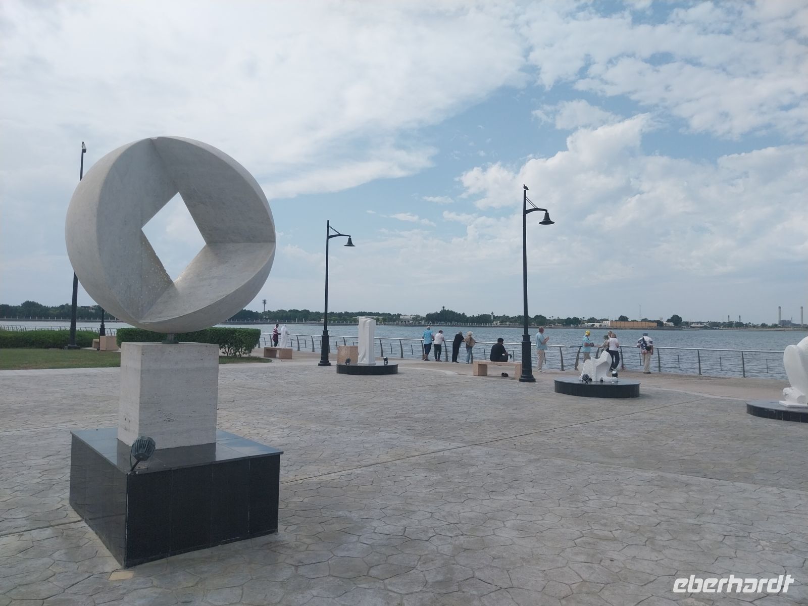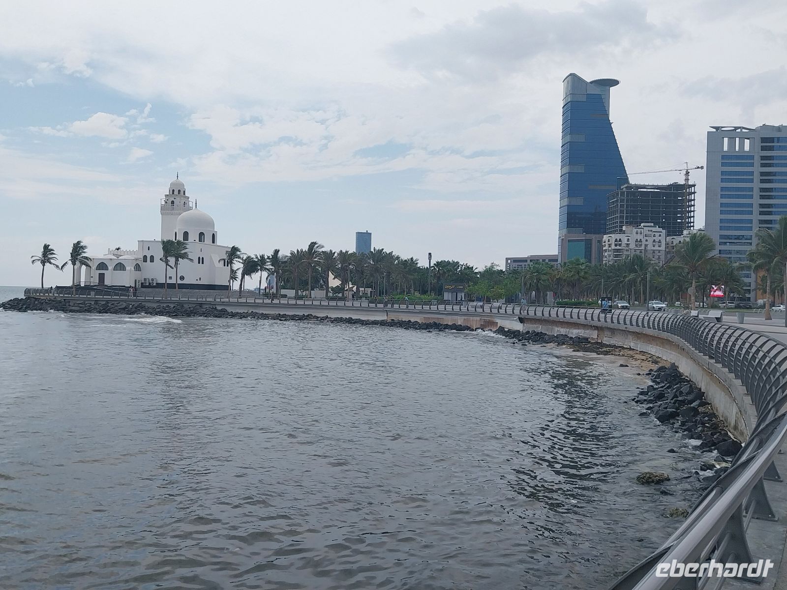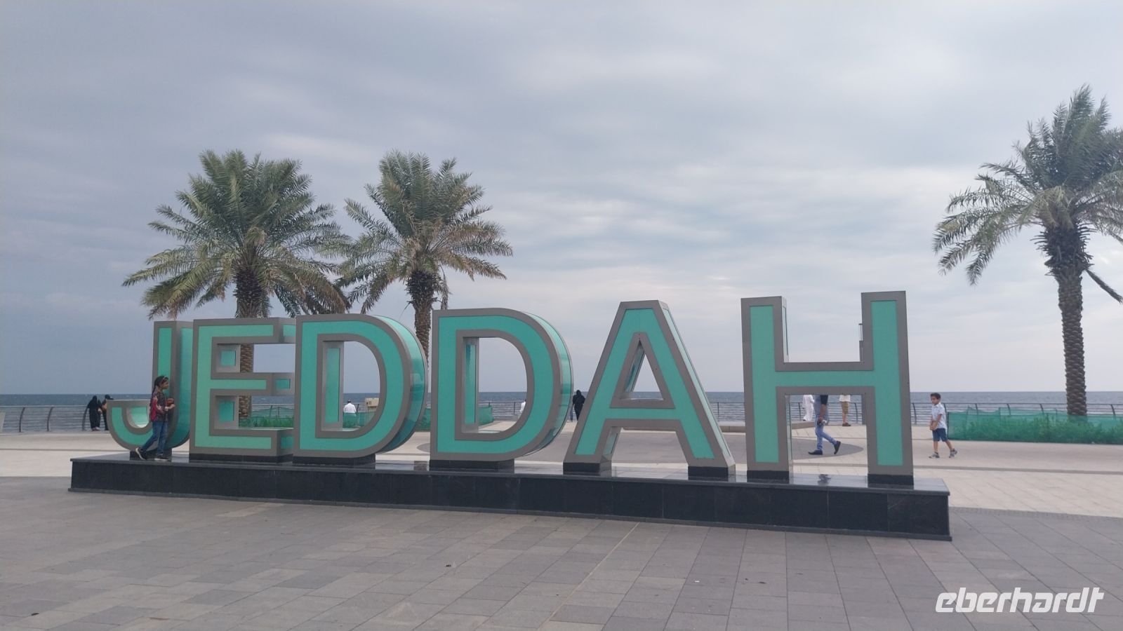 Nach einem Fotostopp am Skulpturenpark fahren wir weiter zur weiter nördlich gelegenen Corniche. Ich bin vor zwei Jahren diese Corniche über mehrere Kilometer abgelaufen und möchte nun an einen schönem Abschnitt der Strandpromenade halten. Von der Island Mosque (arab. Masjid alwajiha albahriya = die dem Meer zugewandte Moschee) wandern wir die Strandpromenade bis zum riesigen Schriftzug JEDDAH, der sich natürlich für ein gemeinsames Foto anbietet.