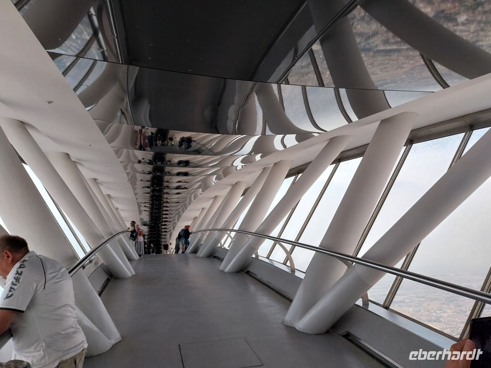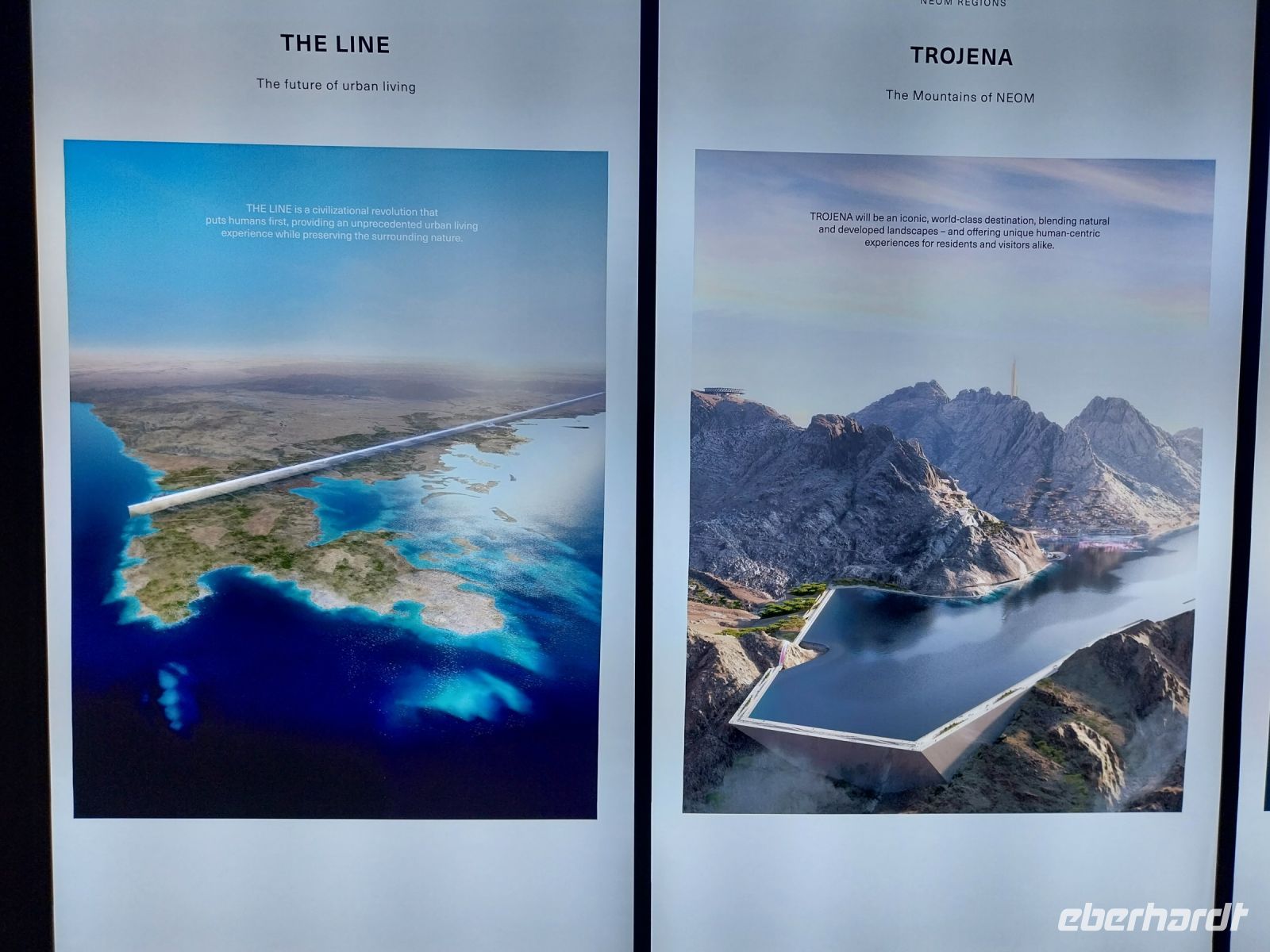 Nach einem Blick in die jüngere Geschichte der Saudis folgt ein Blick in die Zukunft – als Überraschung für heute besuchen wir „The Line Experience“. Bei „The Line“ handelt es sich um das ambitionierteste Projekt Saudi Arabiens. Im Rahmen des Neom-Projektes soll The Line eine 170 km lange, 200 Meter breite und bis 500 Meter hohe Stadt werden. Von außen ist The Line vollständig nach dem Vorbild von Maraya verspiegelt. Wir bestaunen die Ausstellung mit Staunen, Kopfschütteln, Fragen, Zweifeln… Unter dem Motto „Neue Wunder für die Welt“ soll diese Zukunftsstadt für 9 Millionen Menschen frei von Autos, Straßen und Emissionen sein. Ihre Energieversorgung soll zu 100% auf erneuerbaren Energien basieren. Bei Energie fällt mir ein, dass nach dem Verständnis hier Atomkraft als erneuerbare Energie betrachtet wird und Saudi Arabien bis 2040 dutzende Atomkraftwerke bauen will….The Line bietet jedenfalls viel Gesprächsstoff und egal ob man Optimist, Visionär, Realist, Bedenkenträger oder Pessimist ist – es wird spannend was die Zukunft bringen wird.